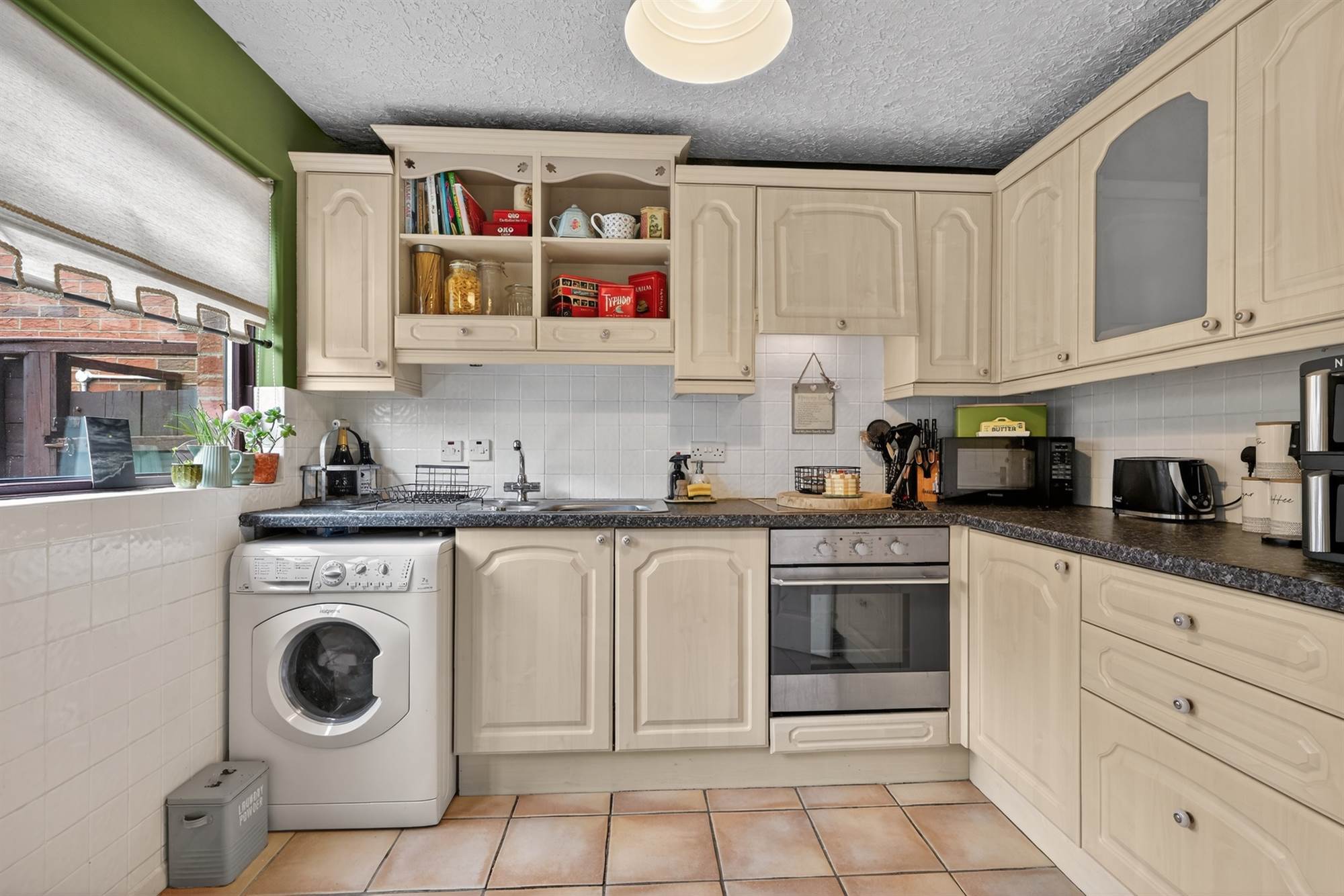 Range of high and low level units, lamiante worktops, stainless steel single drainer sink unit with chrome tap, space for washing machine, integrated ceramic hob with integrated oven and grill below, extractor fan above, tiled floor, tiled walls. Integrated fridge/freezer. Hardwood double glazed access door to rear garden.