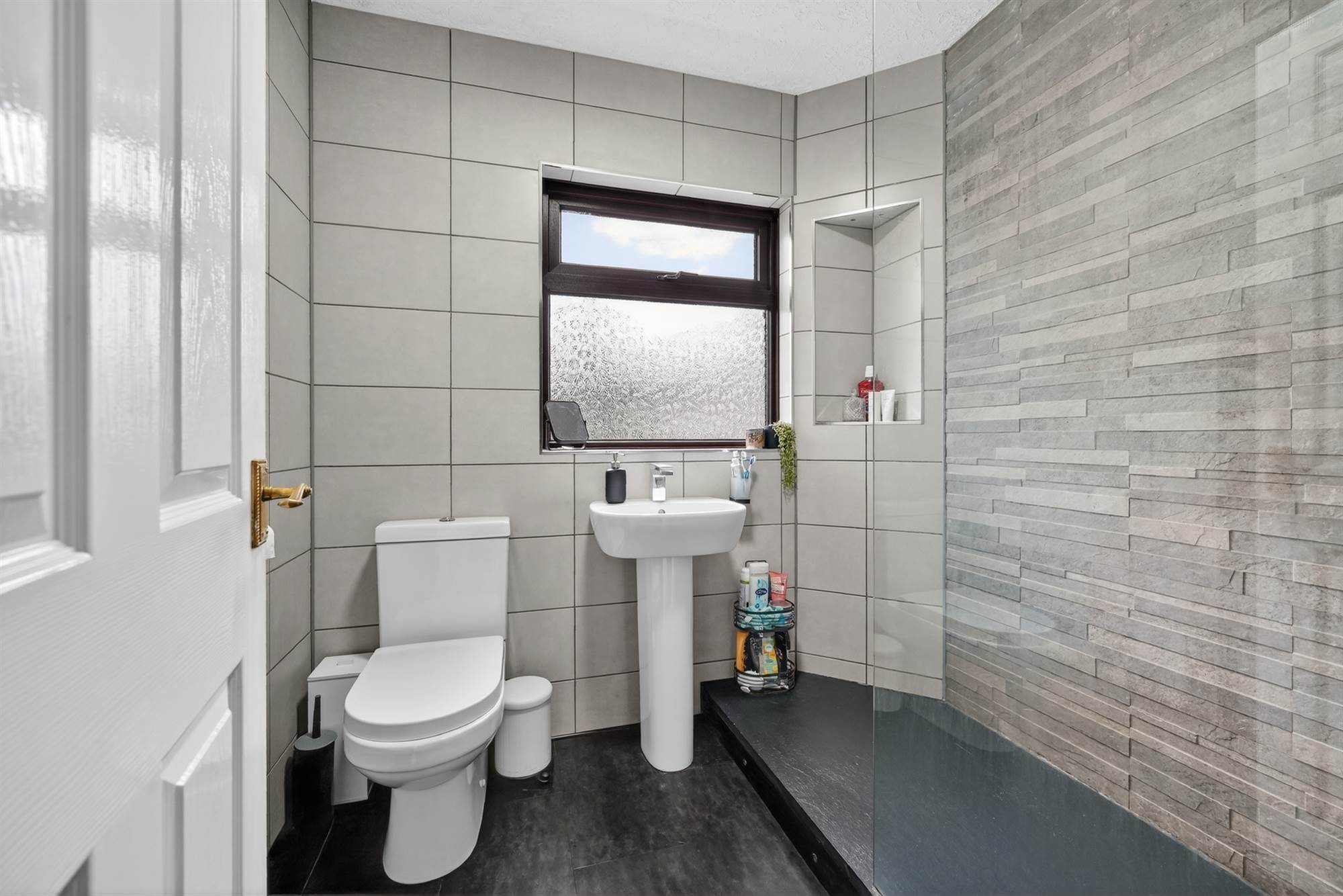 White suite comprising low flush wc with push button, pedestal wash hand basin with chrome mixer tap, walk-in shower with fixed glass door and drying area, electric shower with telephone attachment and rain head shower, fully tiled walls, tiled floor, heated towel rail.