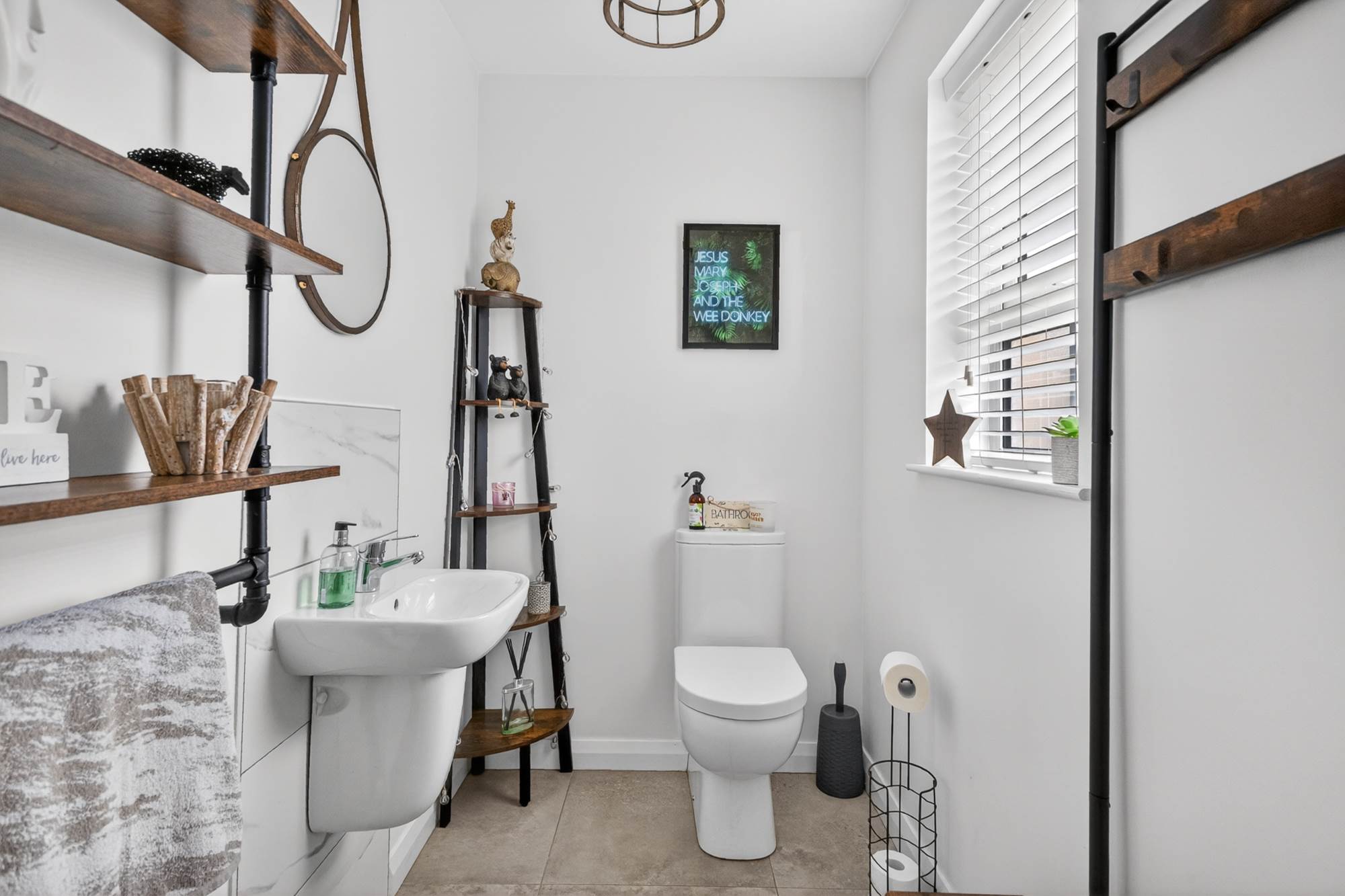 Low flush WC, pedestal wash hand basin with mixer tap, ceramic floor, extractor fan.