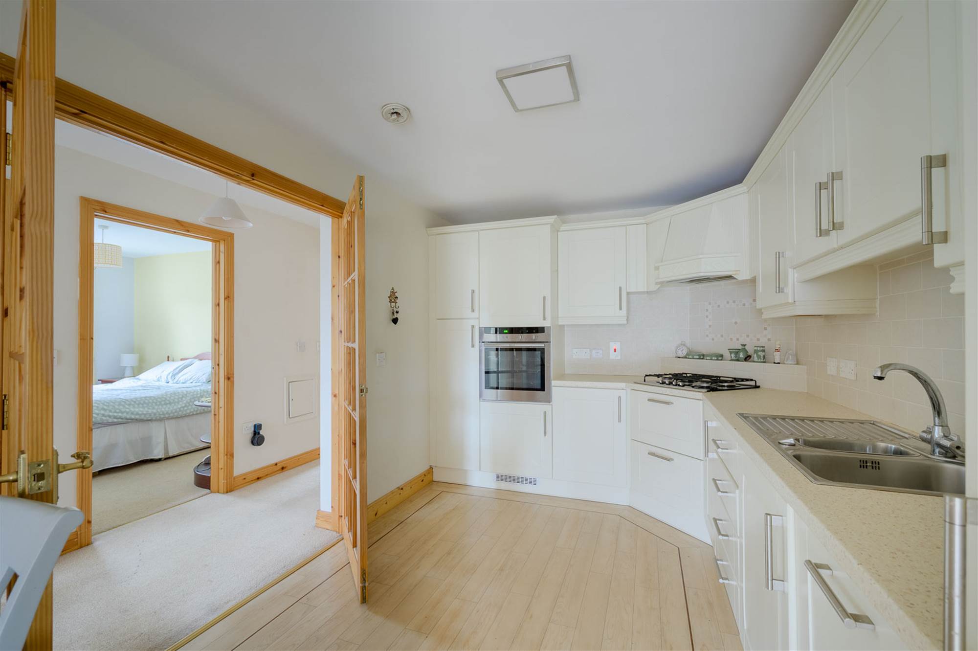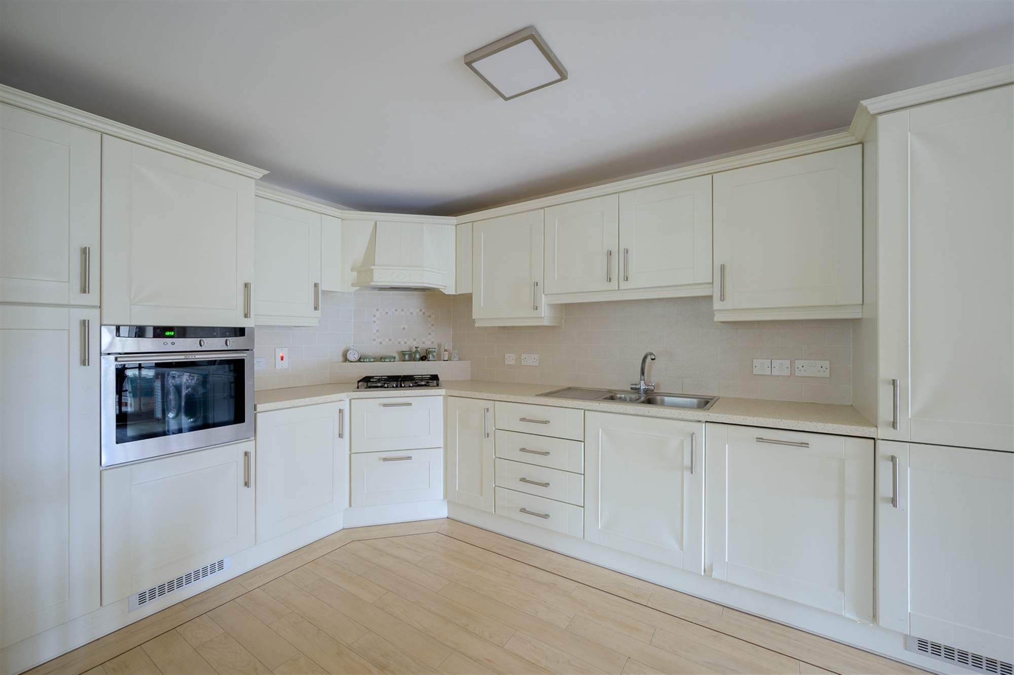 At widest points. Fully fitted kitchen with range of high and low level units, laminate effect worktops, stainless steel single drainer sink unit with side drainer and chrome mixer tap, built in 4 ring gas Neff hob with built in extractor fan above, built in high level oven and grill, larder storage, built in dishwasher, built in fridge/freezer.