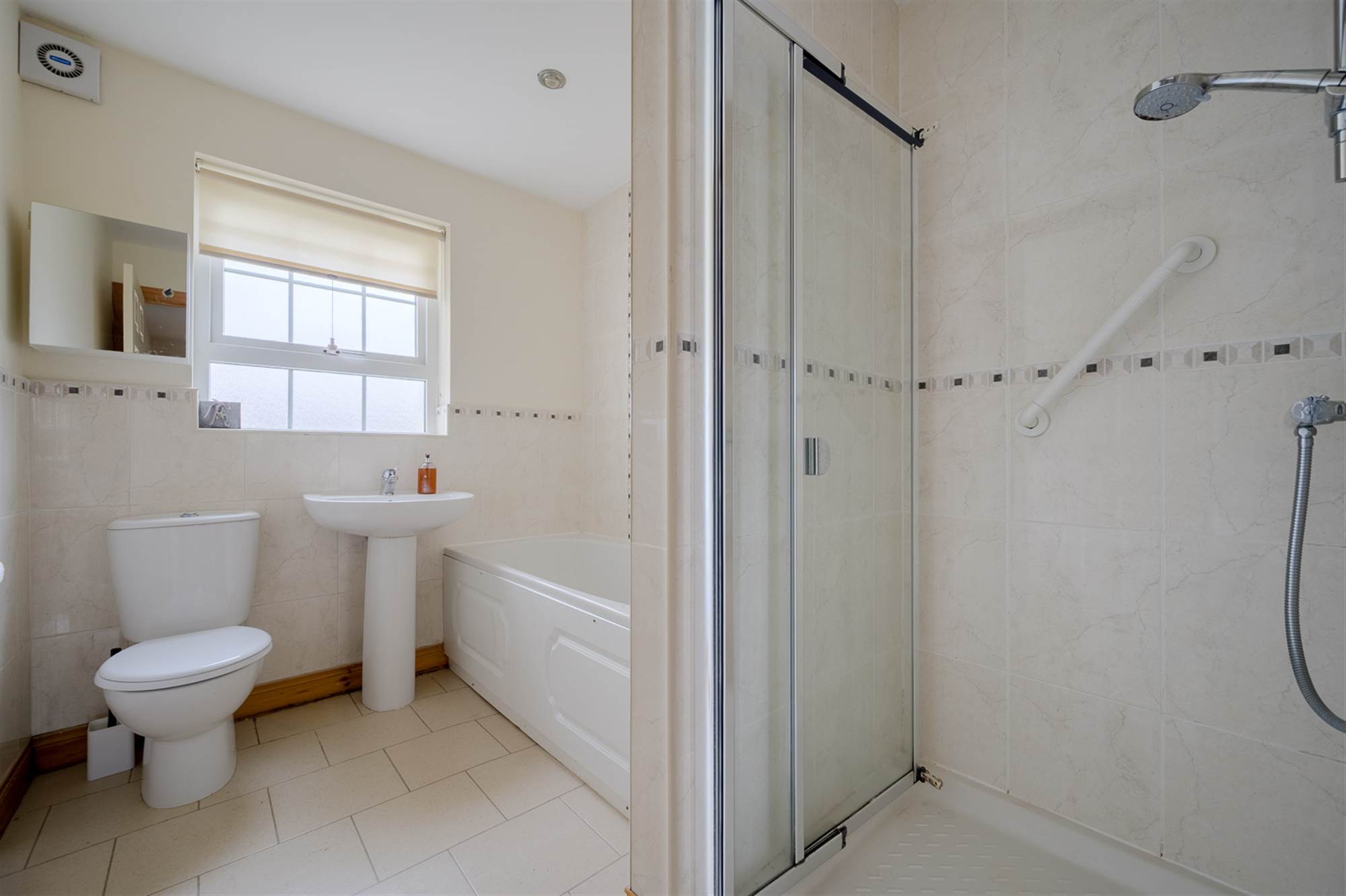 White suite comprising low flush WC with push button, pedestal wash hand basin with chrome mixer tap, panelled bath with chrome taps and telephone attachment, part tiled walls, tiled floor, corner shower unit with glass bi-folding door, cladded shower enclosure, chrome thermostatic control valve, telephone attachment, low voltage recessed spotlighting, extractor fan.