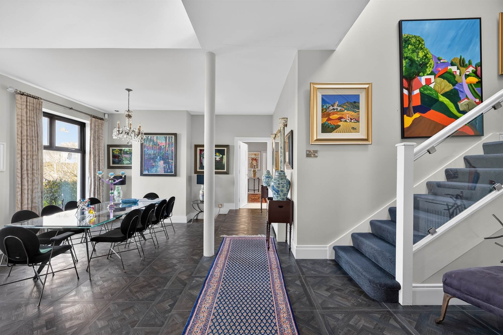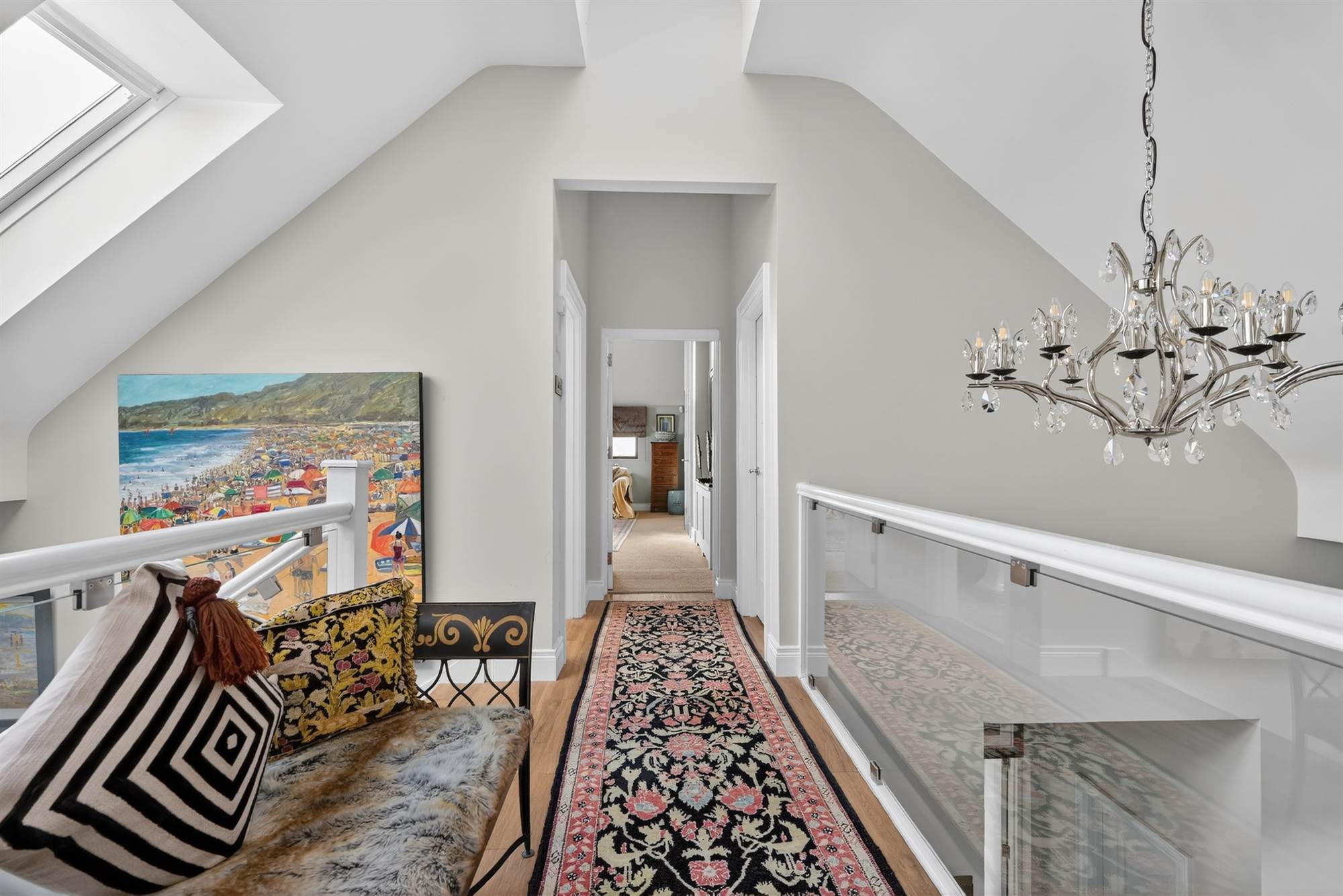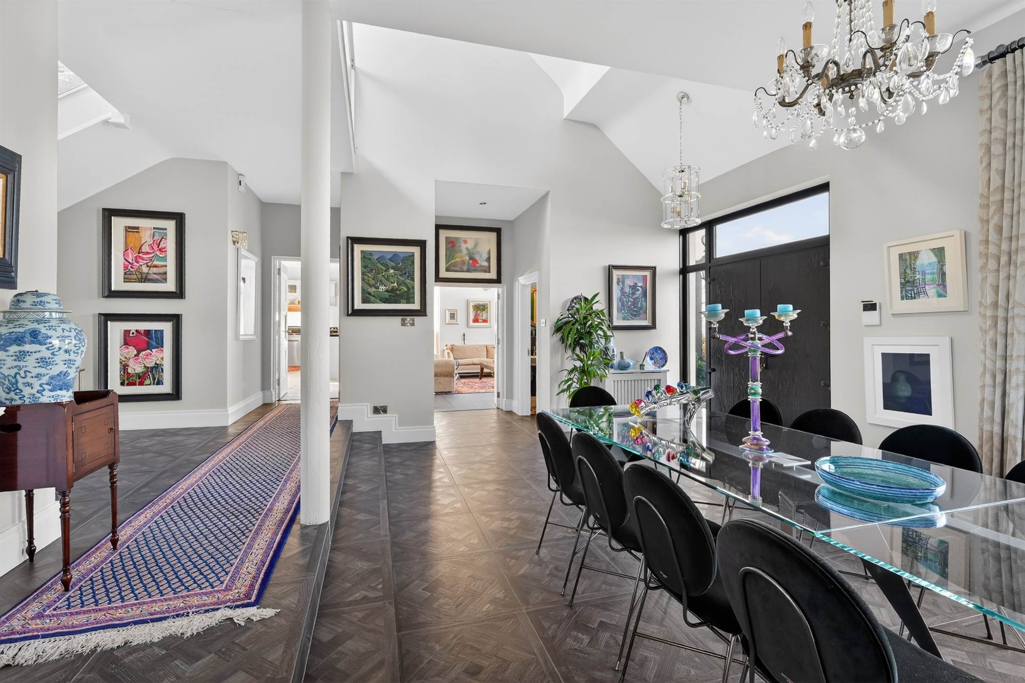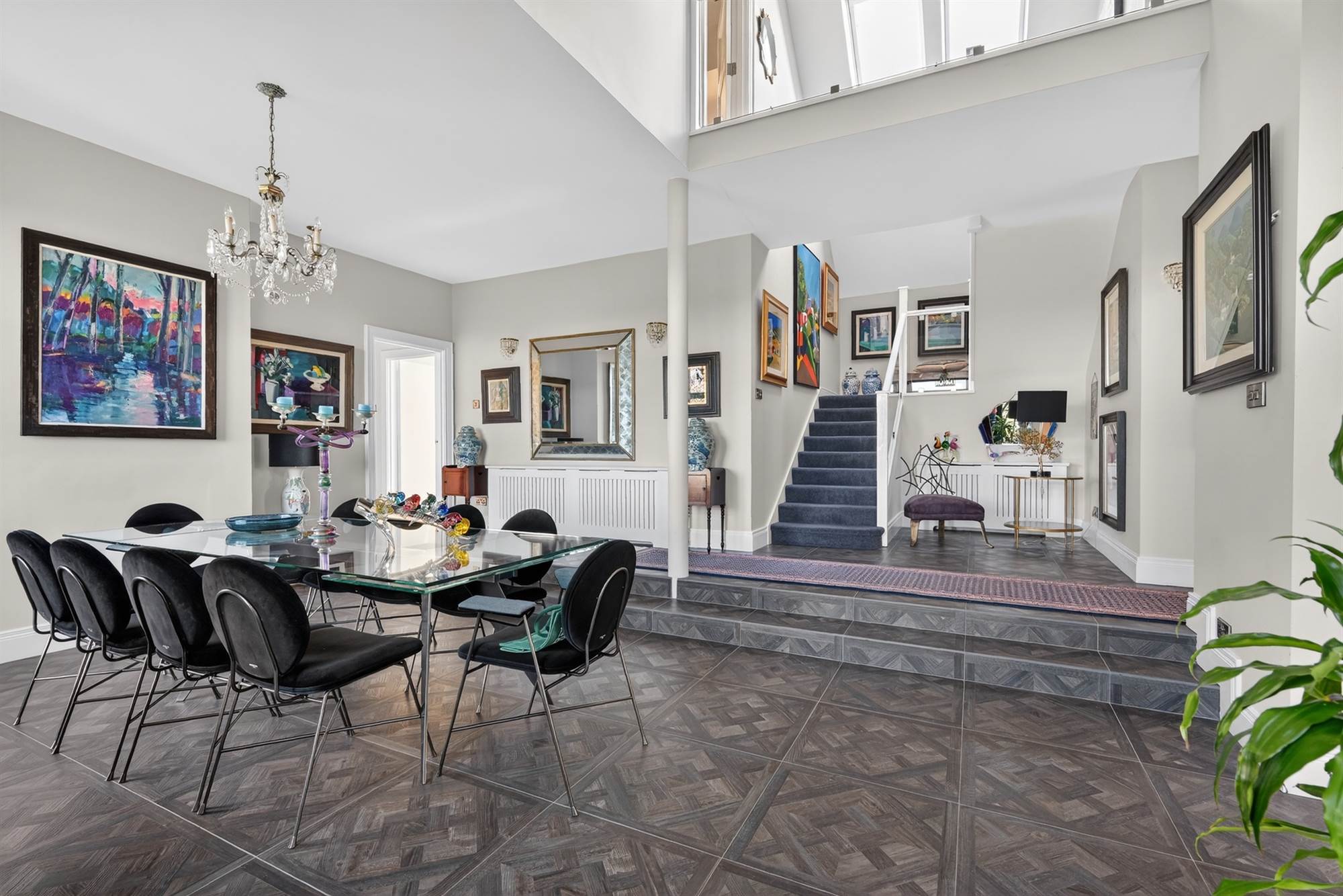Glazed balustrade overlooking grand entrance hall with rooflights.