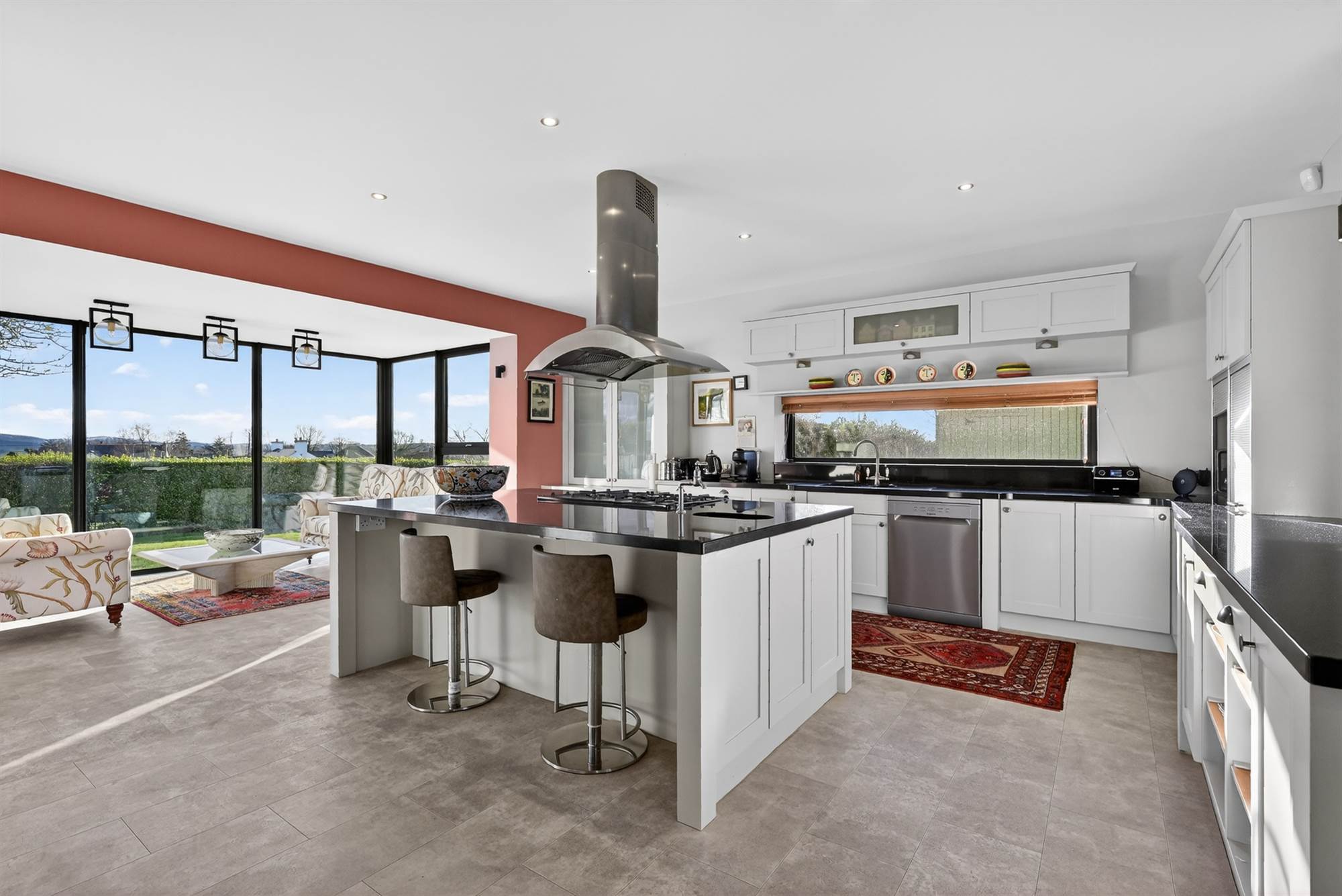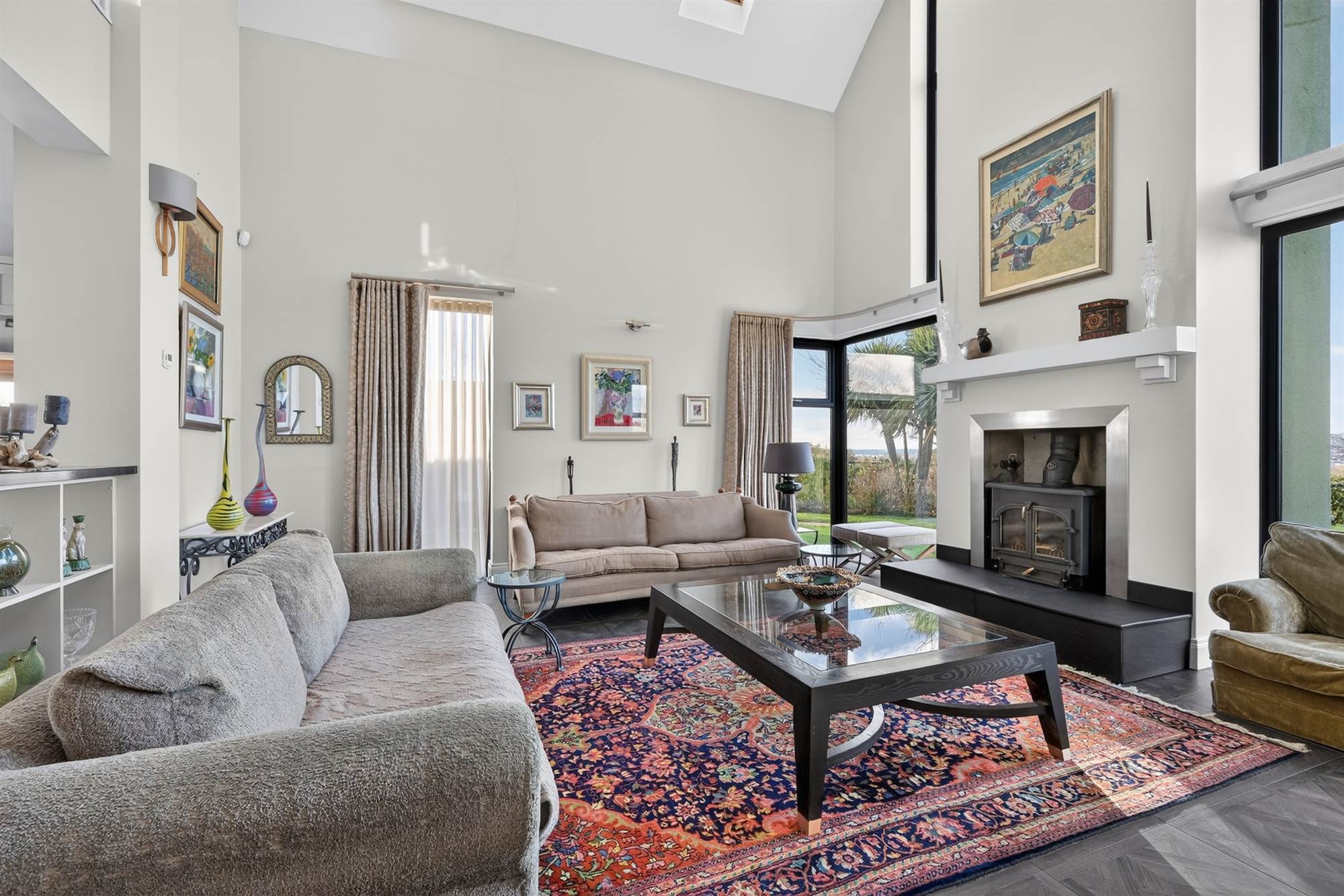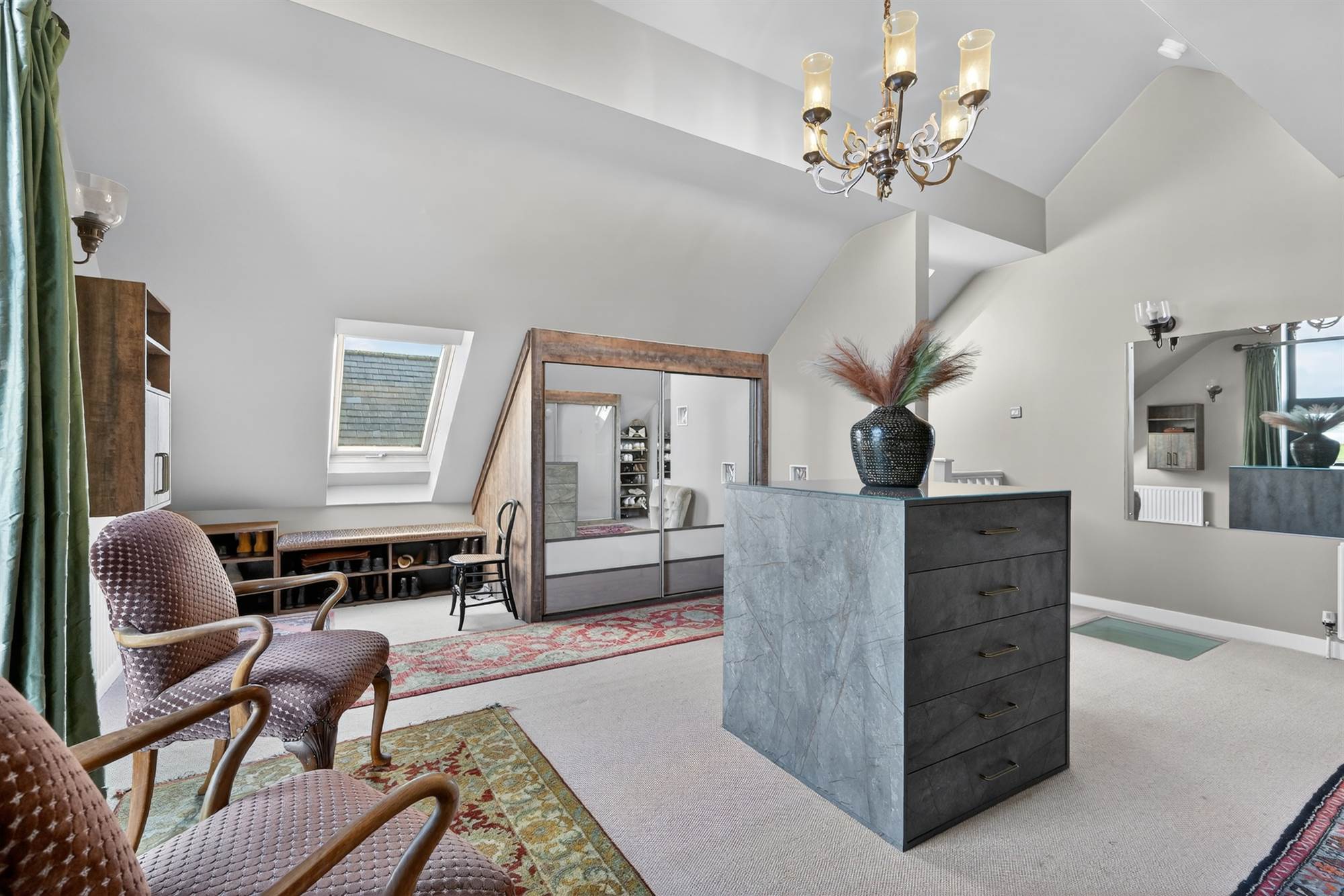 A superb dual-aspect room with raised slate hearth and multi-fuel stove. Corner glazing captures far-reaching views across the Lagan Valley towards Cavehill. Vaulted ceiling with rooflight and open access via steps to the kitchen.