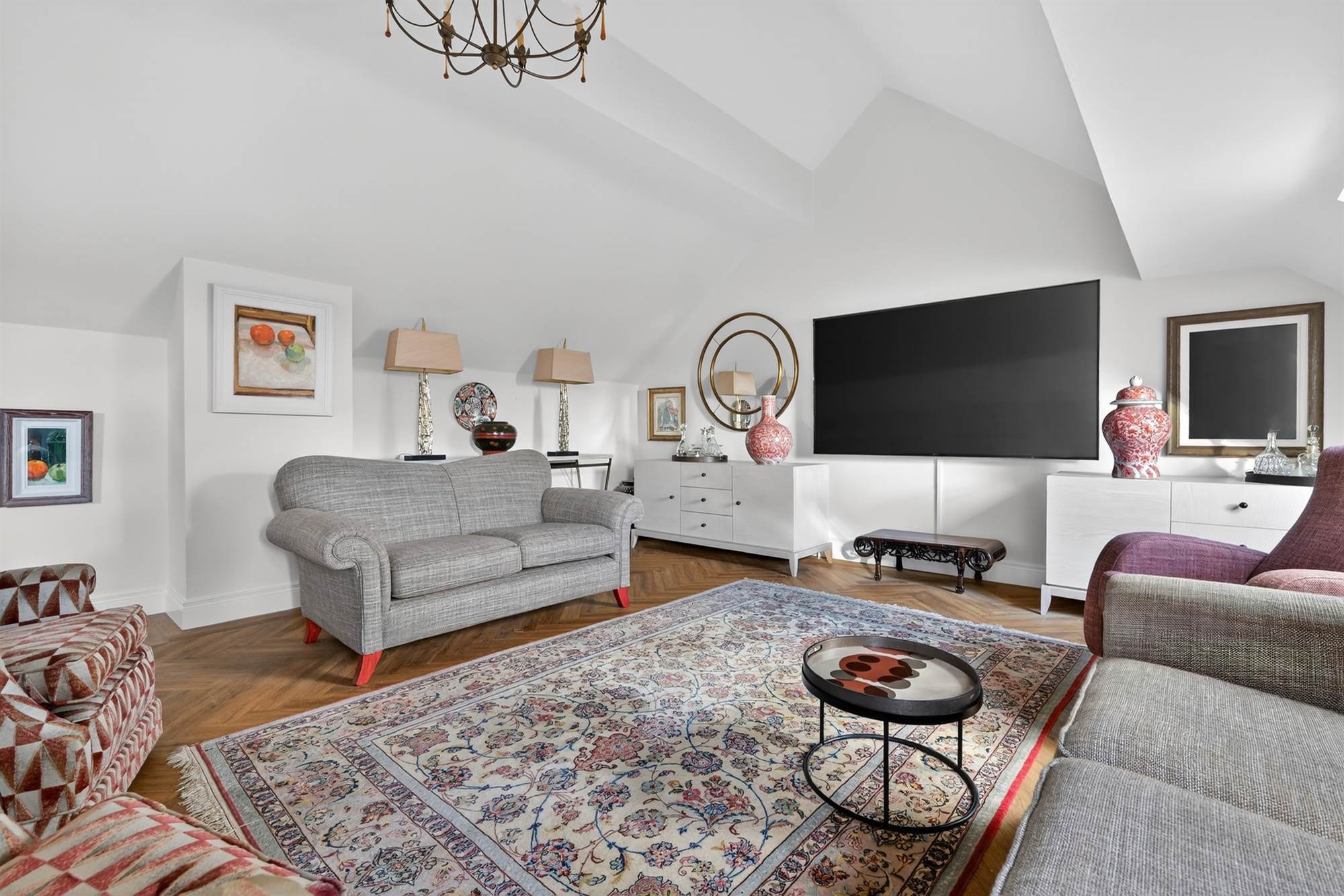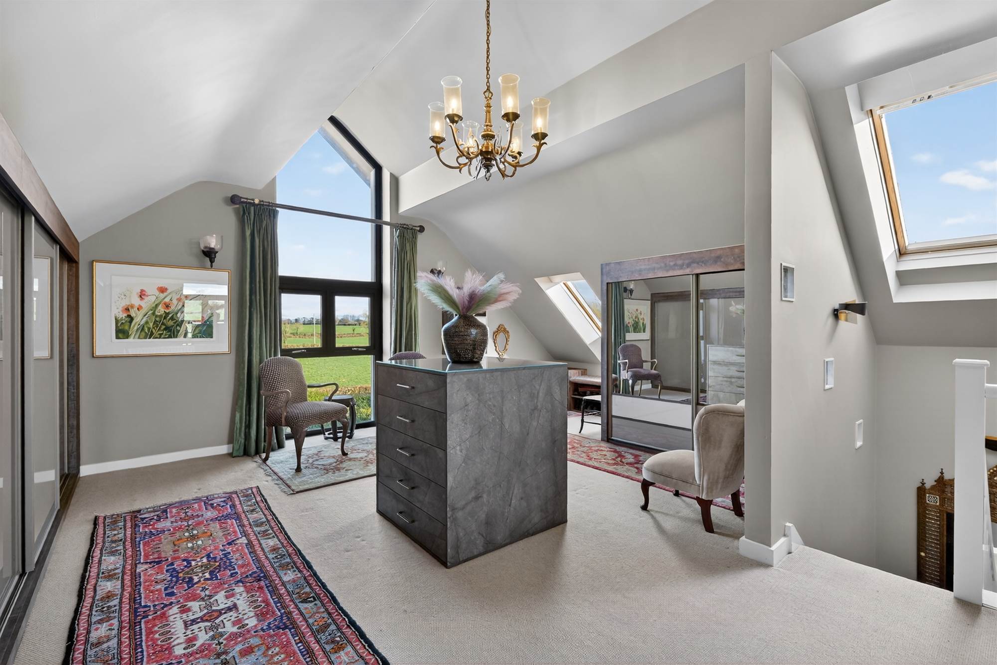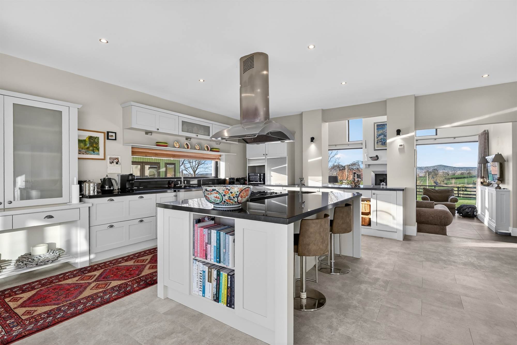A superb dual-aspect room with raised slate hearth and multi-fuel stove. Corner glazing captures far-reaching views across the Lagan Valley towards Cavehill. Vaulted ceiling with rooflight and open access via steps to the kitchen.