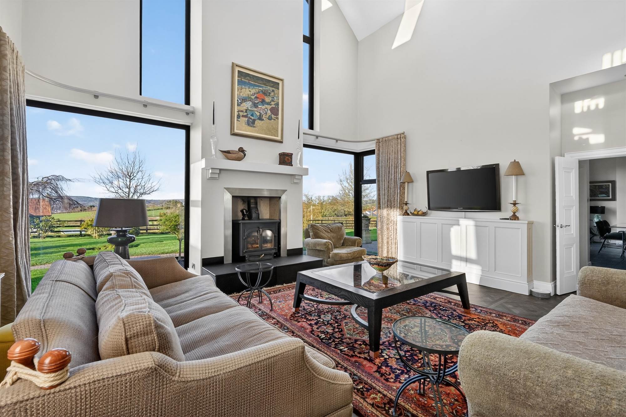 Bright And Inviting Family Room With Multi-Fuel Stove, Wraparound Corner Windows Overlooking The Gardens And High Vaulted Ceiling