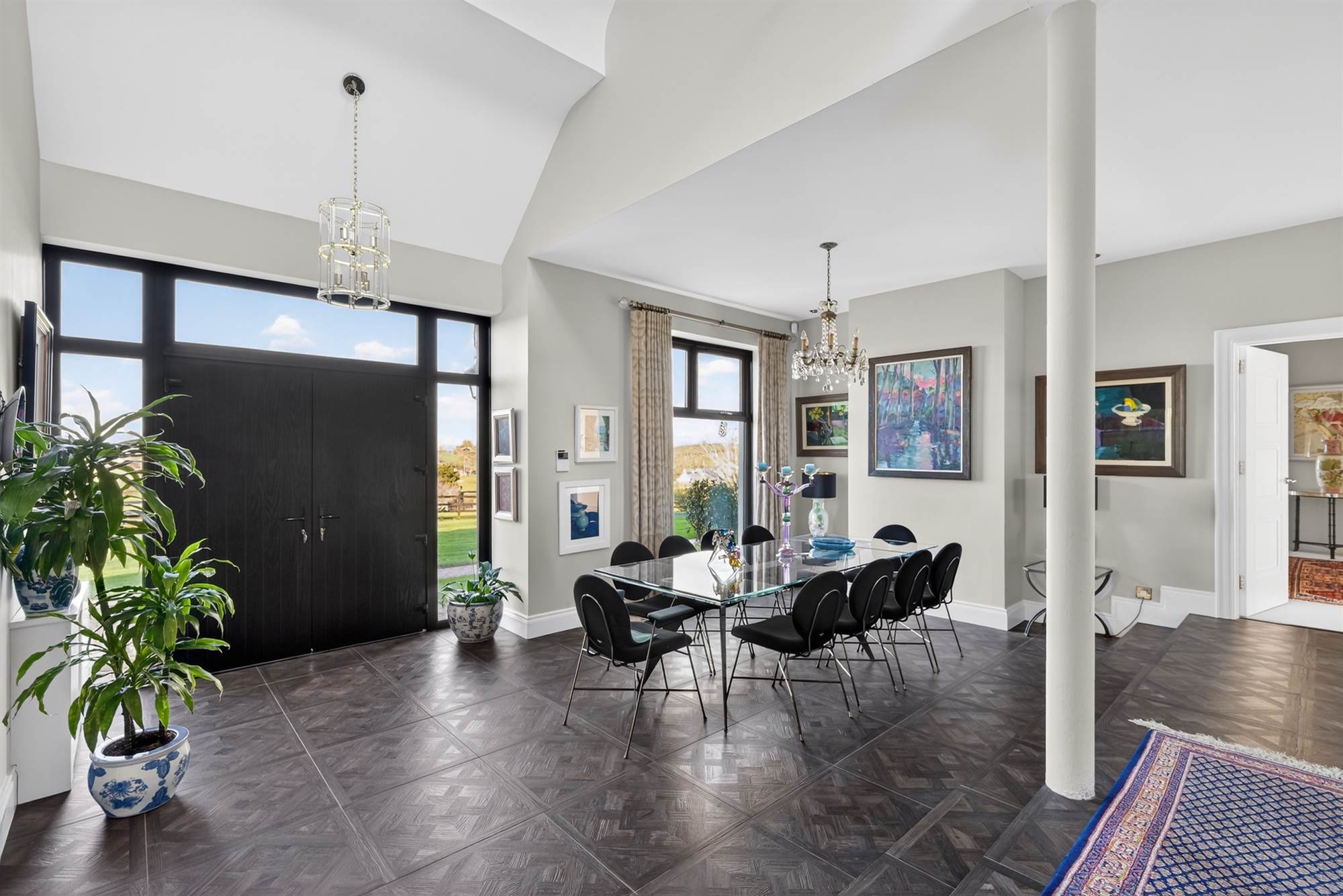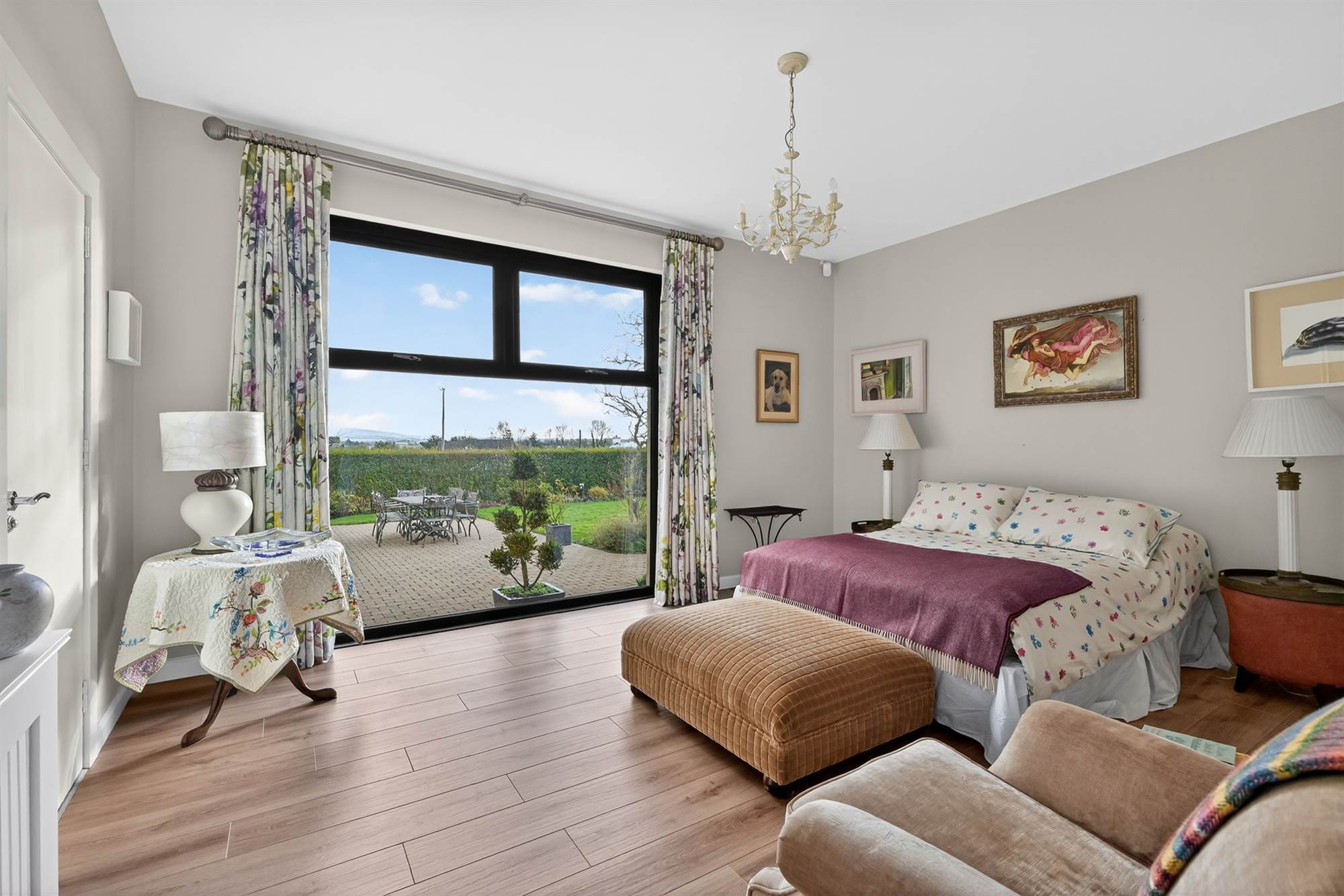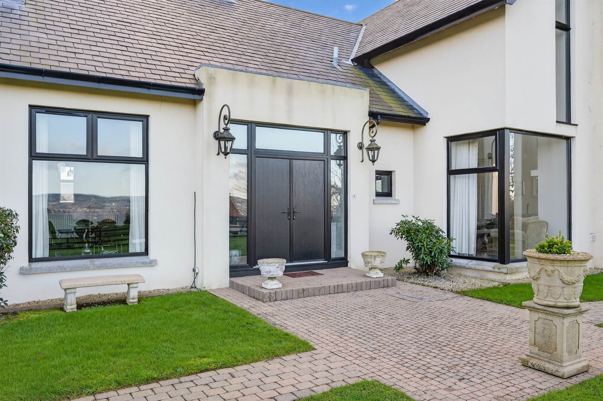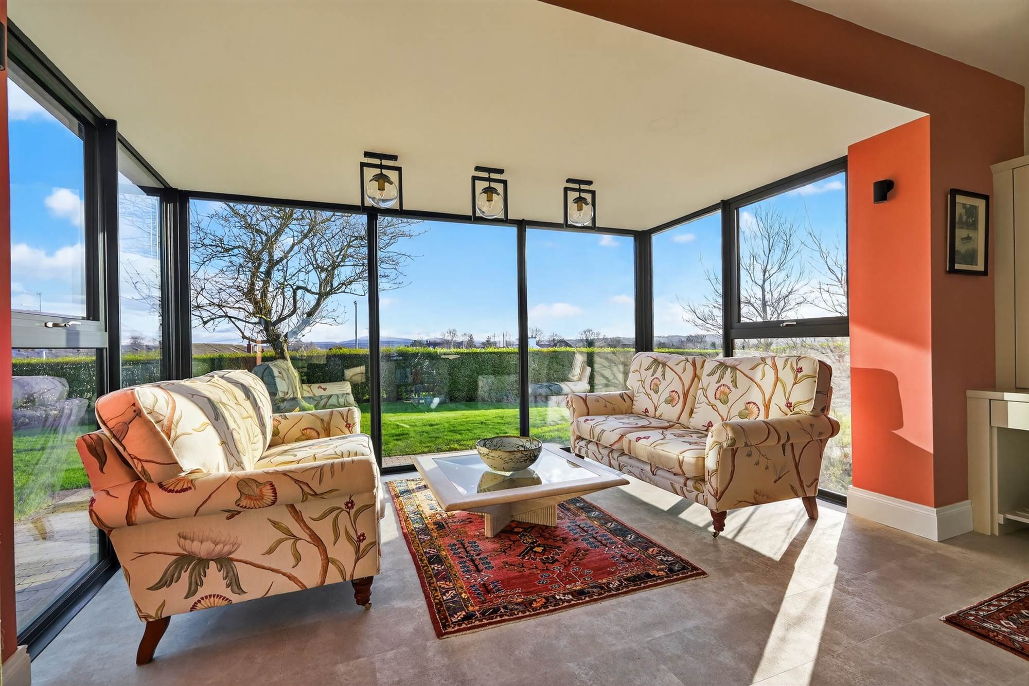 Enjoying views towards Slieve Croob with composite door to patio and garden, surrounding floor to ceiling windows.