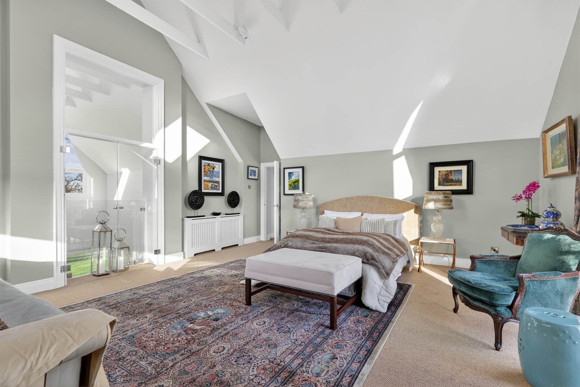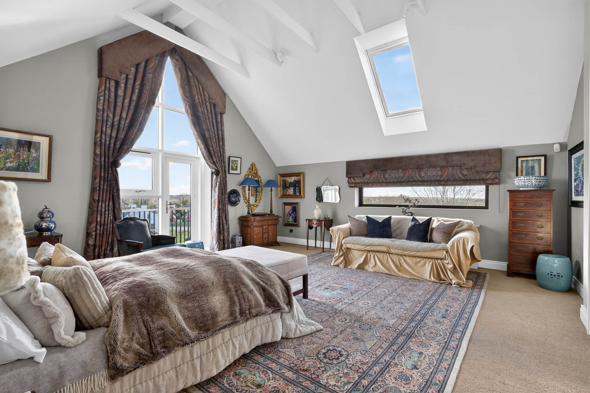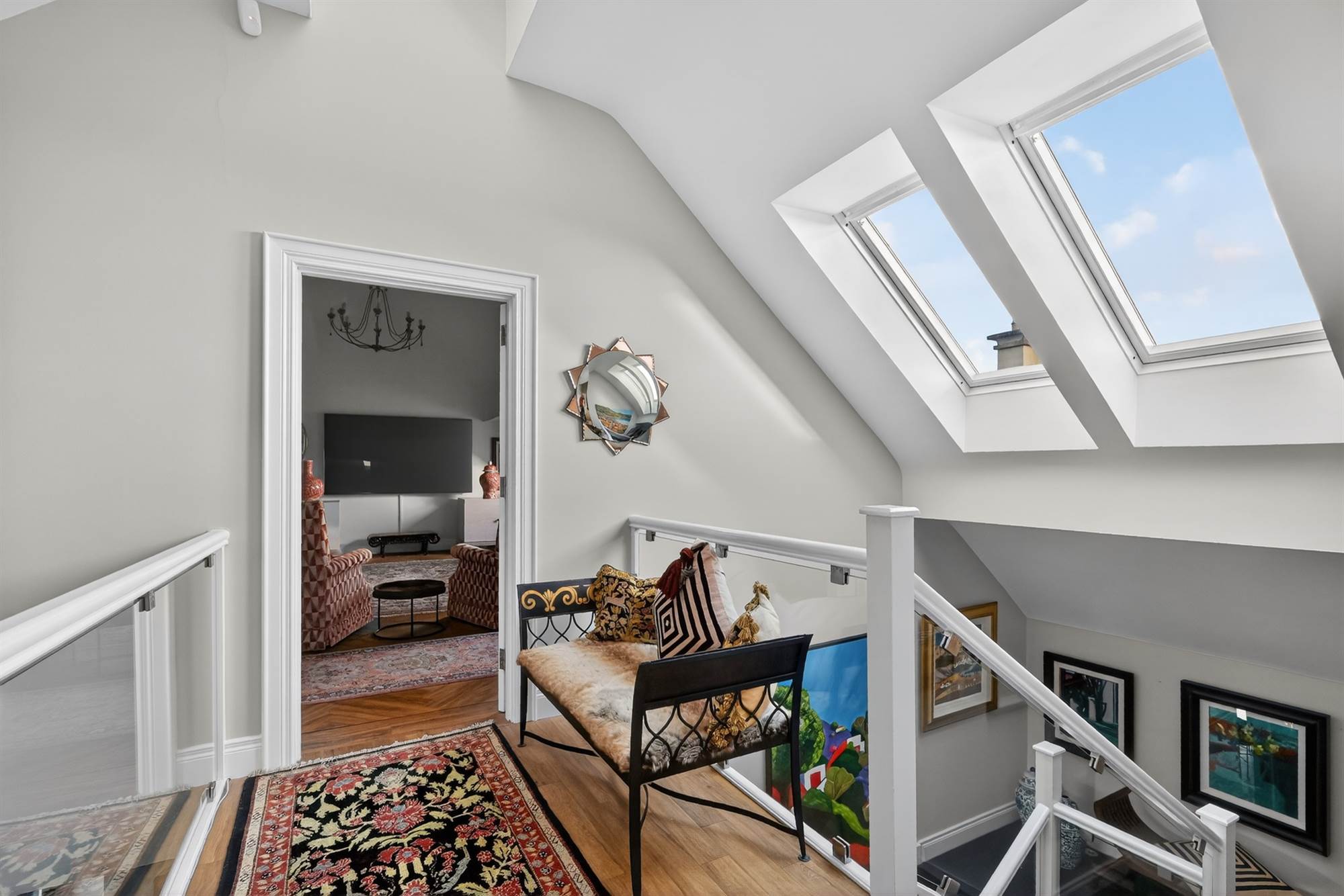 Spacious and versatile with rooflights and timber flooring, access to private balcony, glass doors overlooking living room.