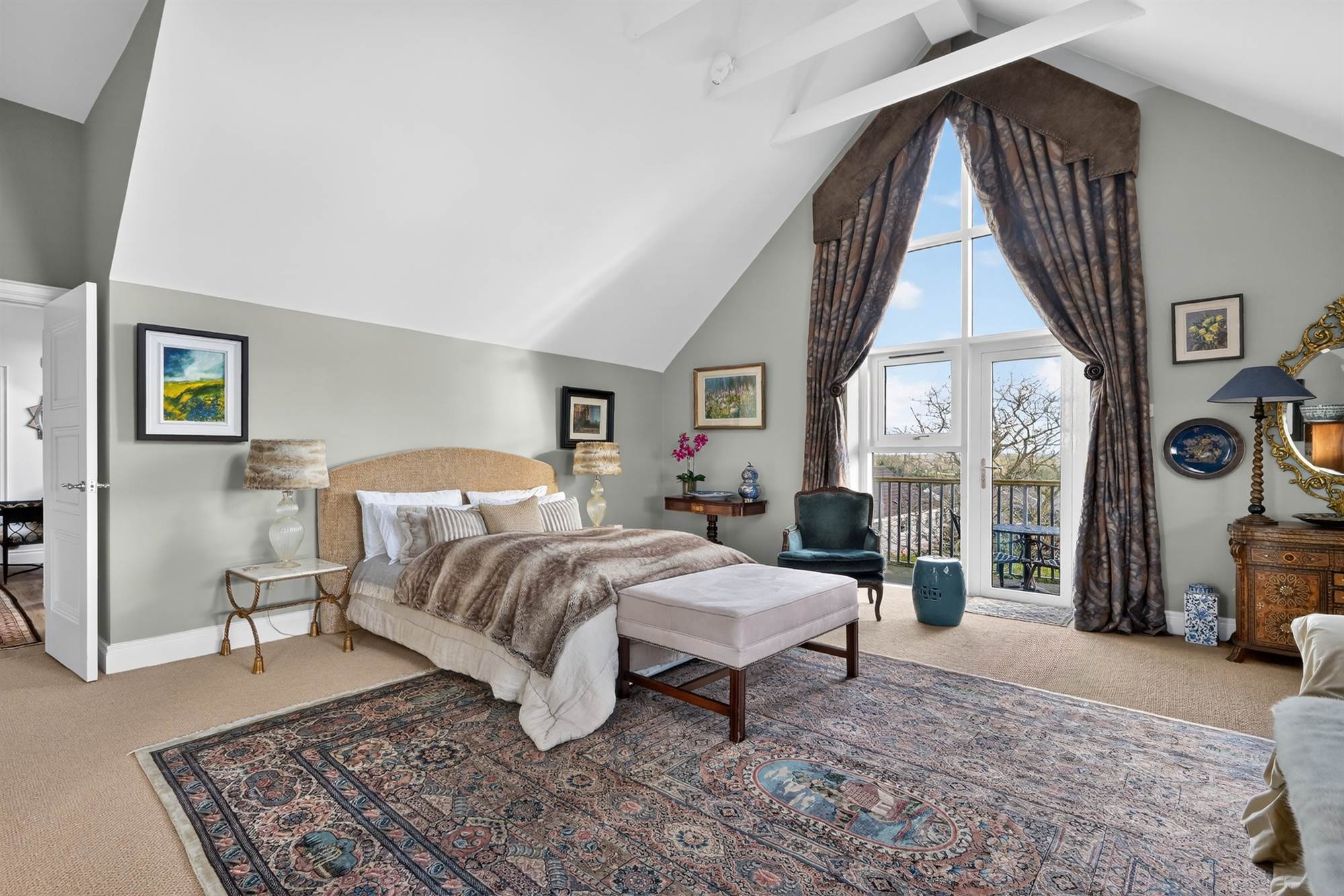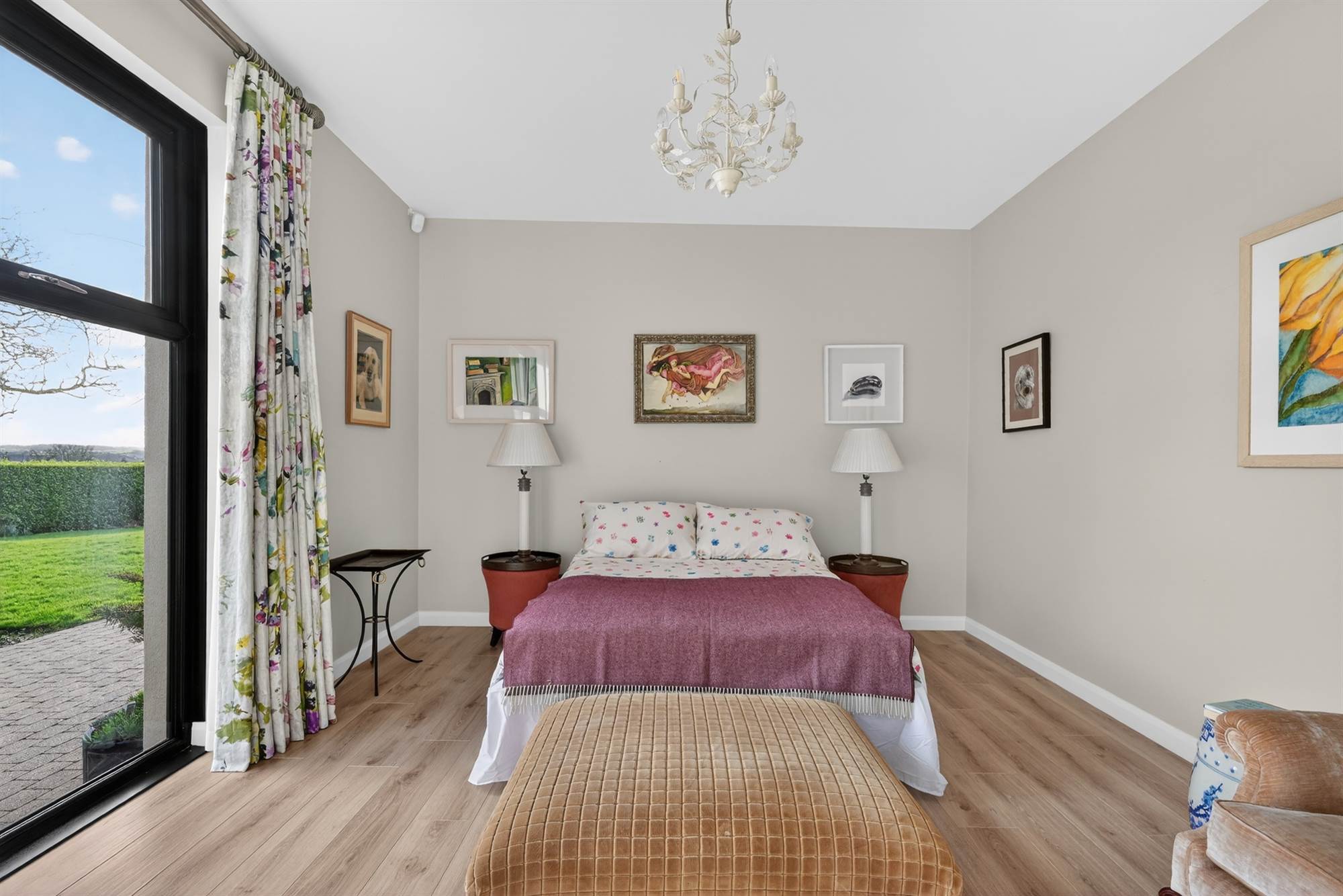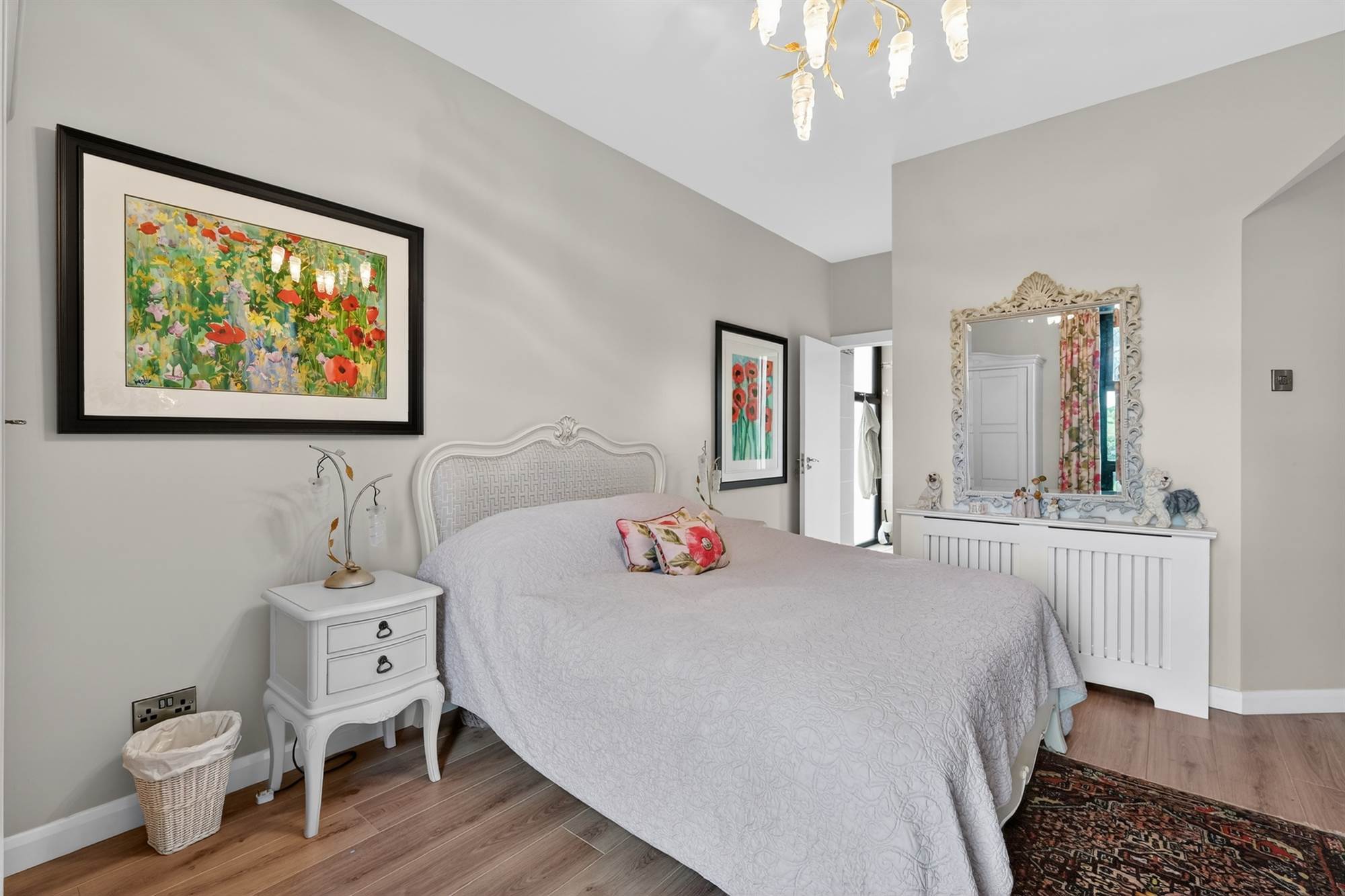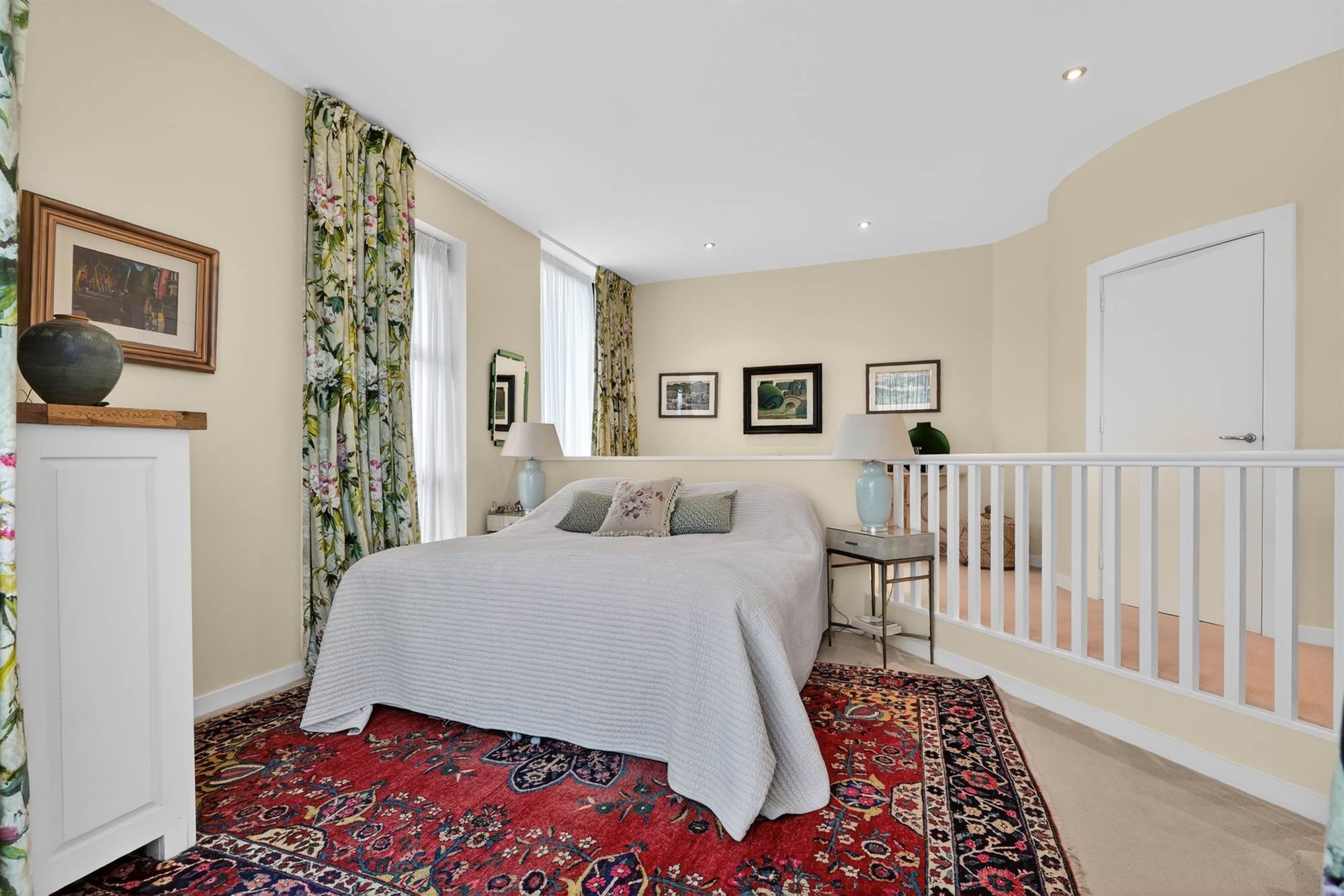 Spacious and versatile with rooflights and timber flooring, access to private balcony, glass doors overlooking living room.