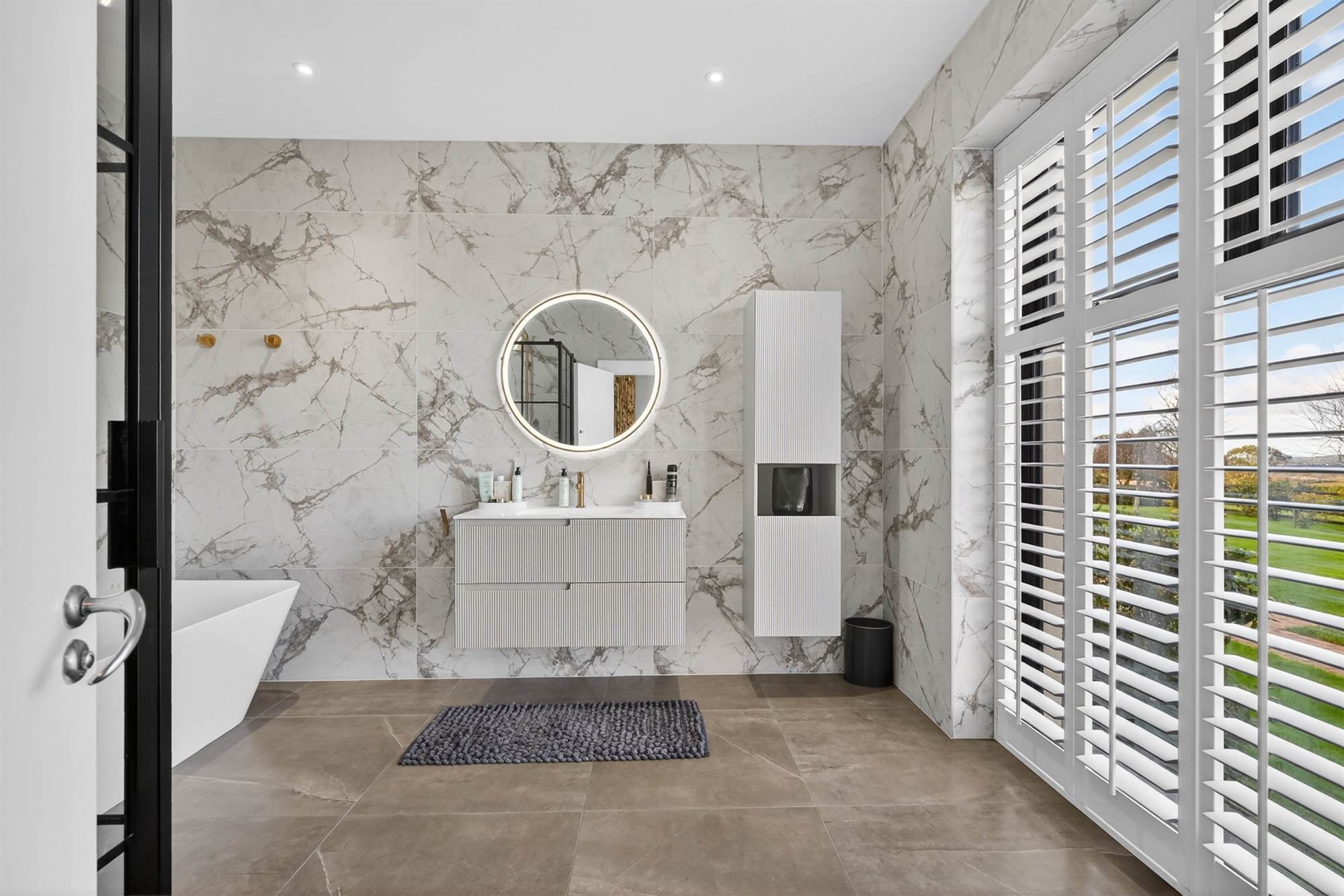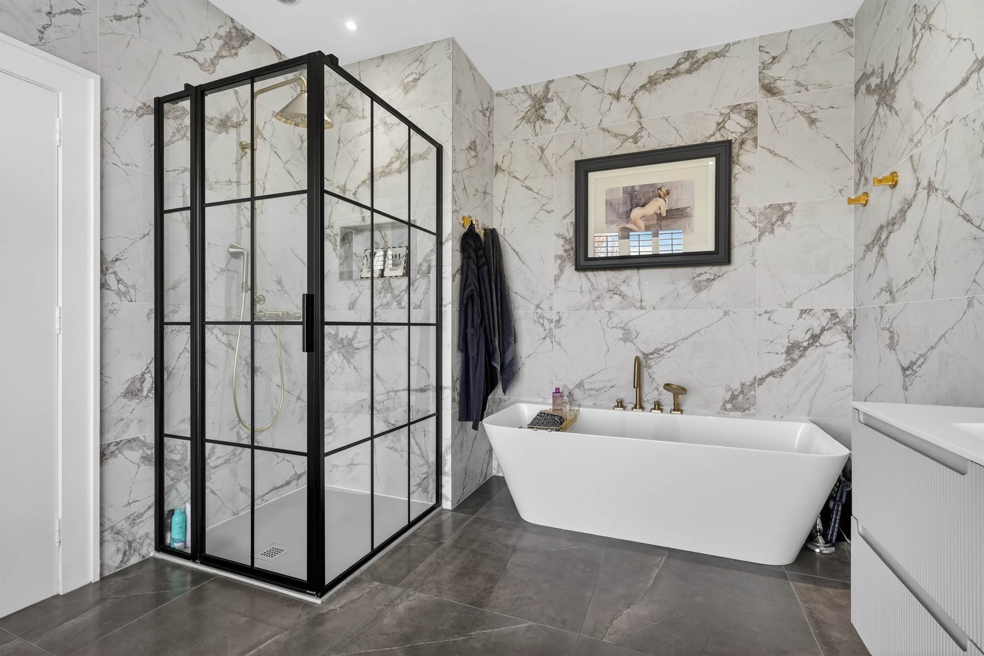 Feature freestanding bath with mixer tap and telephone attachment, separate thermostatic shower with glass door, vanity unit with mixer tap and marble tiling.