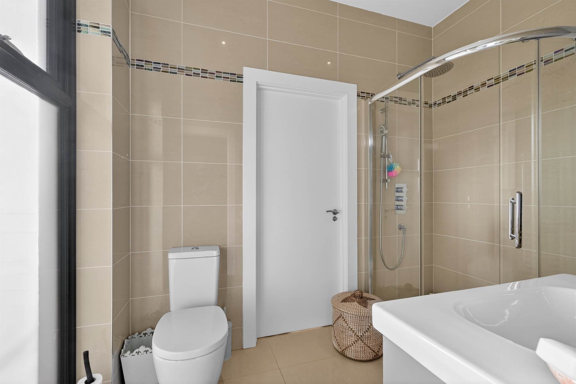 Corner shower, glass door, thermostatic control valve, telephone attachment and rainfall headset, vanity unit and porcelain tiling, chrome heated towel rail.