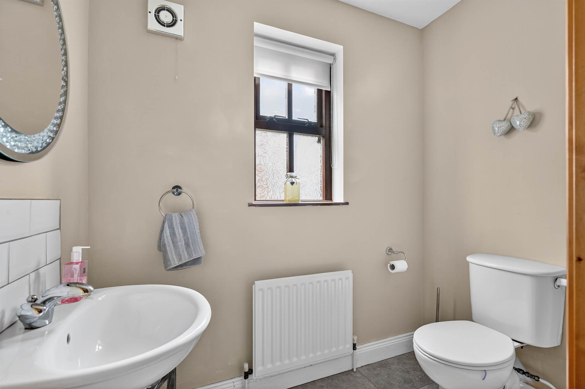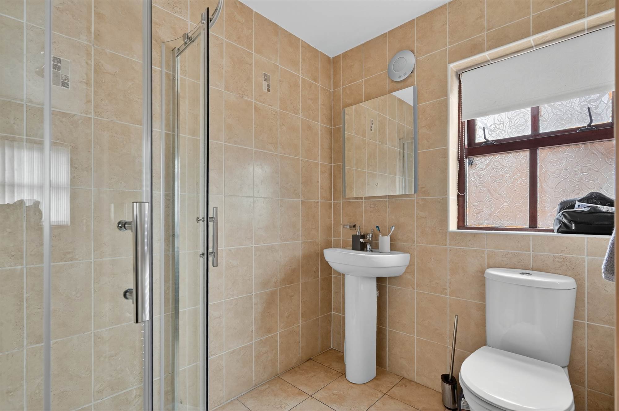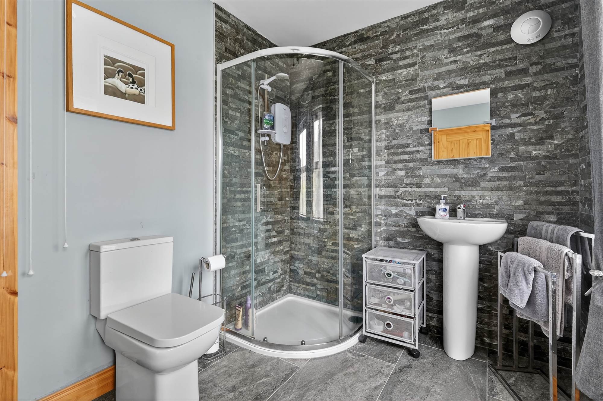White suite comprising low flush wc, pedestal wash hand basin with chrome mixer tap, corner shower unit with chrome thermostatic control valve and telephone attachment, fully tiled walls, tiled floor, chrome heated towel rail. Frosted glass window. Extractor fan.