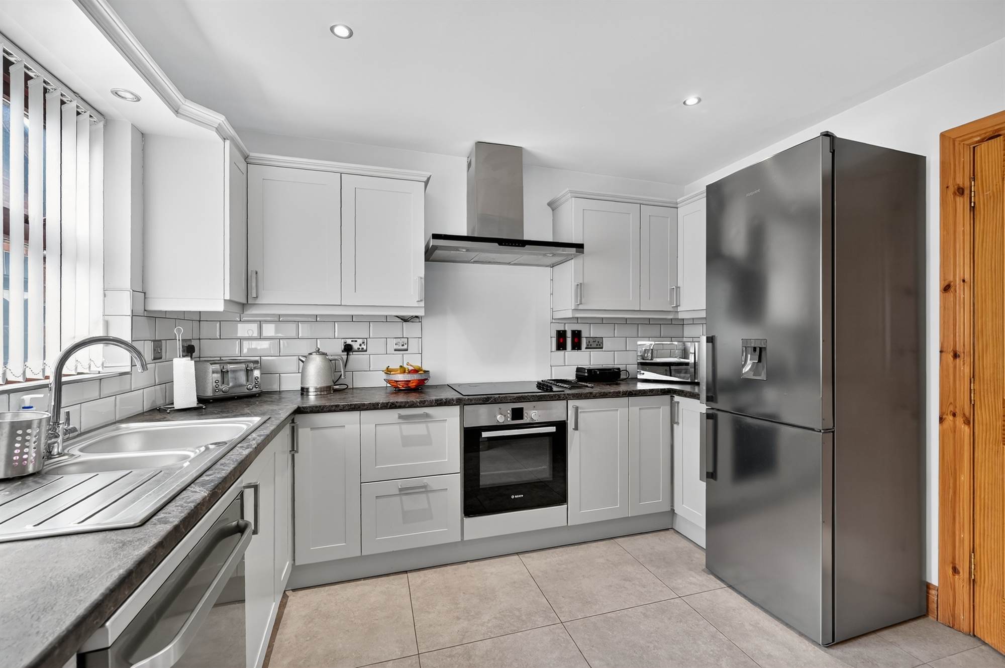 (at widest points). Outlook to rear. Range of high and low level units, laminate worktops, single drainer stainless steel sink unit with chrome mixer tap, space for fridge, space for dishwasher, built in glass cabinet, four ring ceramic hob, glass splashback and stainless steel extractor fan above, integrated oven and grill, space for fridge/freezer, part tiled walls, tiled floor. Space for casual dining, low voltage spotlights, double glazed access door to rear garden.