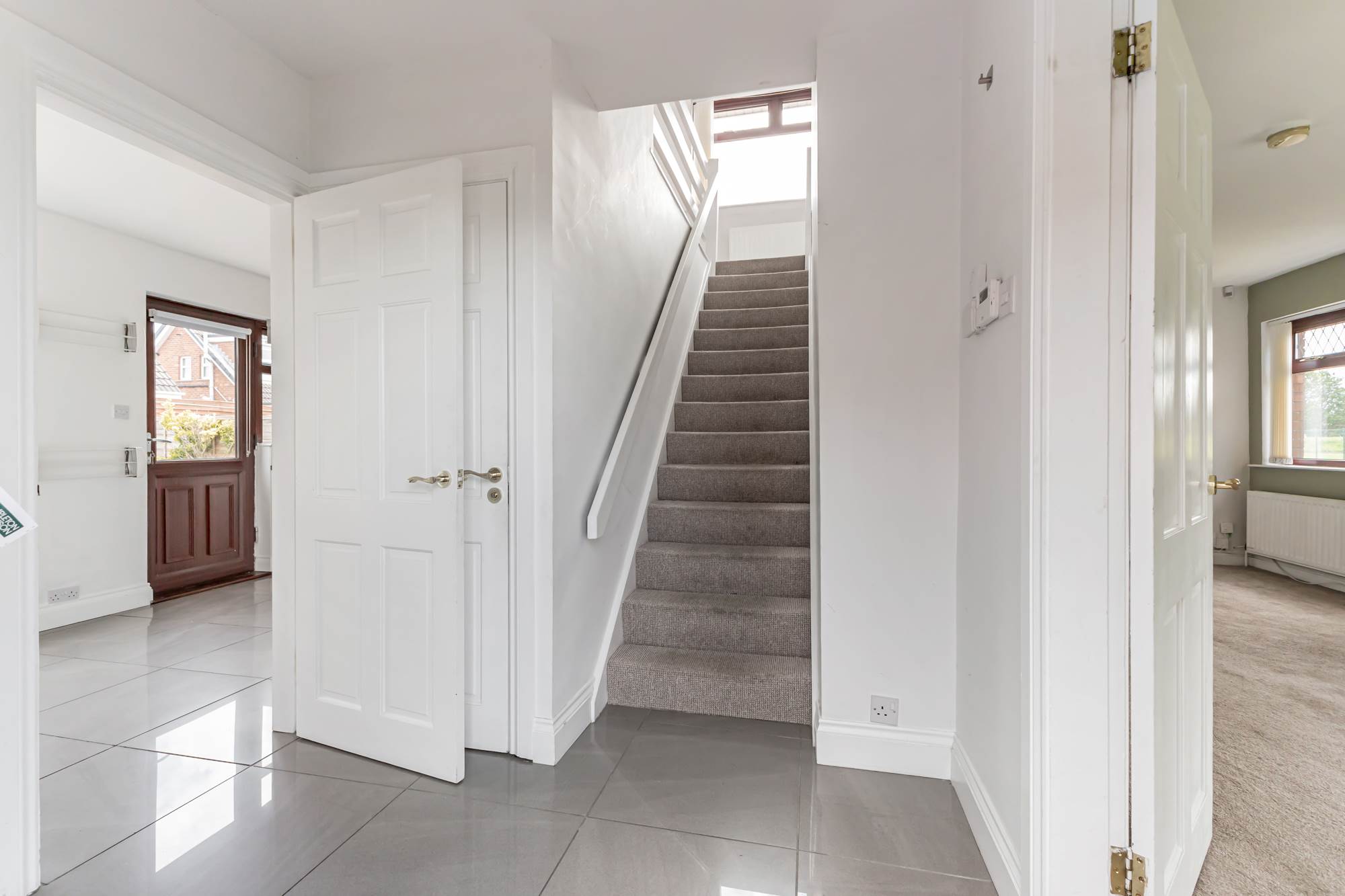 Excellent range of high and low level units with under cupboard strip lighting. Built in hob and Belling oven. Hotpoint stainless steel extractor fan. Integrated Hoover dishwasher, integrated fridge freezer. One and a half bowl stainless steel sink unit. Useful larder. Understairs storage cupboard. Polished porcelain flooring. Part tiled walls. Plumbed for washing machine, vented for tumble dryer. Recessed lights in kitchen area.