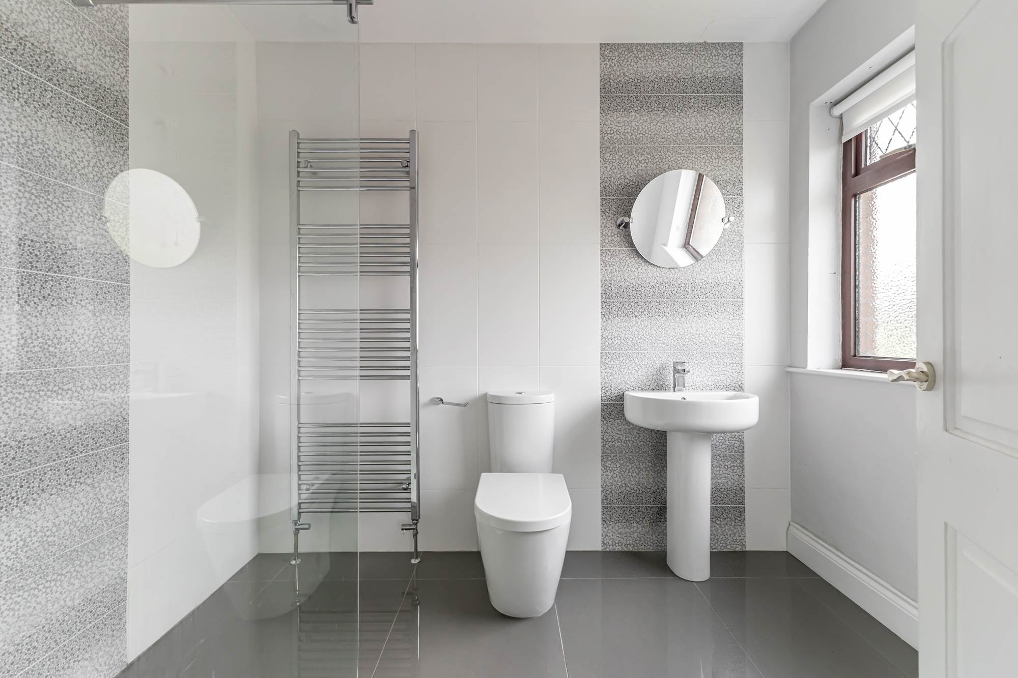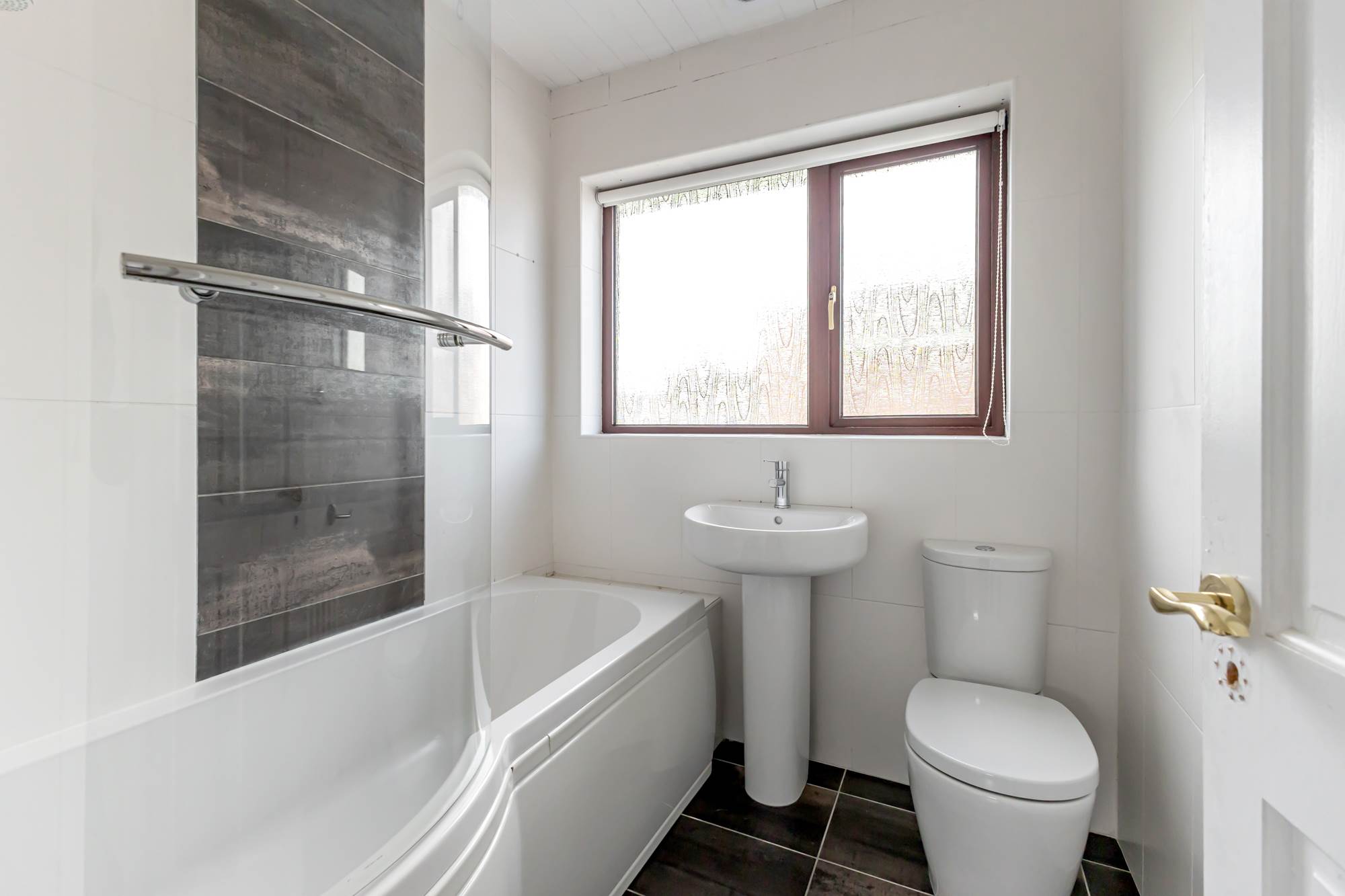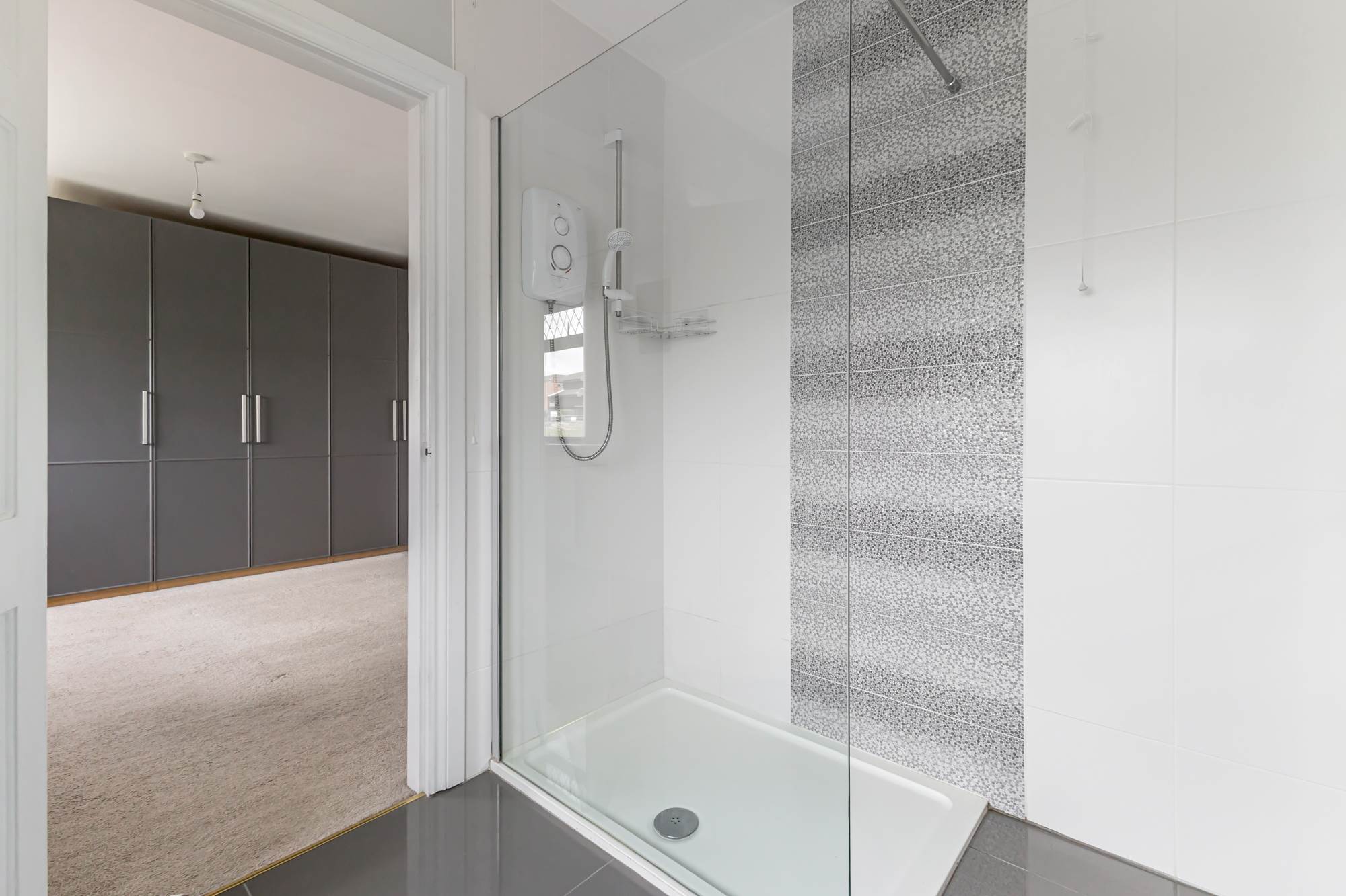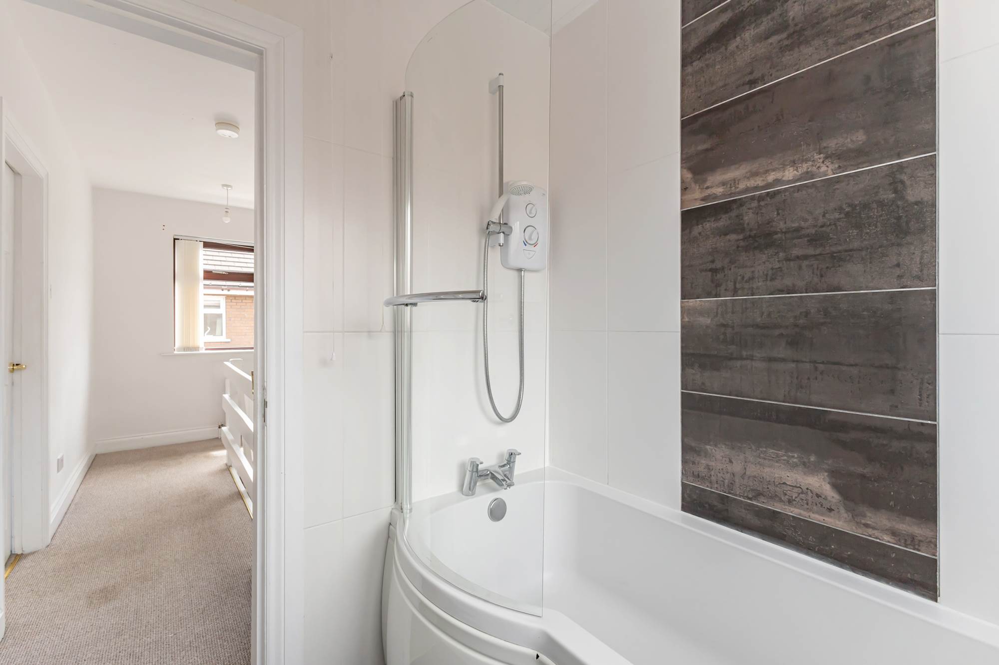 Stylish white suite. Panelled bath. Mira Sprint electric shower. Shower screen. Pedestal wash hand basin. Low flush WC. Fully tiled. Recessed lights. Extractor fan.