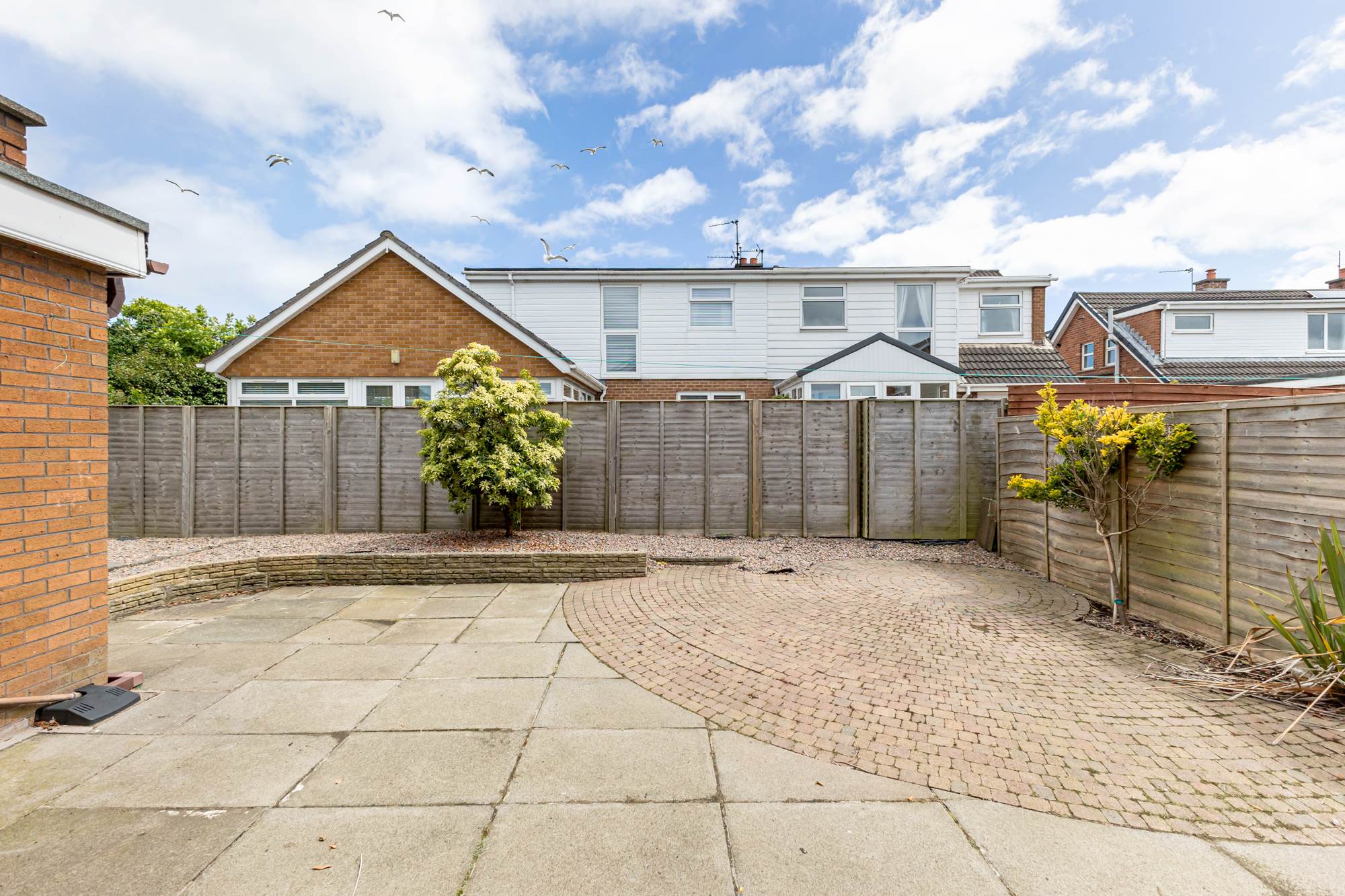Tarmac driveway with extra parking. Neat front garden with shrubs and trees. Low maintenance private rear garden with feature brick paved patio, raised shrubs. Garden shed. Outside light.