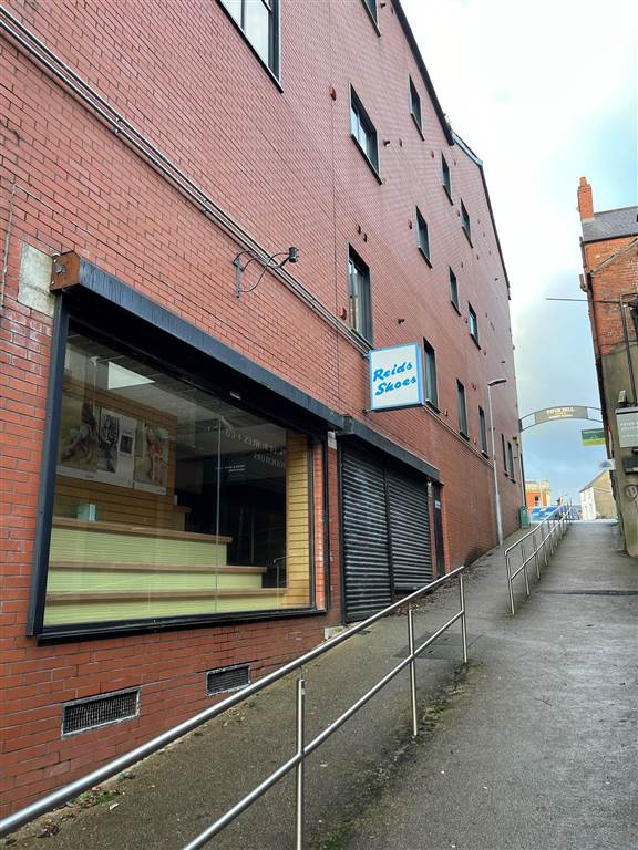 Top of Lisburn"s main shopping throughfare across from the Linen Museum and overlooking Market Square with side access from Market Lane.
