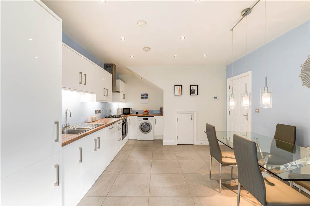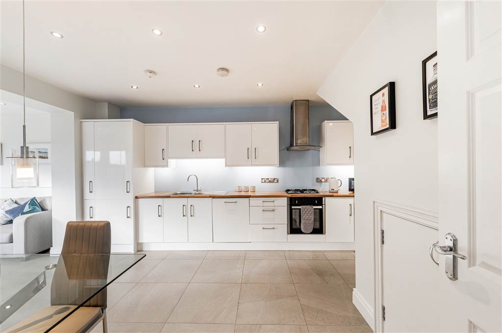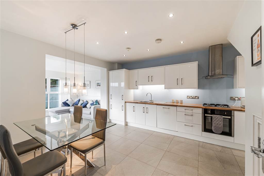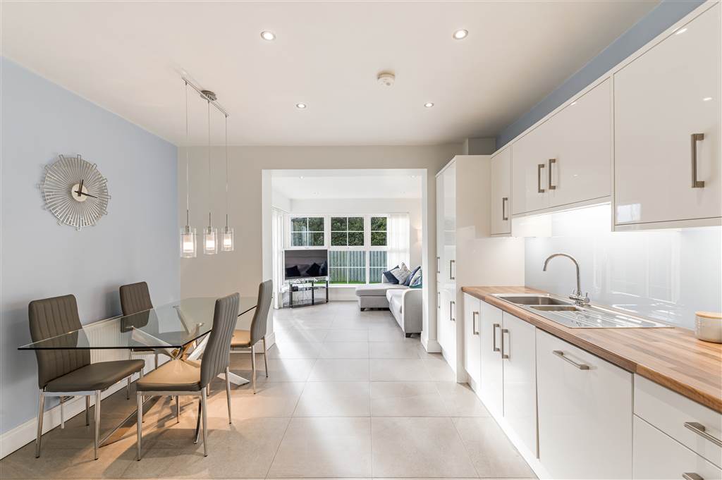 Excellent range of high and low level units, Formica work surfaces, stainless steel sink unit with mixer taps, 4 ring ceramic hob & electric oven, stainless steel extractor fan, plumbed for washing machine, integrated dishwasher, fridge / freezer space, recessed spot lighting, additonal storage cupboard, space for family dining, open to;