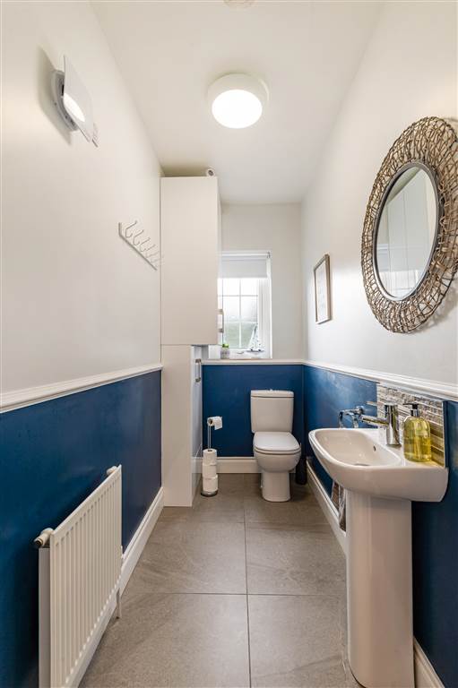 White suite comprising of low flush W.C, wash hand basin with mixer taps, partly tiled walls, ceramic tiled flooring, extractor fan, panelled radiator, gas fired central heating boiler.