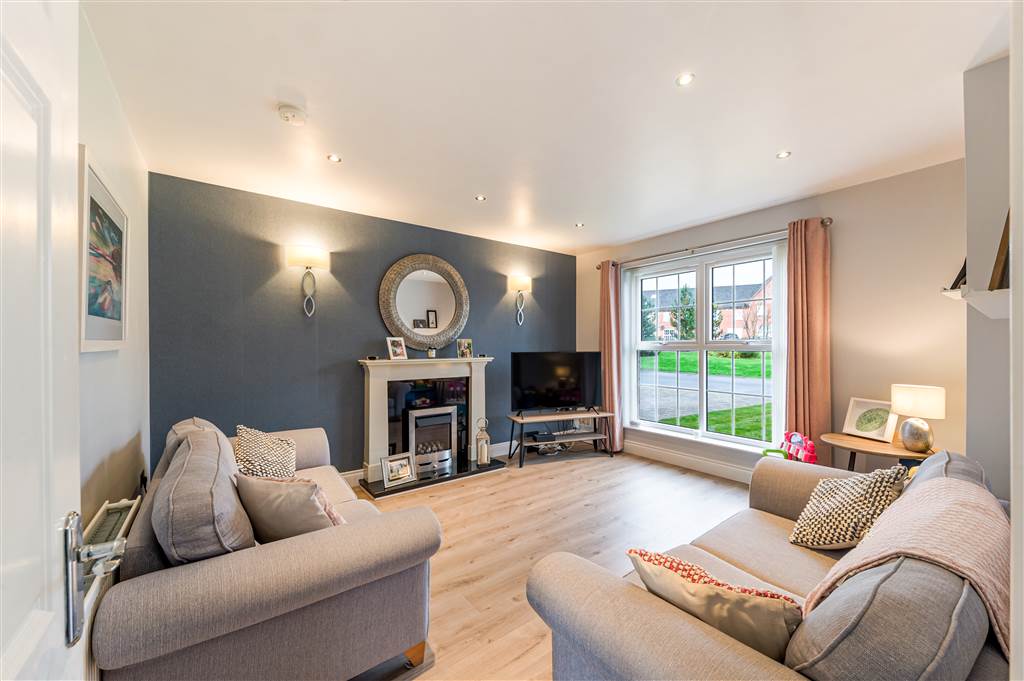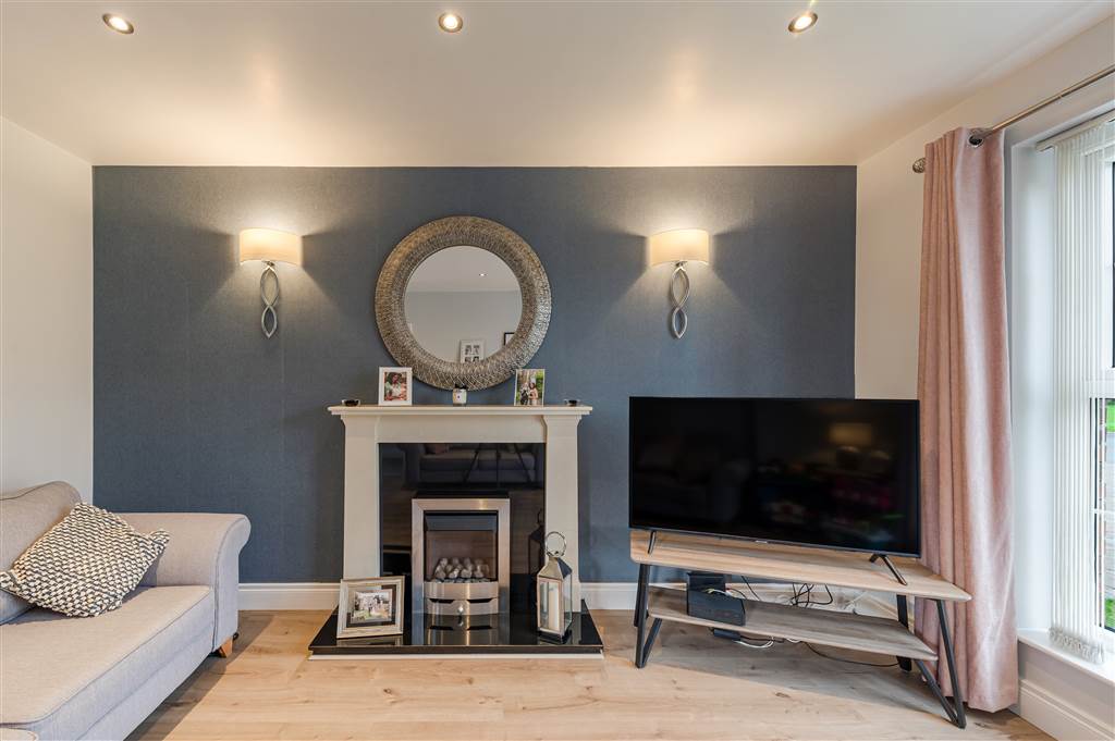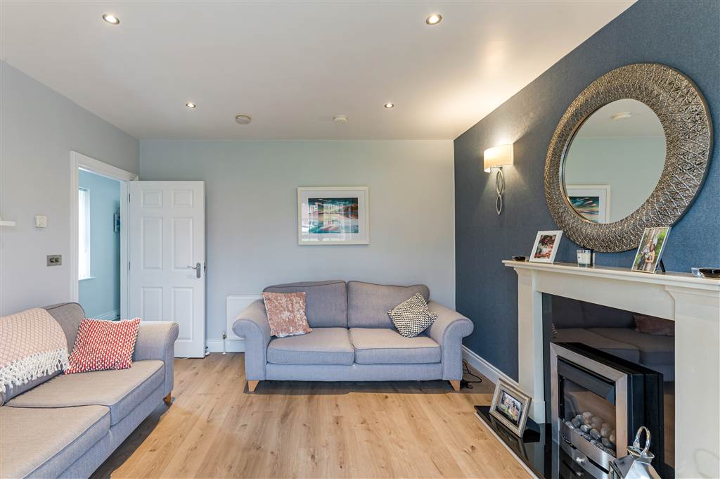Laminate wood flooring, attractive stone firepalace with electric fire, feature wall lights, recessed spot lighting, double panelled radiator.