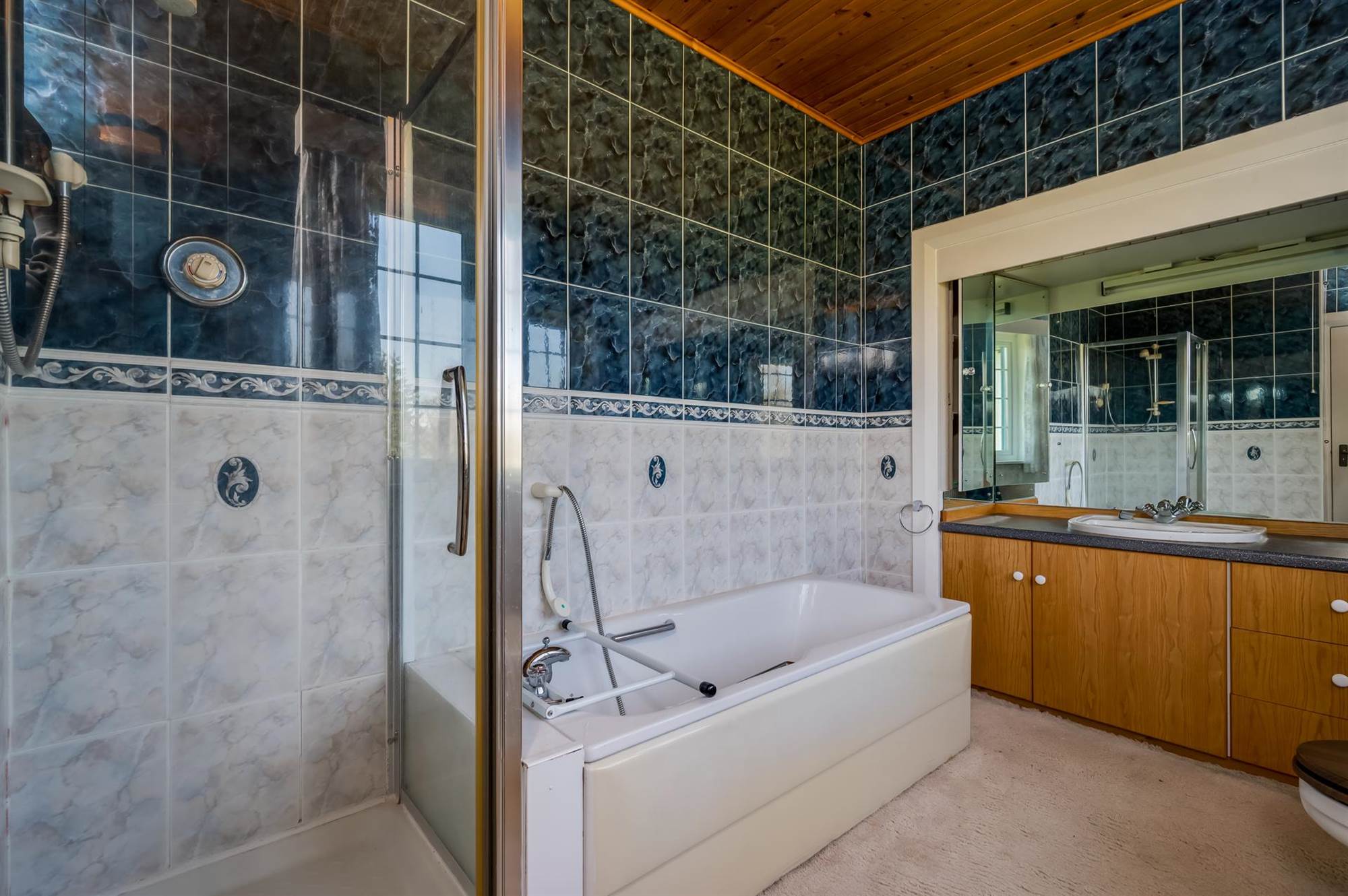 White suite comprising panelled bath, tiled shower cubicle with Mira shower, bidet, low flush wc, vanity unit with mirror and cabinet, fully tiled walls, tongue and groove panelled ceiling, low voltage spotlights.