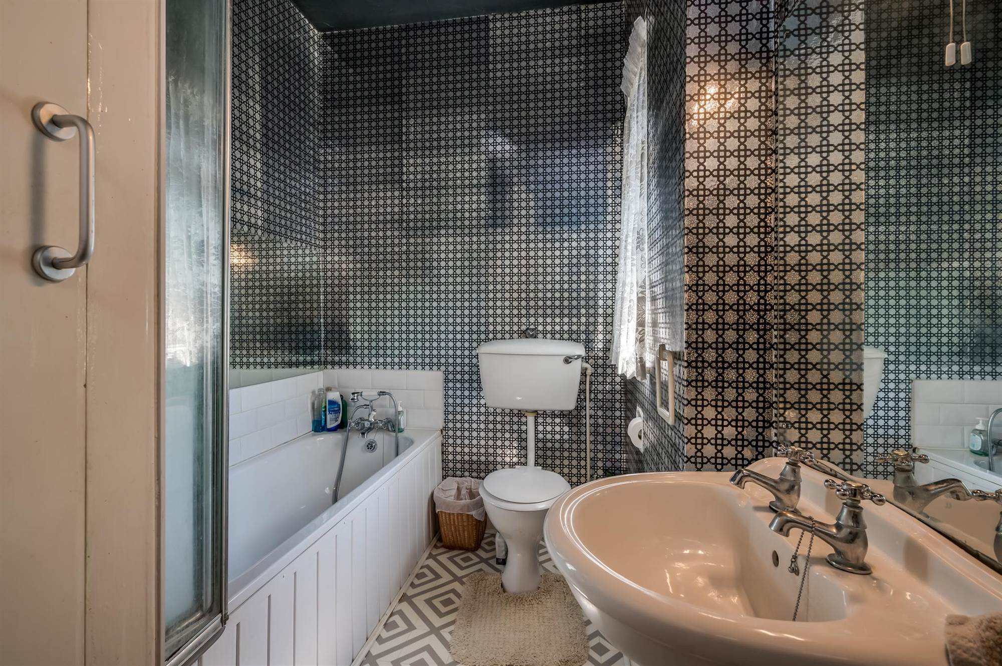 White suite comprising panelled bath with Mira electric shower, shower screen, low flush wc, pedestal wash hand basin, part tiled walls, tiled effect floor, shelved hotpress.