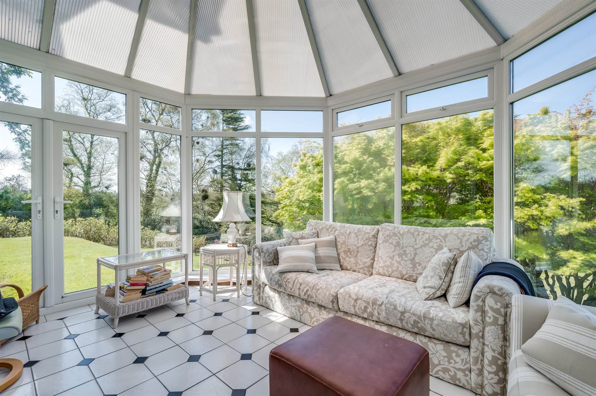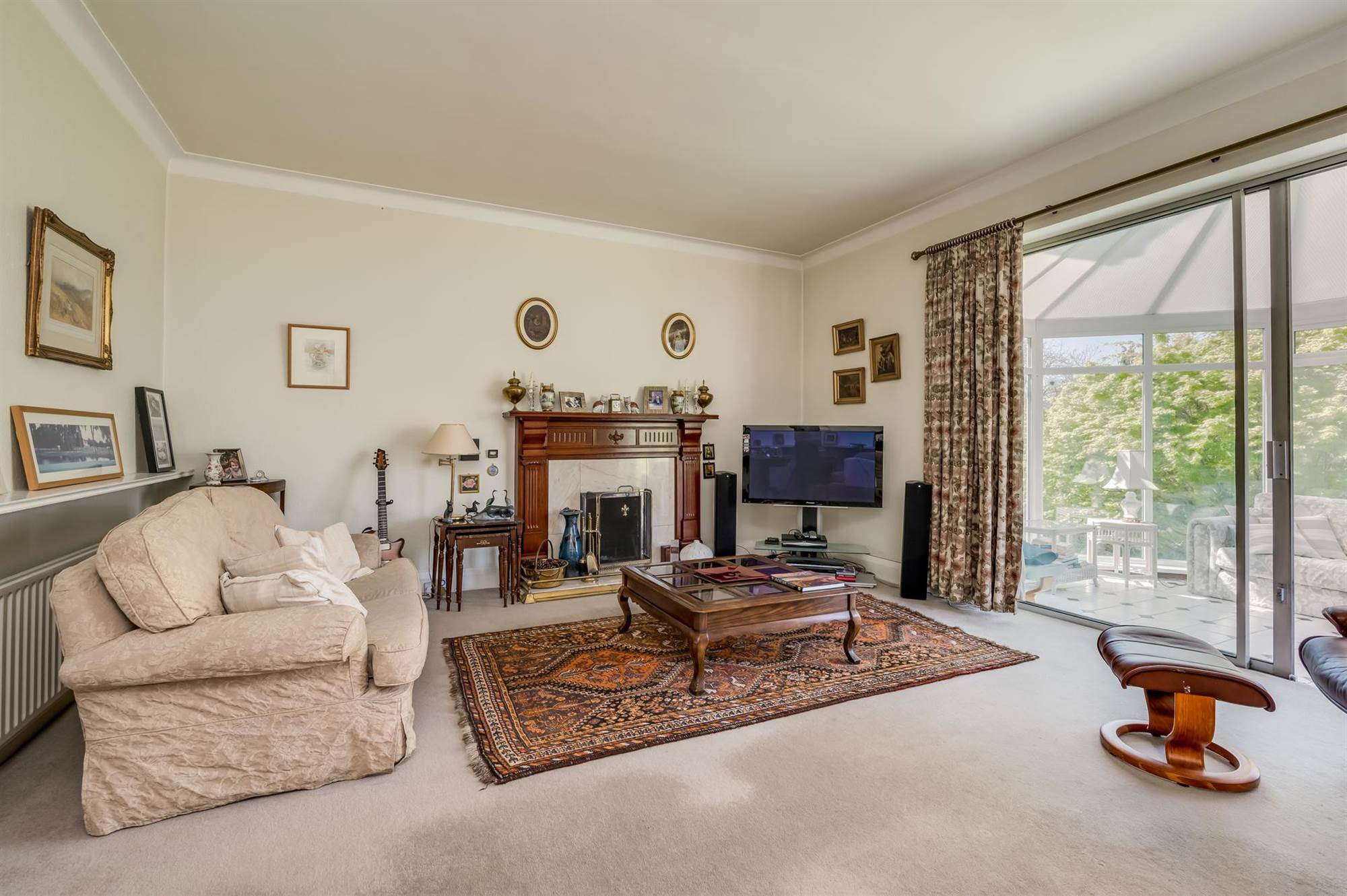 Spacious Drawing Room With Carved Wood Fireplace Leading To Conservatory Overlooking Gardens
