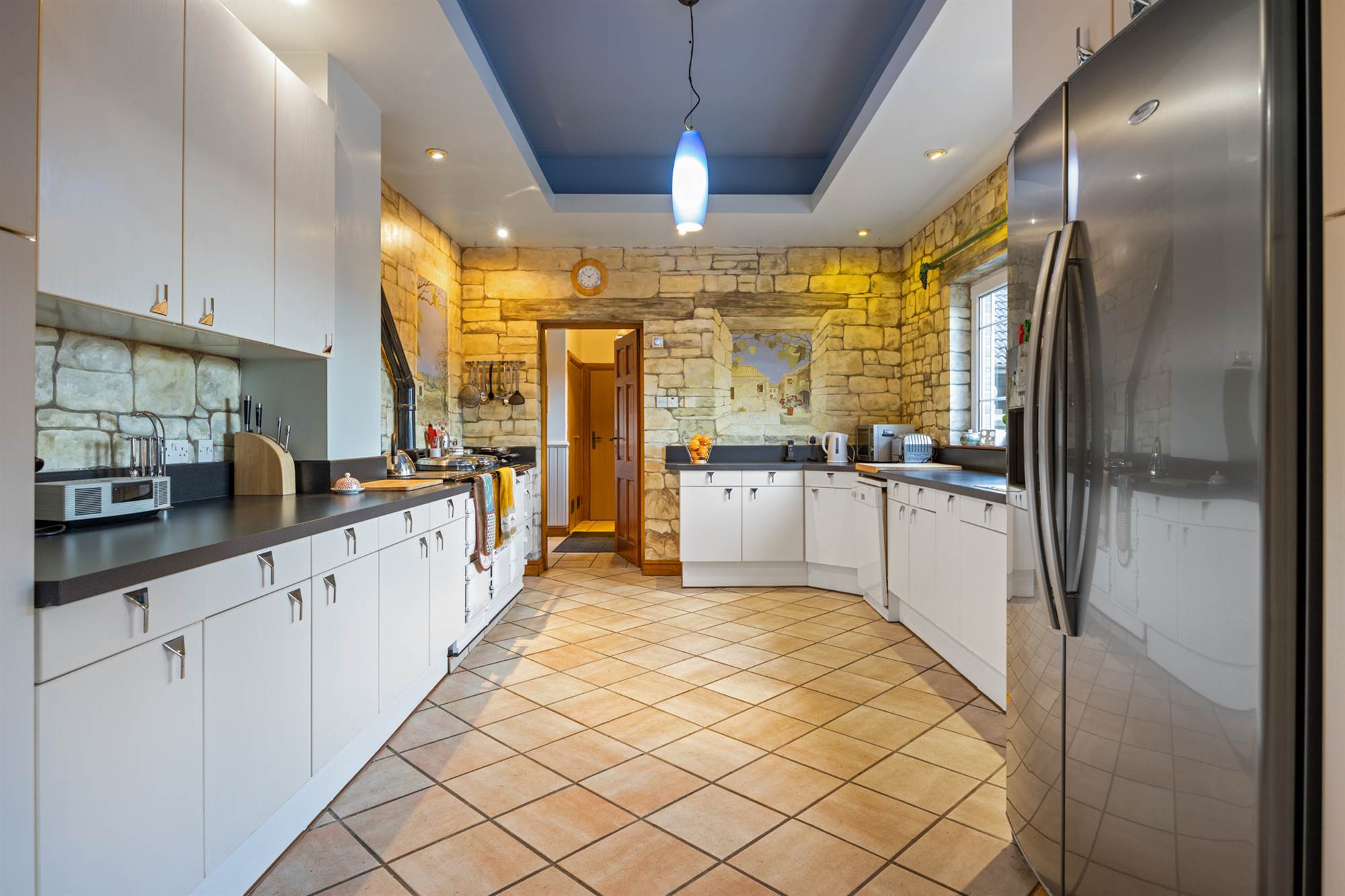 Range of high and low level units, inset sink, Aga Range,dishwasher, recess for American style fridge freezer, tiled floor