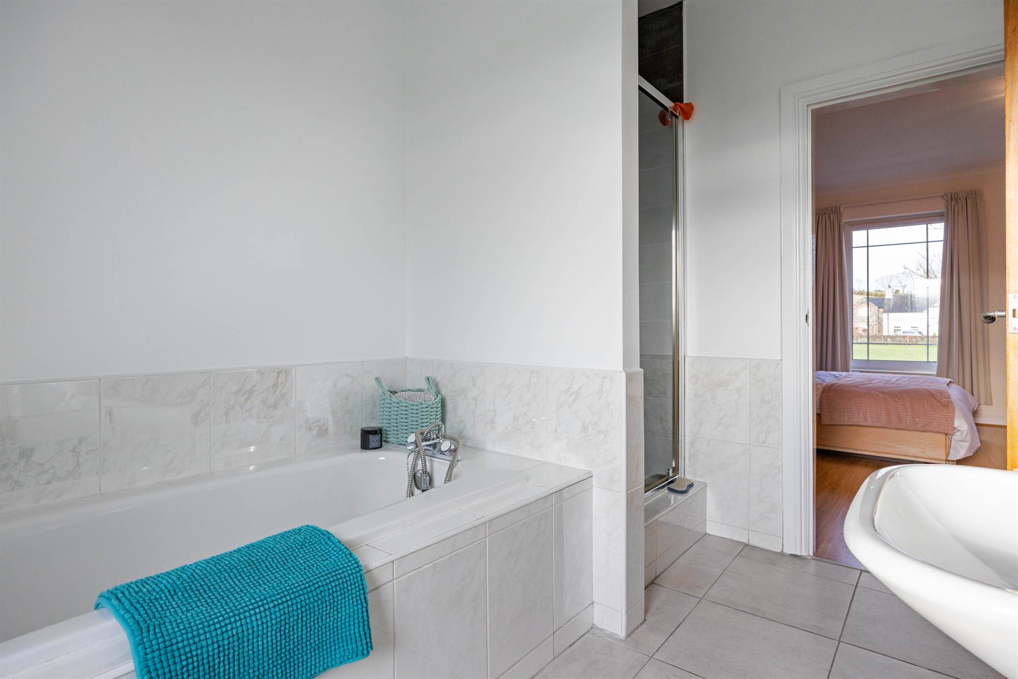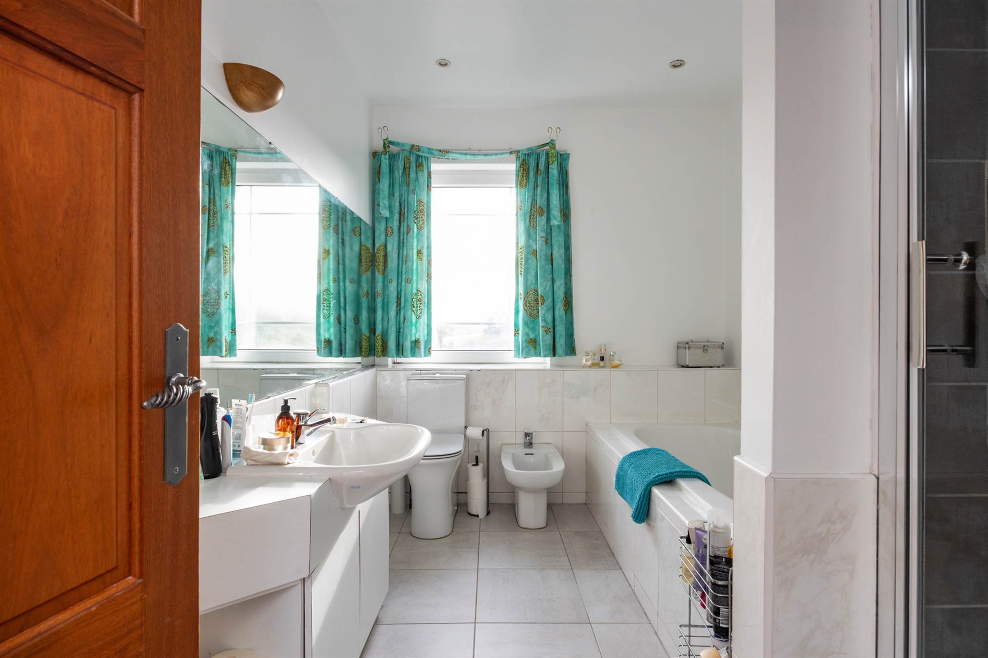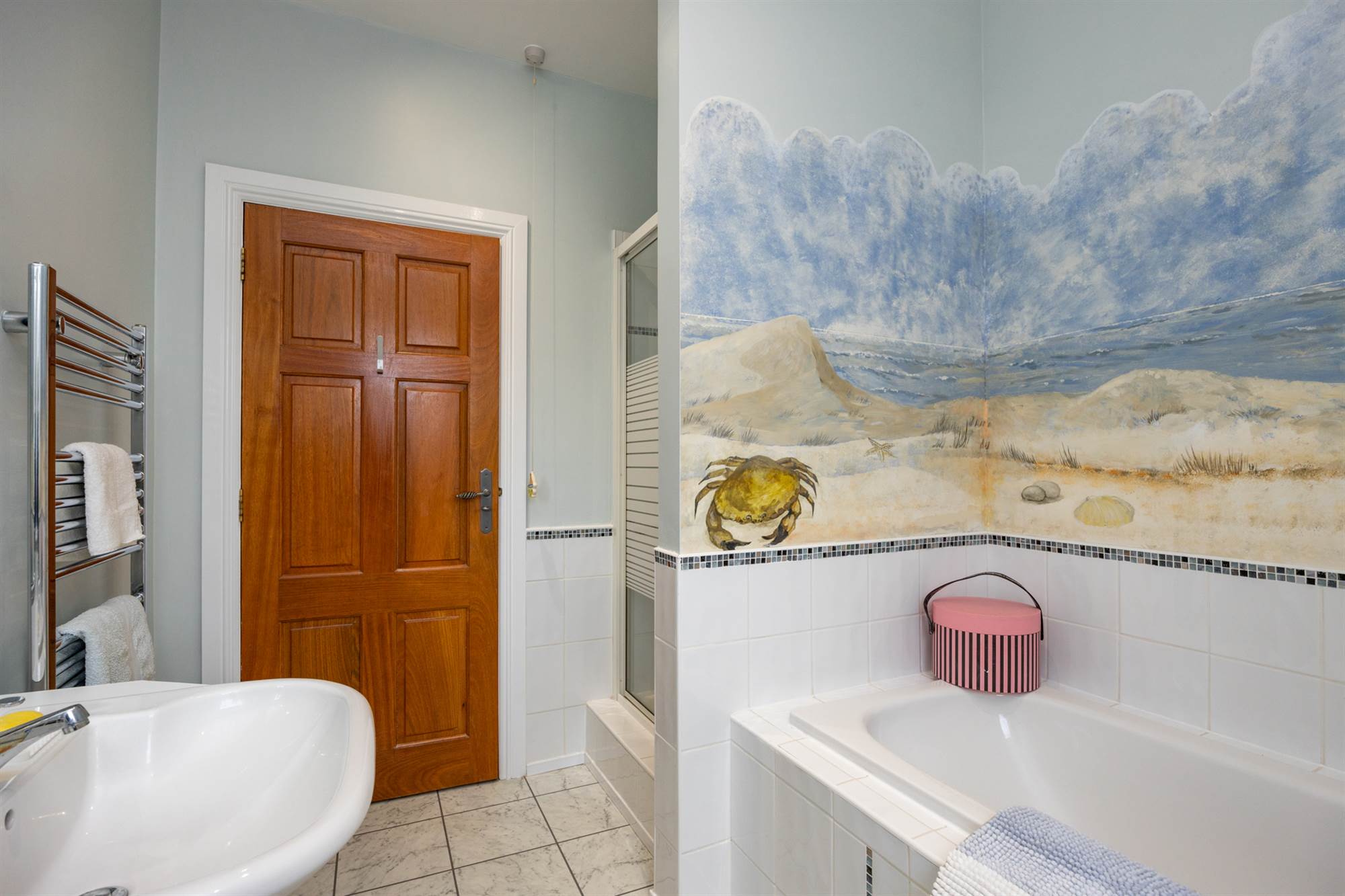 White suite, panelled bath, mixer taps, shower enclosure, low flush WC, wash hand basin with vanity unit, bidet