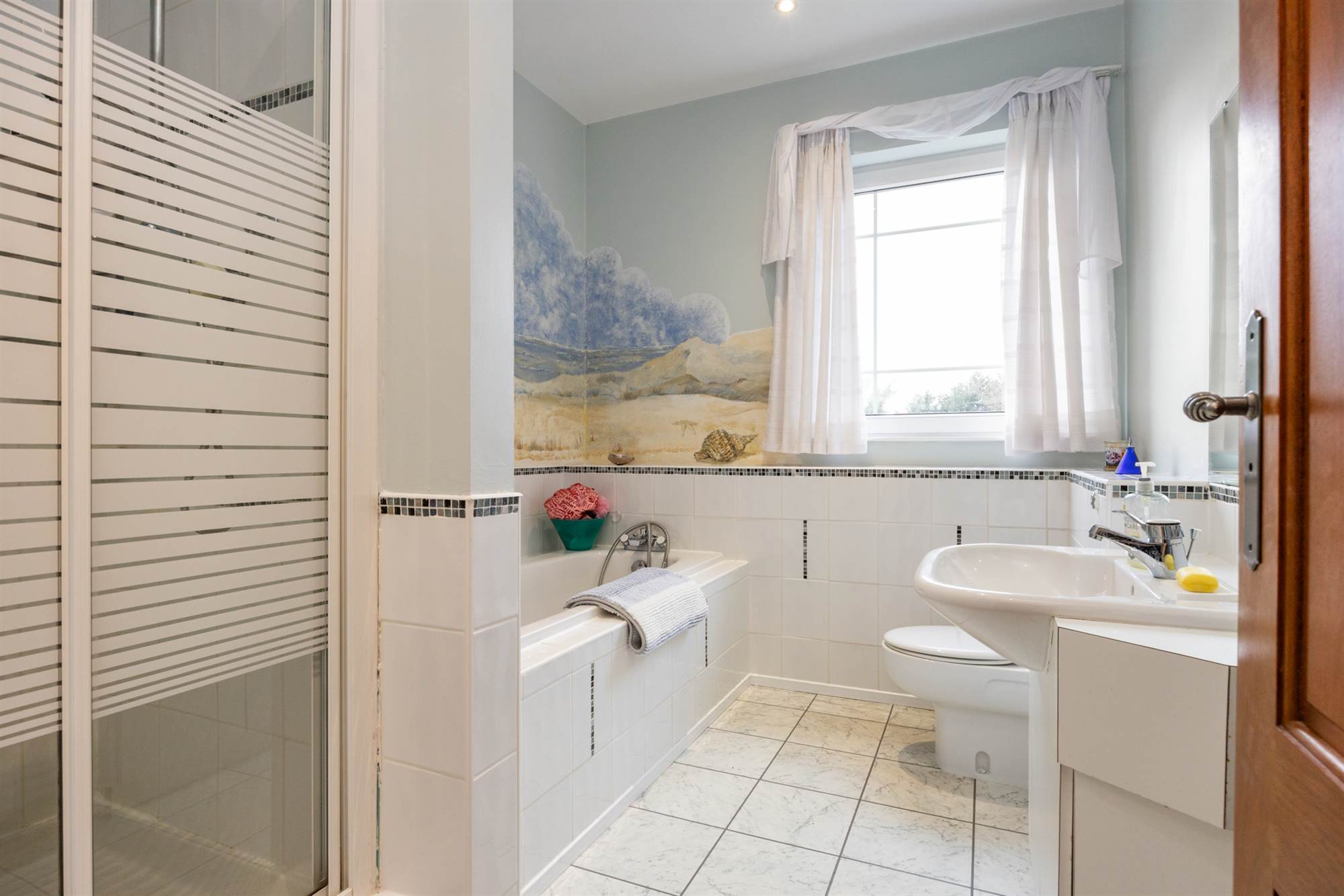 White suite, panelled bath, mixer taps, shower enclosure, low flush WC, wash hand basin with vanity unit