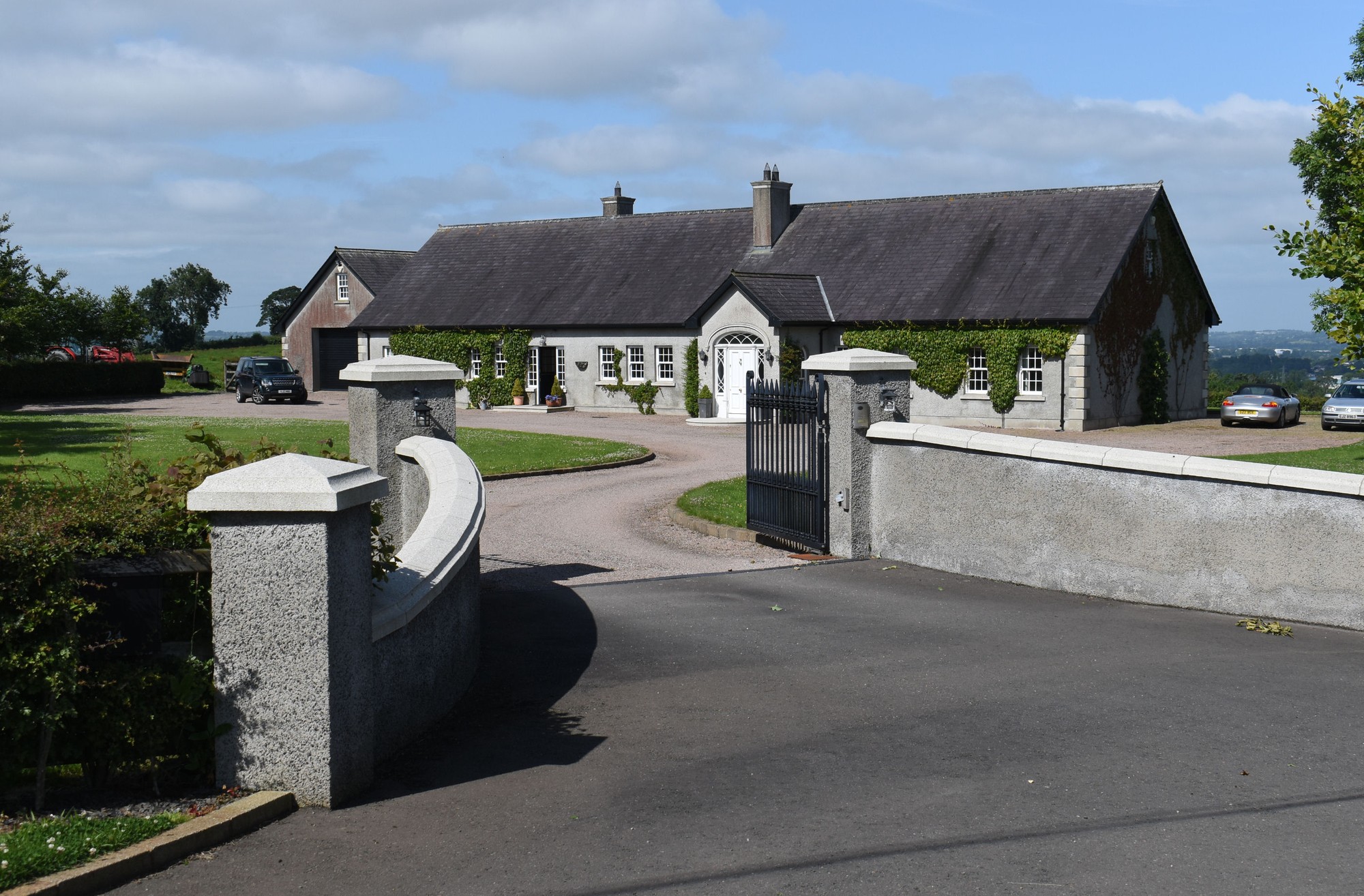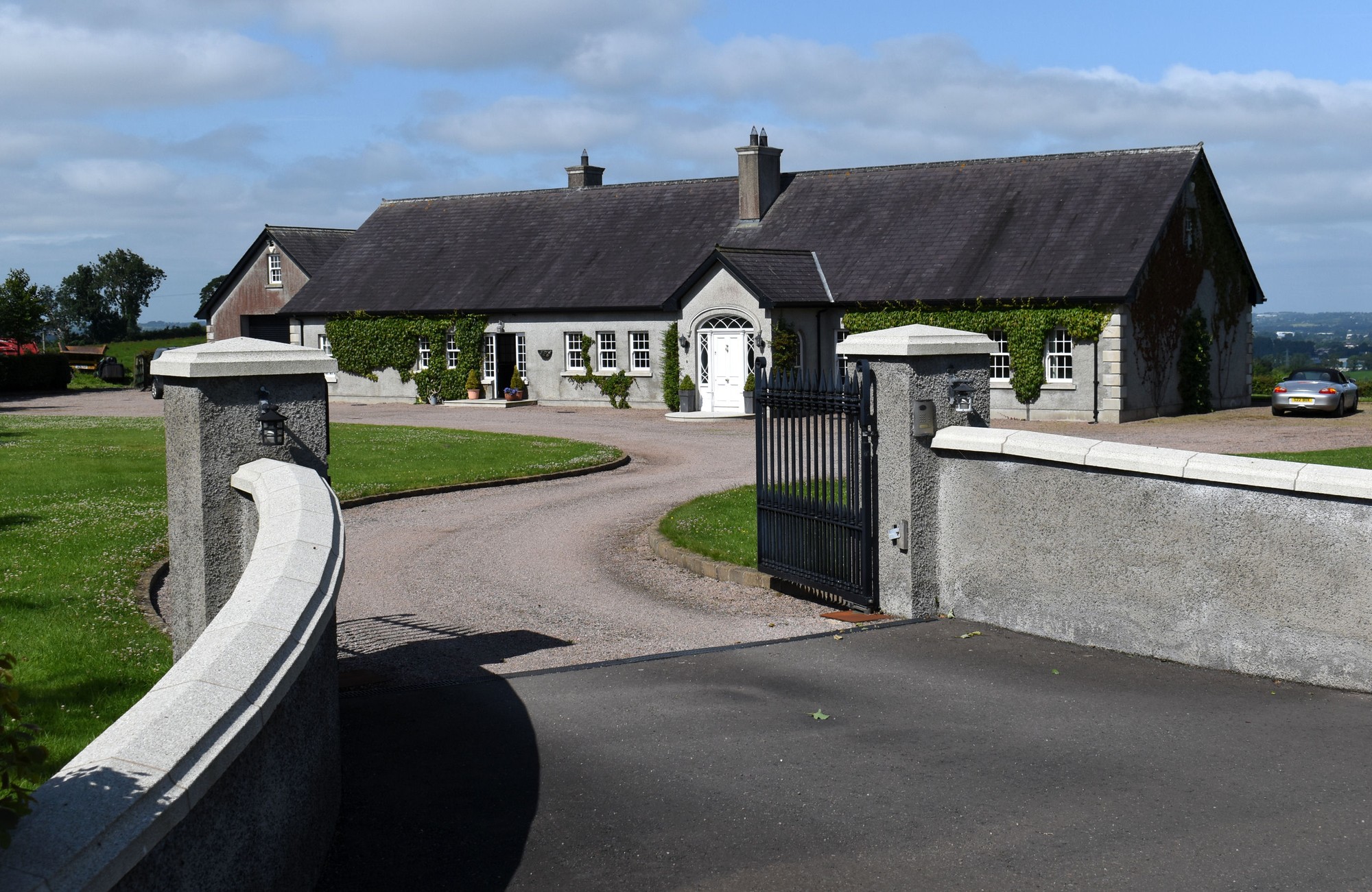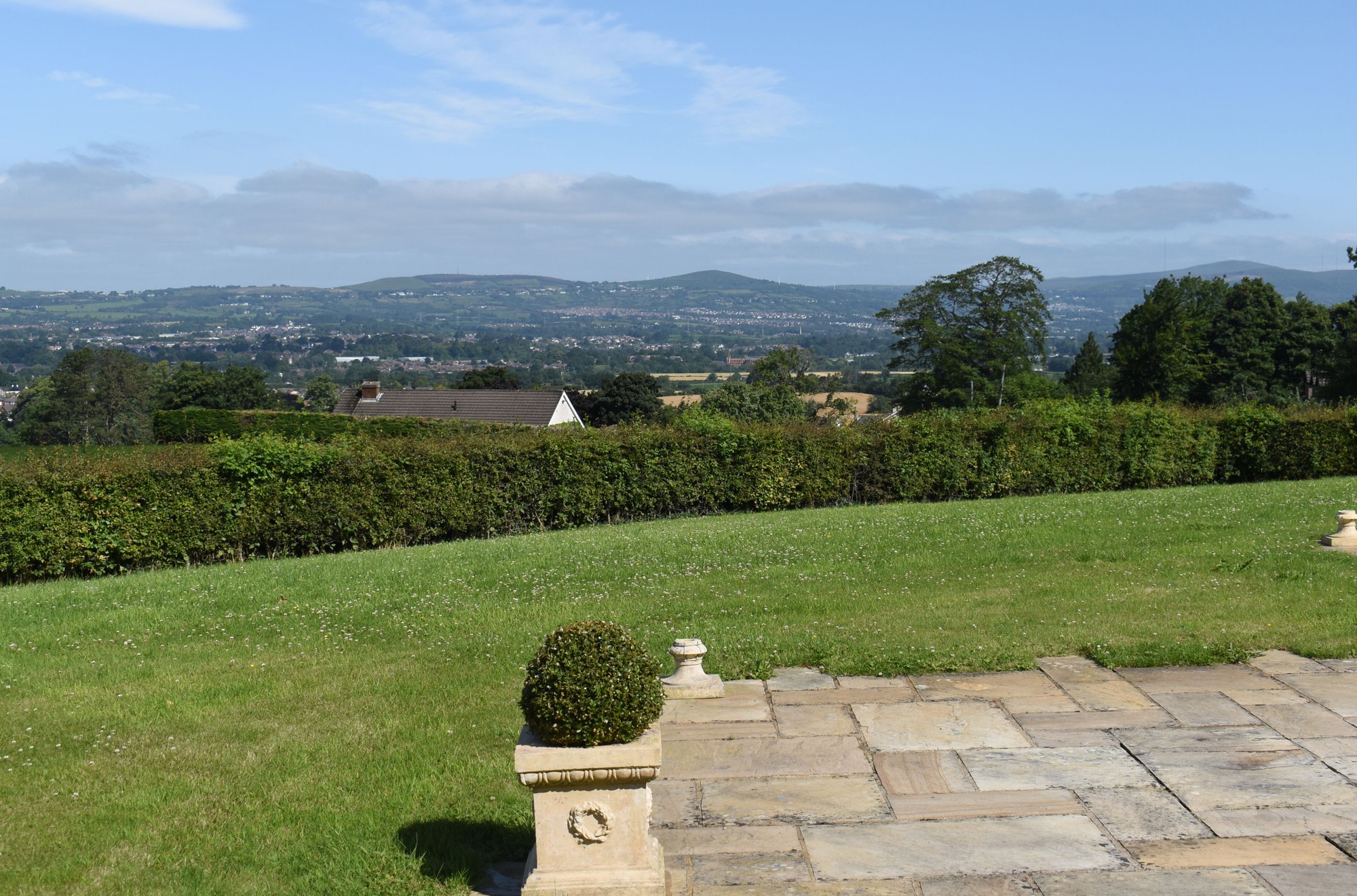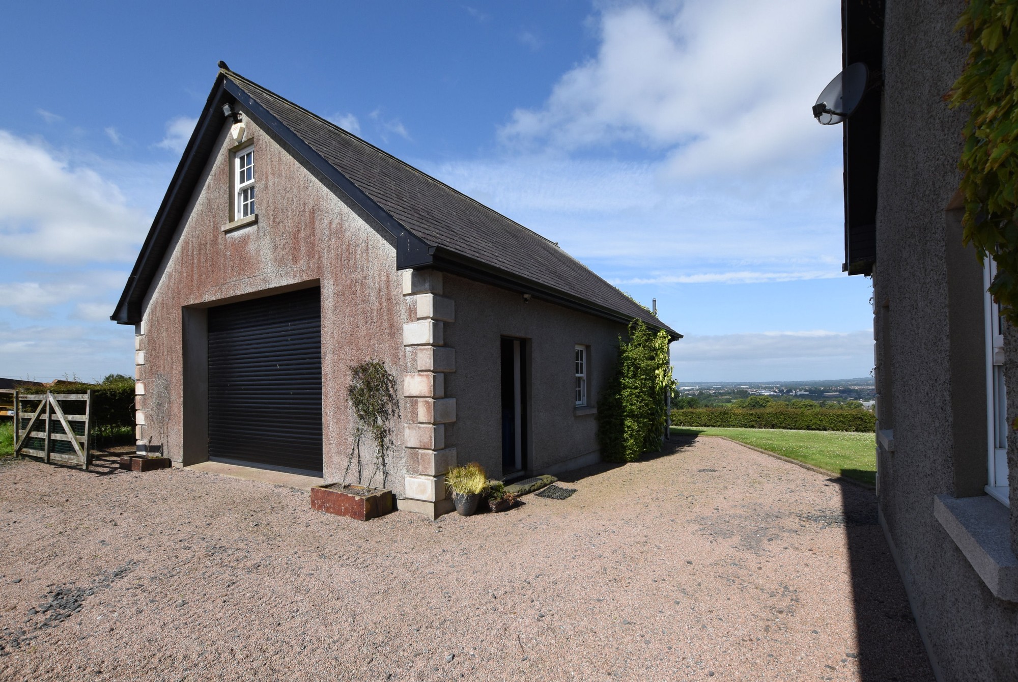 Double entrance pillars with electric gates which lead to beautiful enclosed gardens which offer spectacular elevated views over the city of Lisburn and beyond.