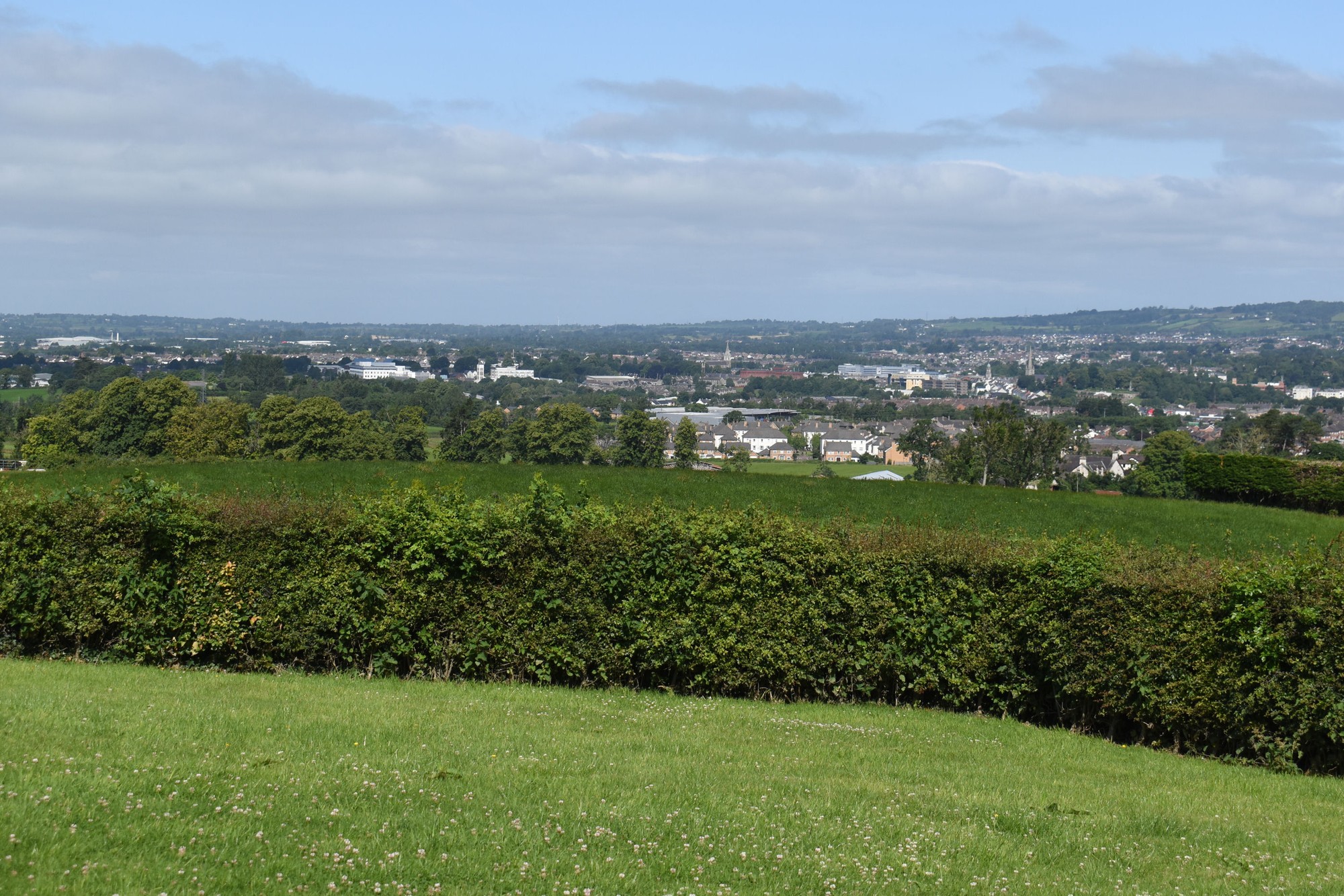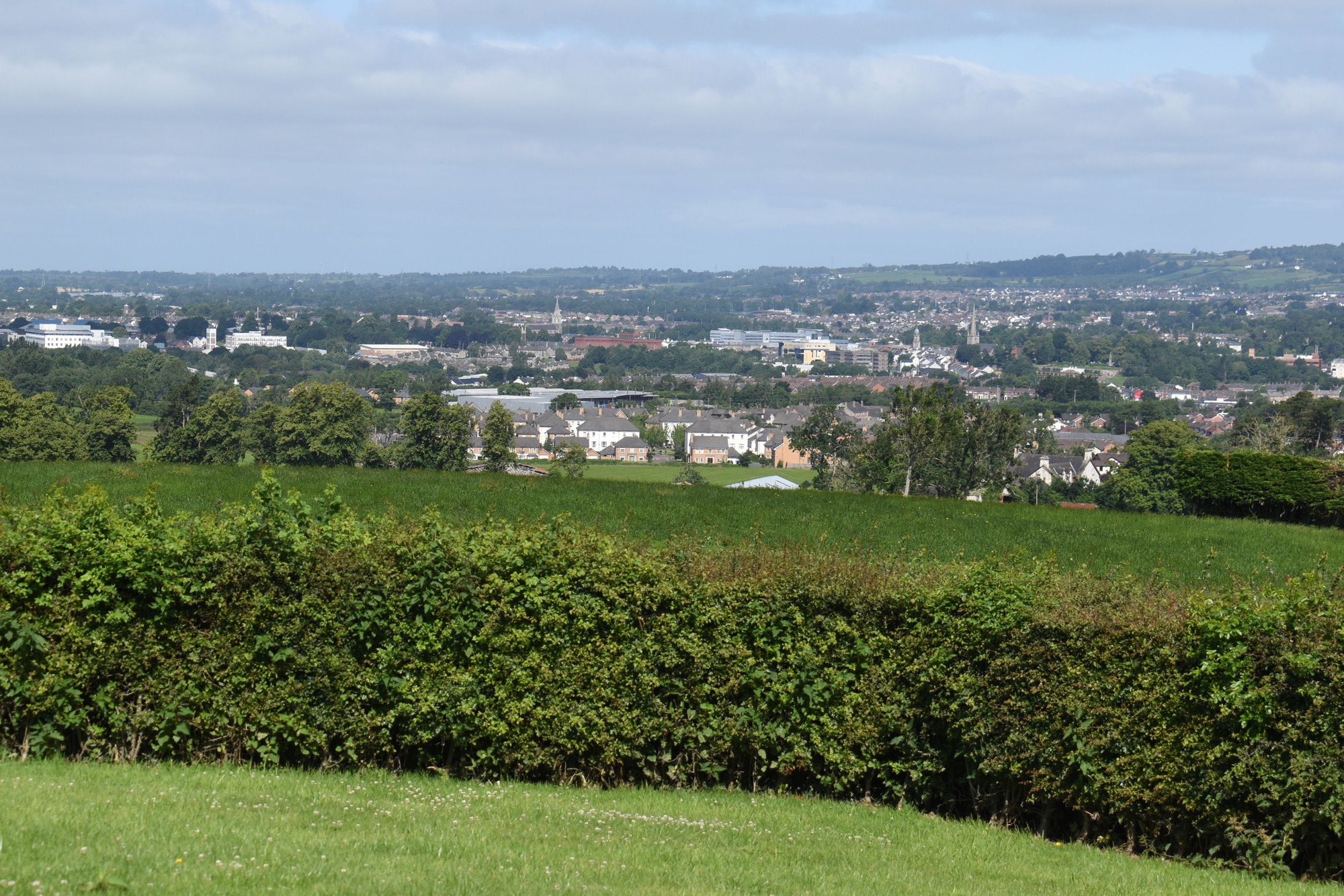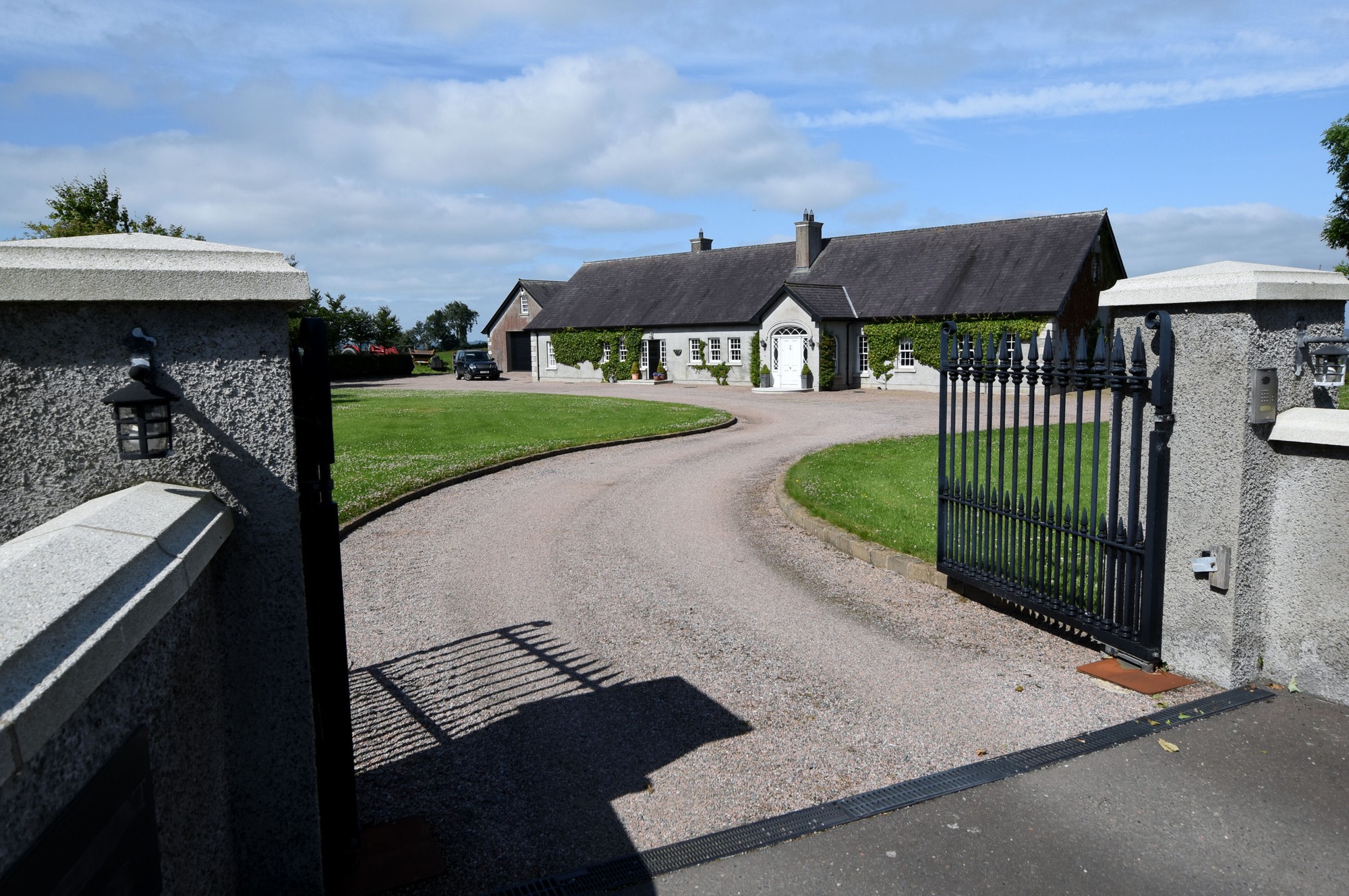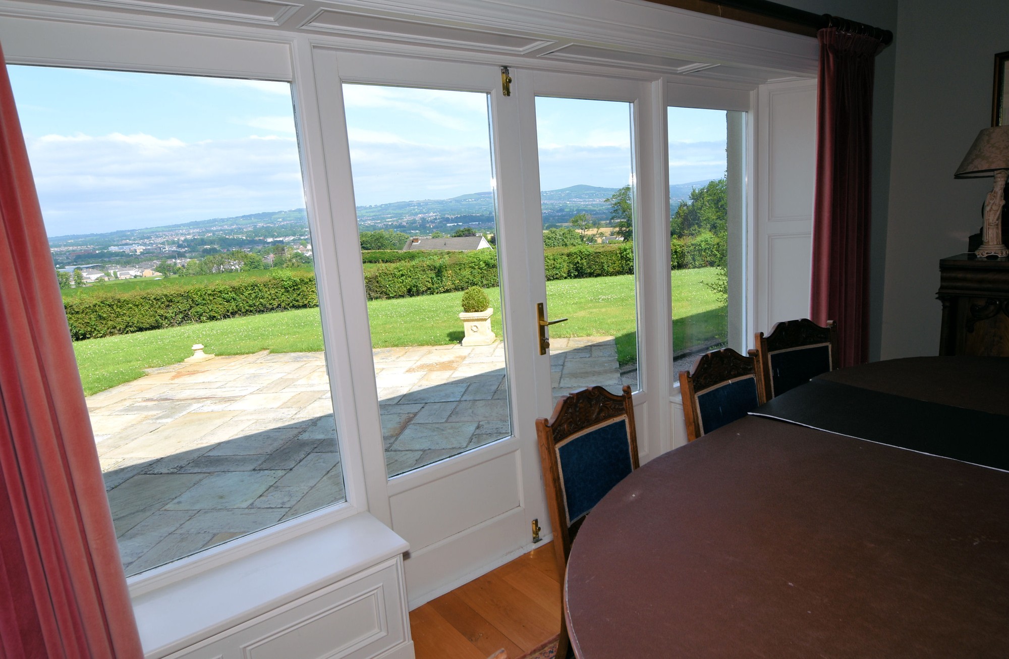 Double entrance pillars with electric gates which lead to beautiful enclosed gardens which offer spectacular elevated views over the city of Lisburn and beyond.
