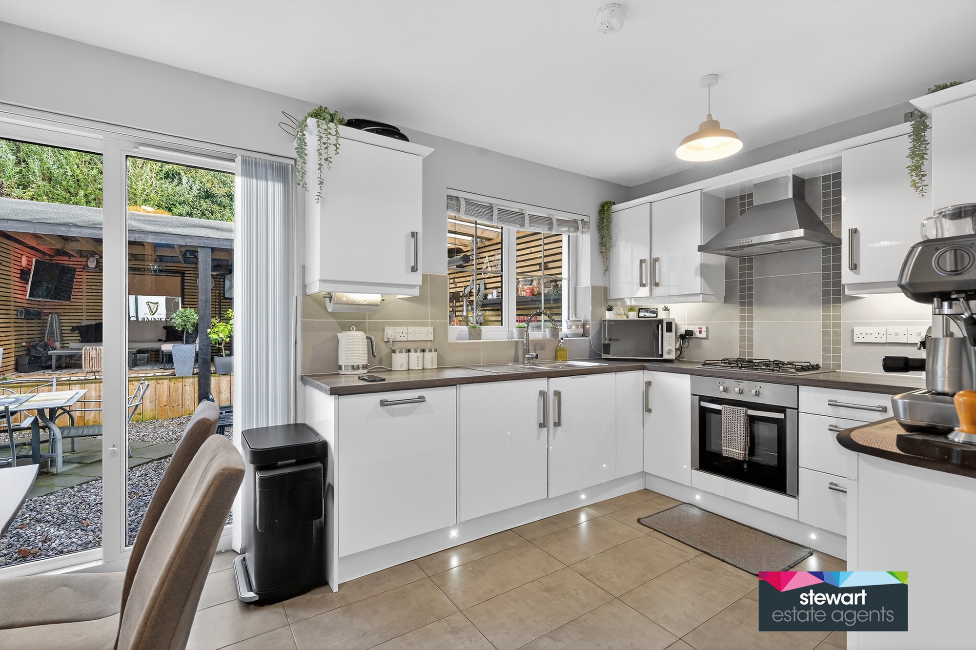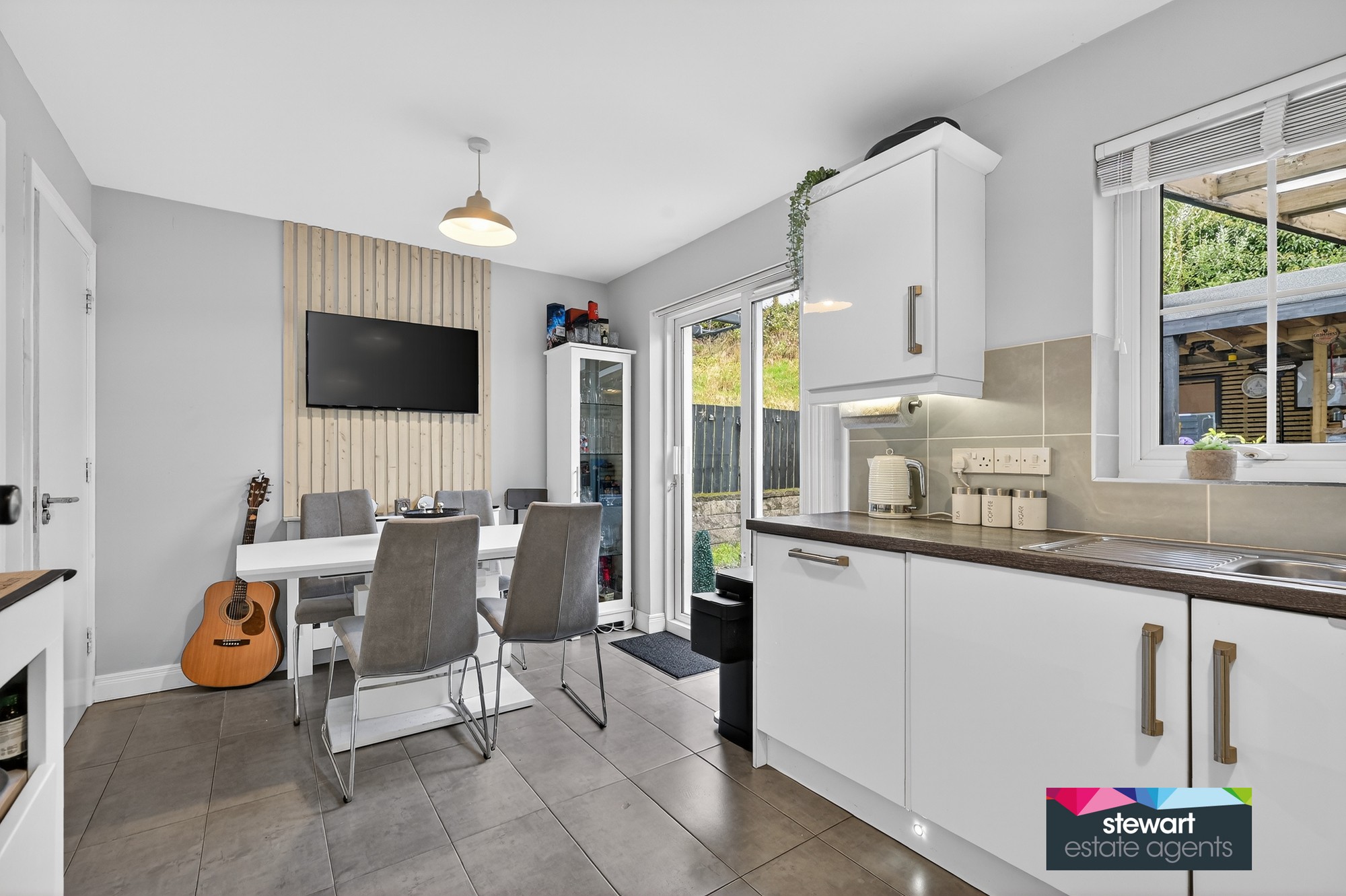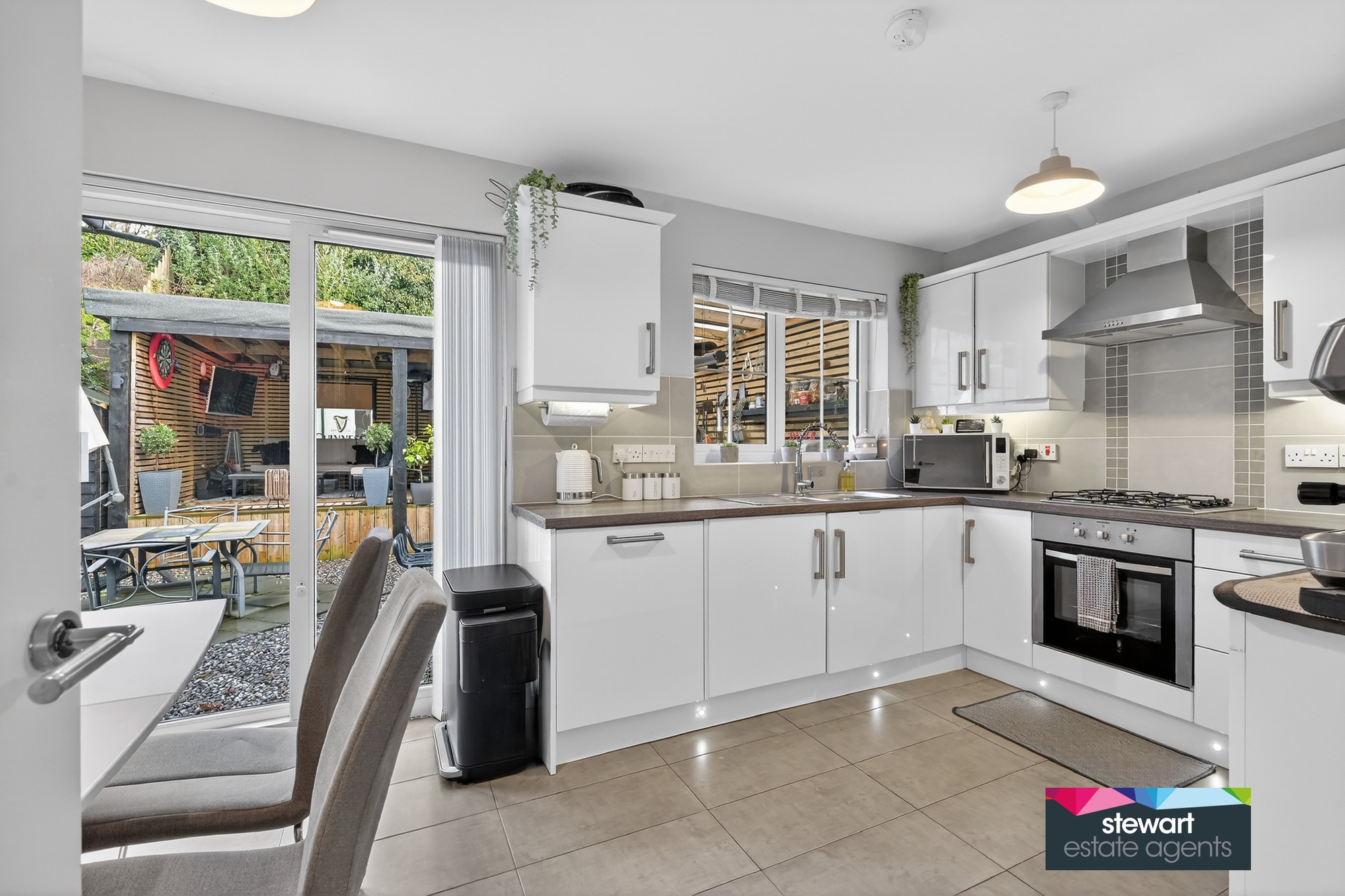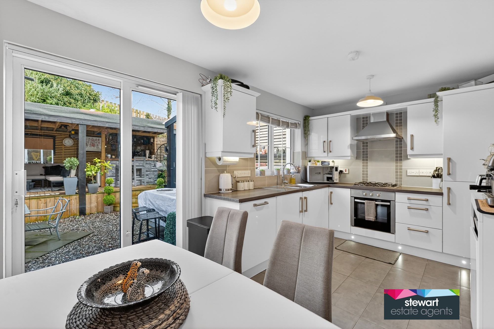 Open plan kitchen with dining area and sliding doors to the rear garden
