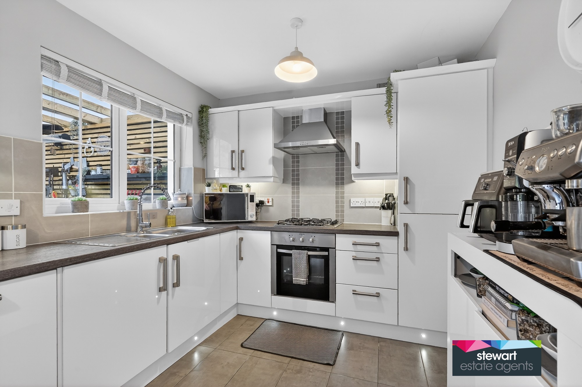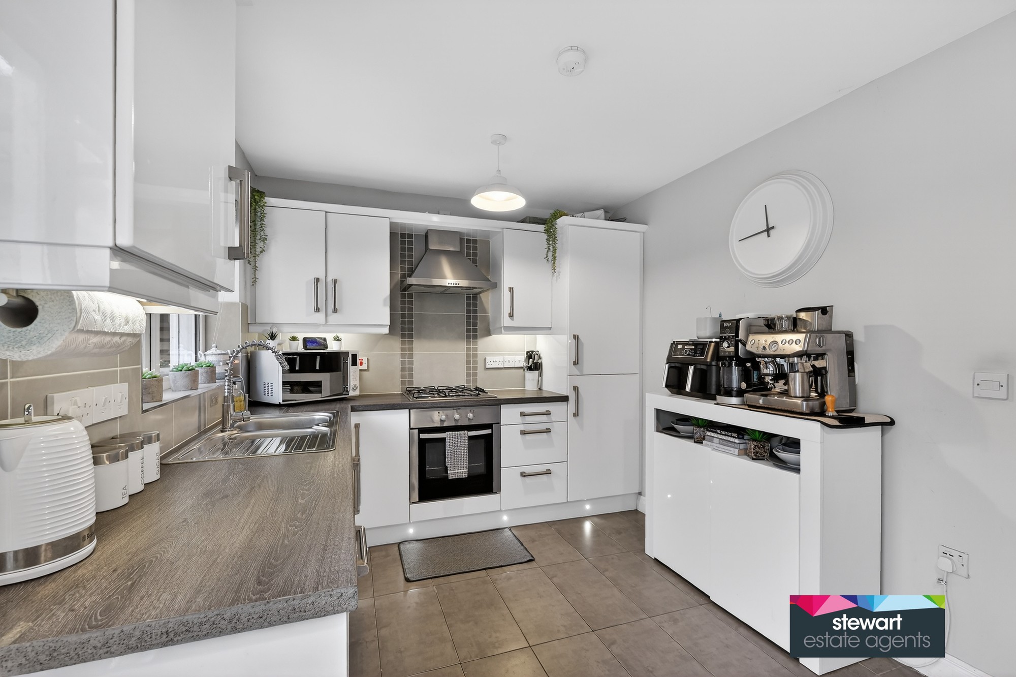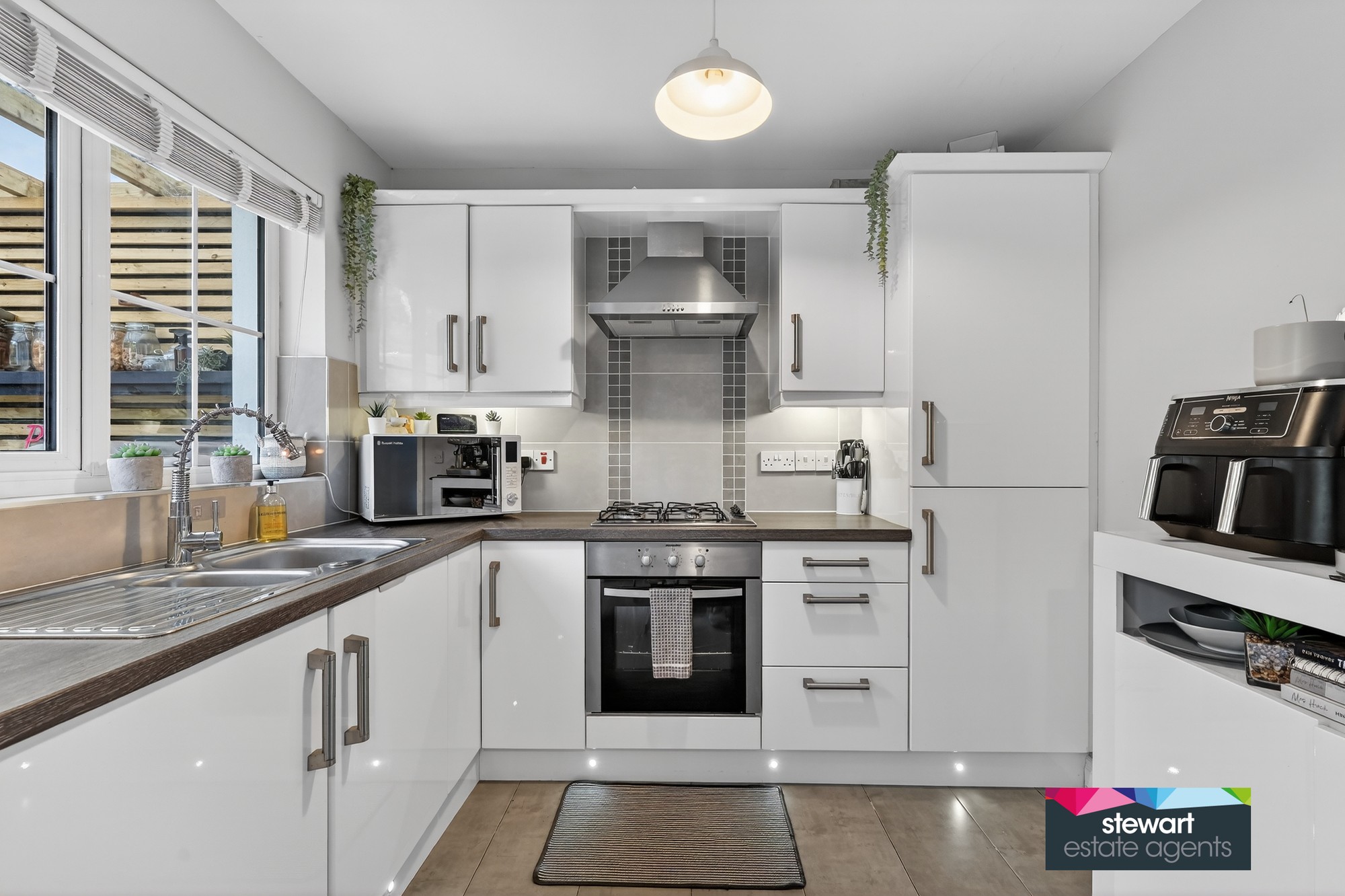 Contemporary style white fitted kitchen with a good range of high and low level storage cabinets. Integrated oven and inset hob with extractor fan above. Built in dishwasher. Built in fridge/freezer