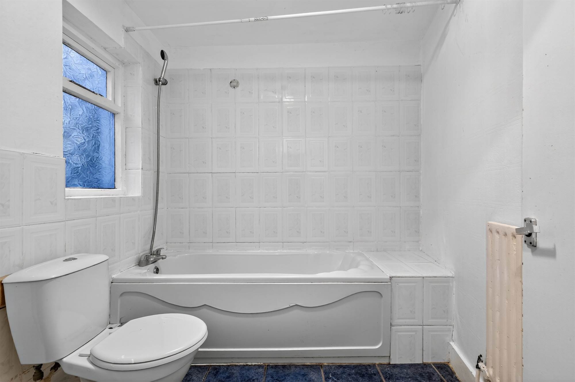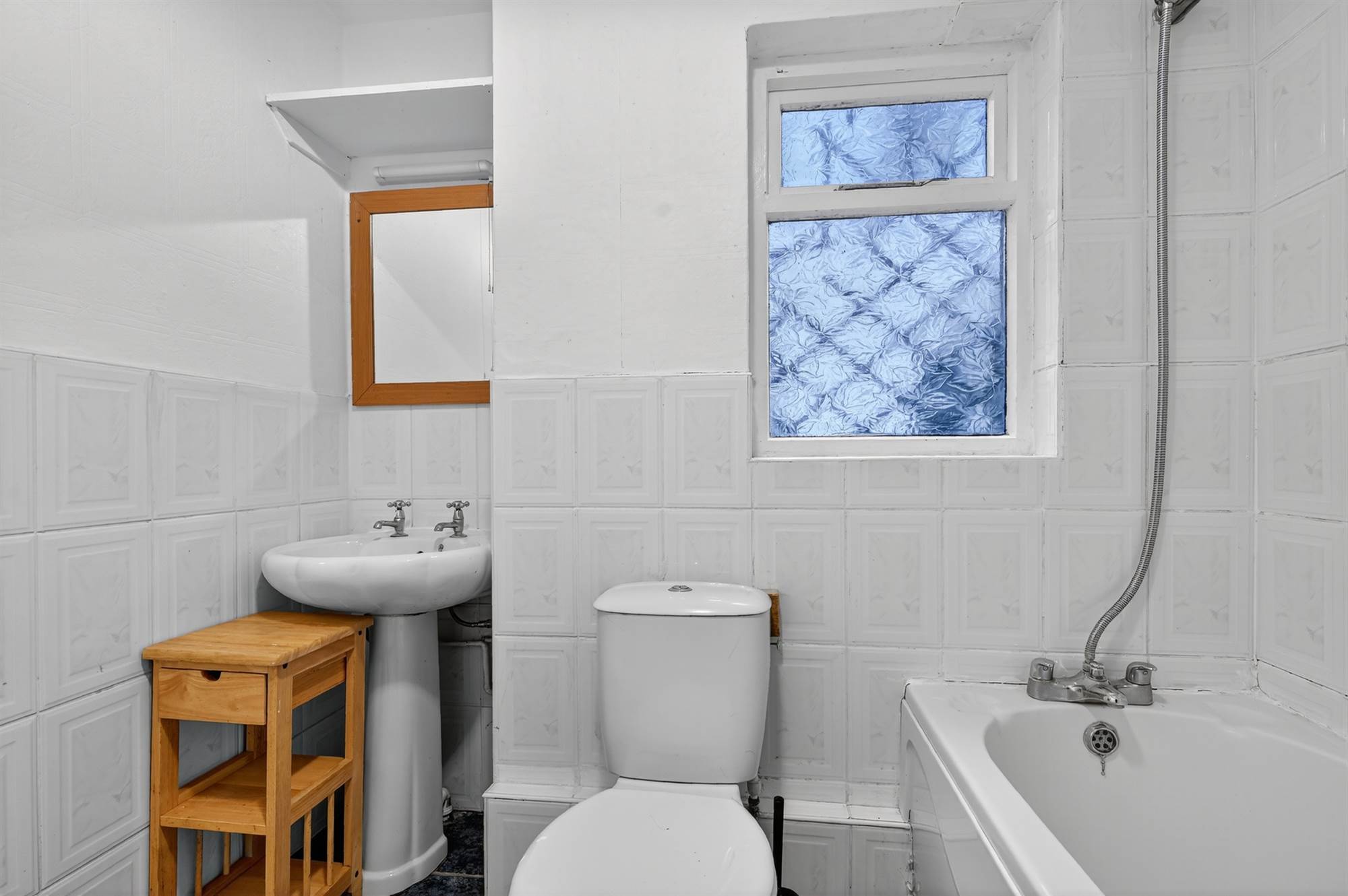 White suite comprising low flush wc, pedestal wash hand basin, panelled bath with shower over, part tiled walls, ceramic tiled floor, extractor fan.