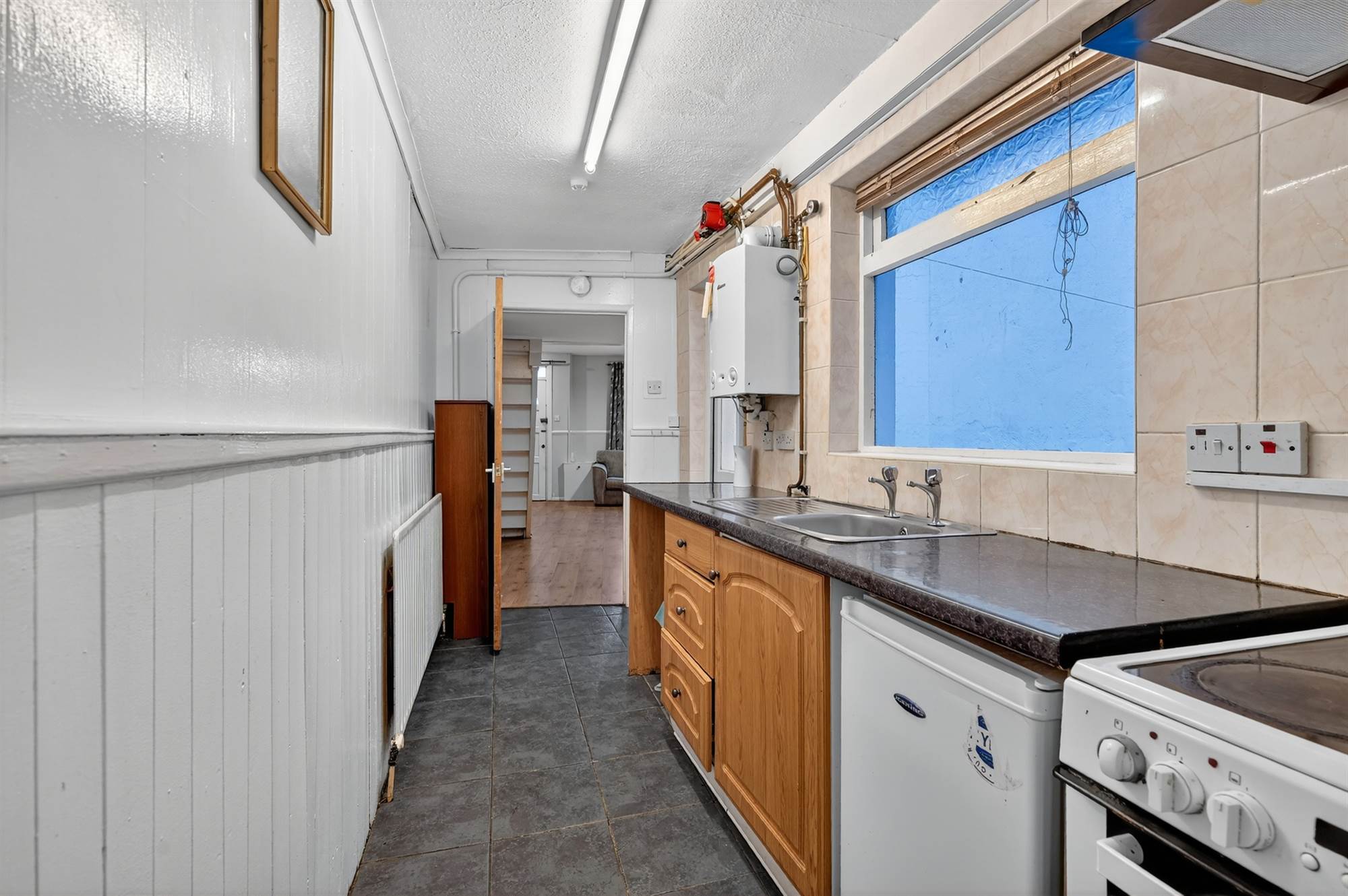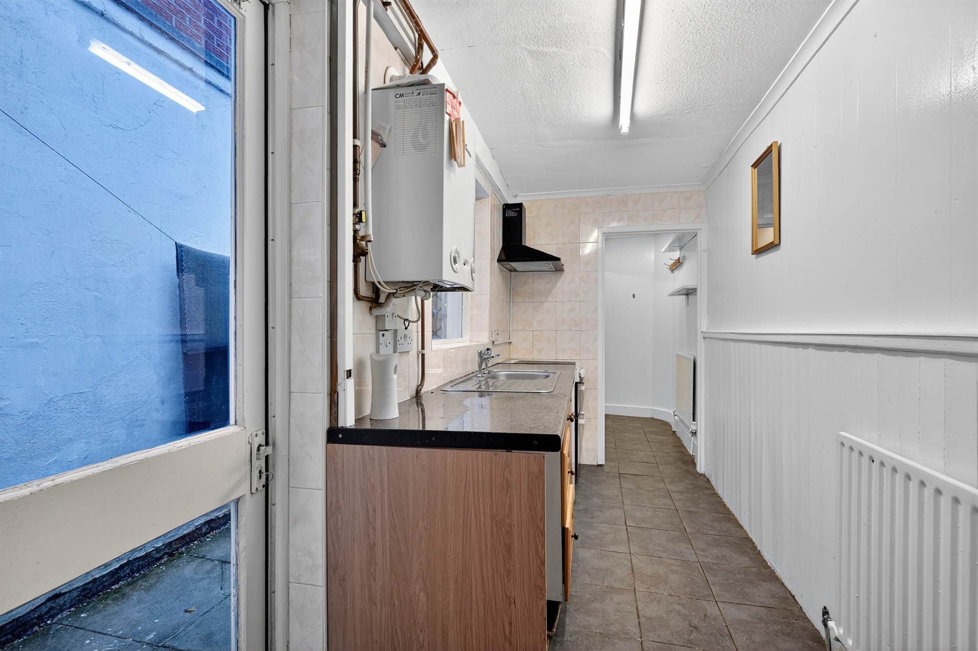 (at widest points). Range of high and low level units, work surfaces, single drainer stainless steel sink unit, space for fridge, space for cooker with extractor fan above, plumbed for washing machine, part tiled walls, ceramic tiled floor, Worcester gas boiler, glazed door to yard.