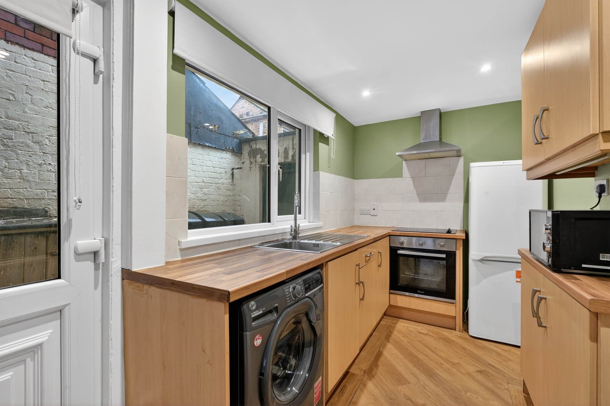 Range of high and low level units, built in oven, ceramic hob and extractor, stainless steel sink with mixer tap, laminate worksurfaces, LVT laminate flooring.