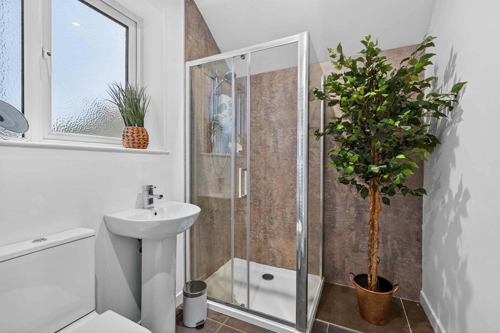 Newly fitted first floor shower room with contemporary white suite