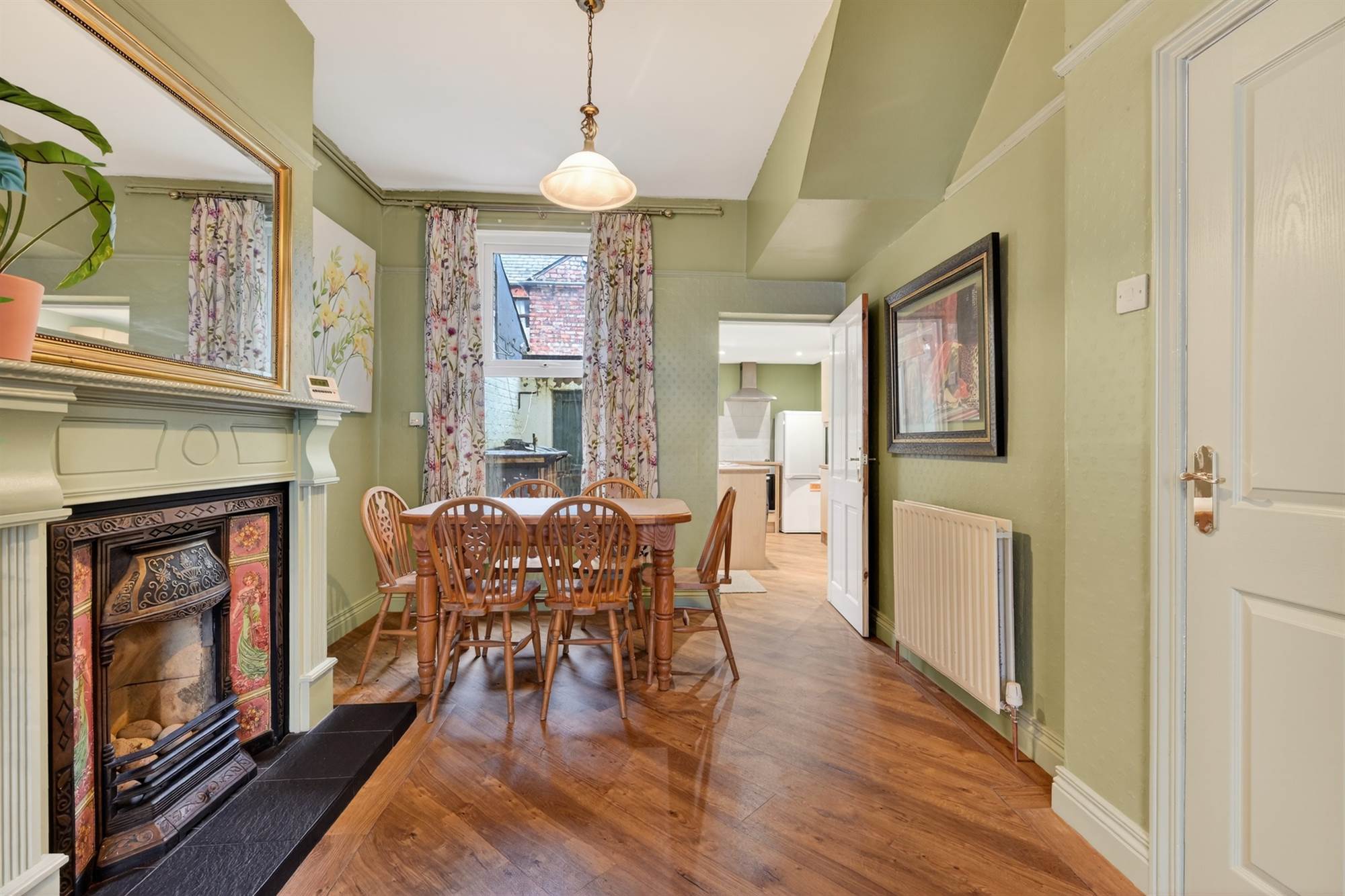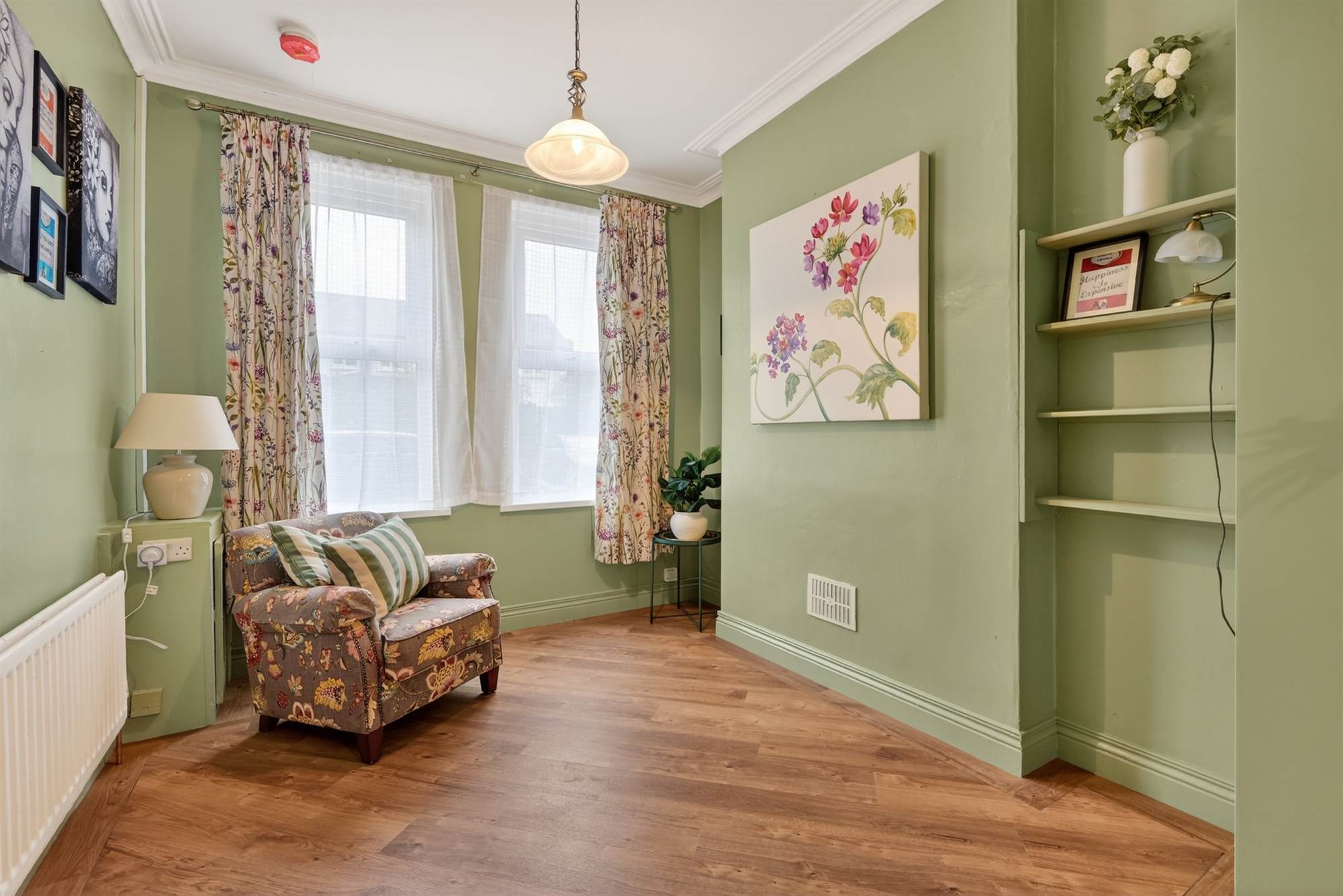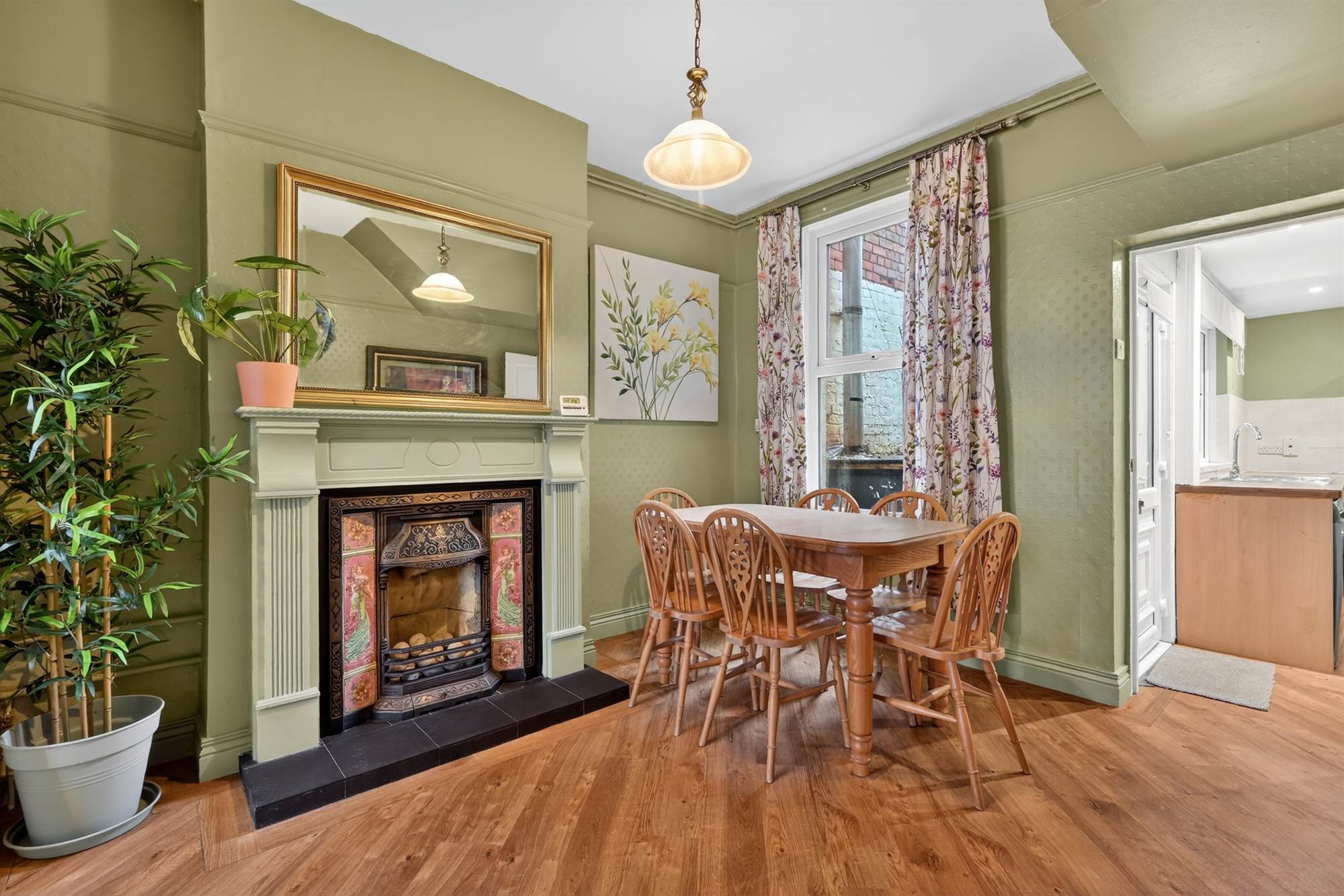 Feature fireplace with hardwood surround and tiled hearth, LVT laminate flooring.