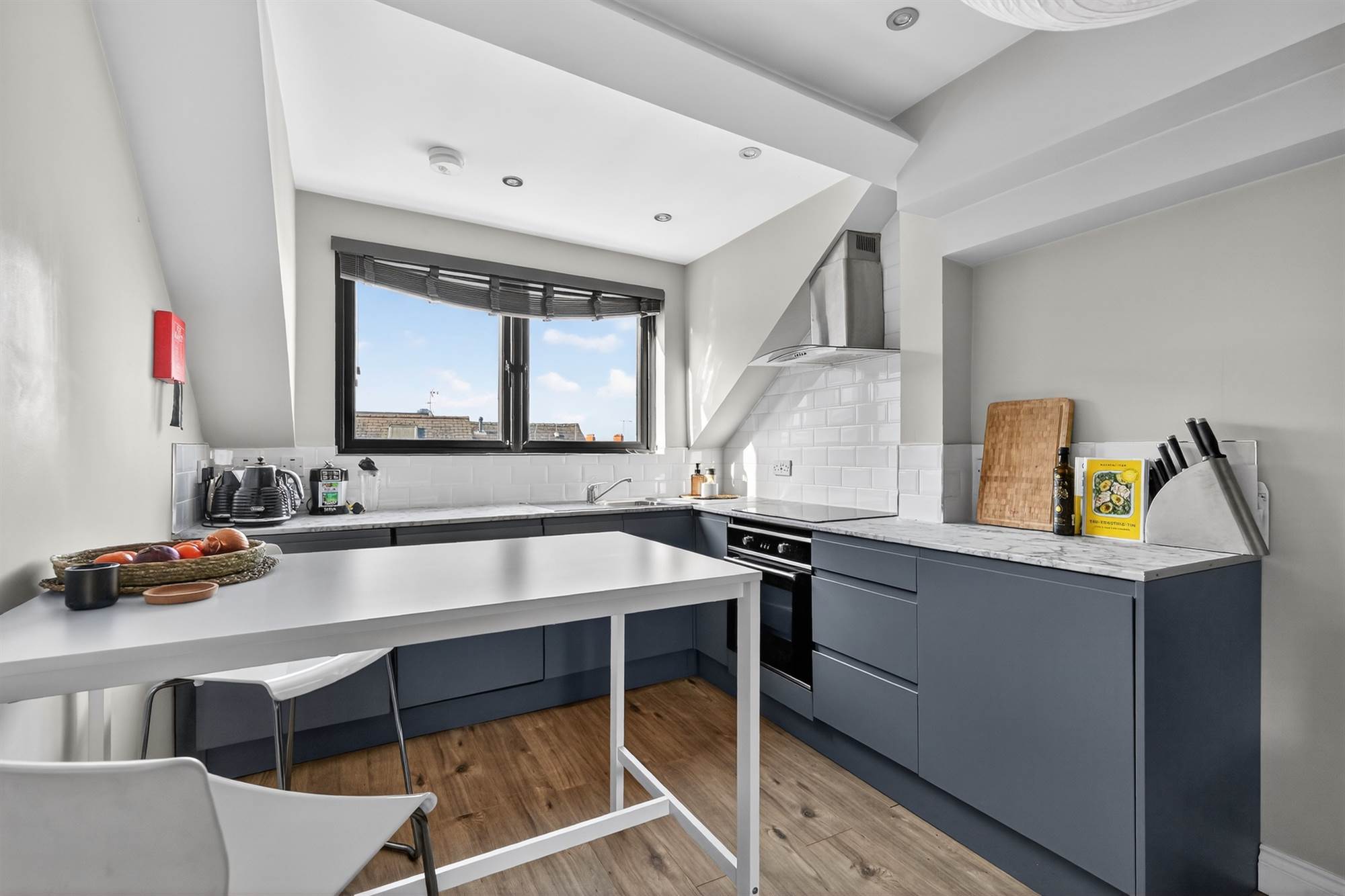 The accommodation is bright and well presented, comprising an entrance hall, a spacious open plan L-shaped kitchen, living and dining area, one double bedroom, and a modern shower room.