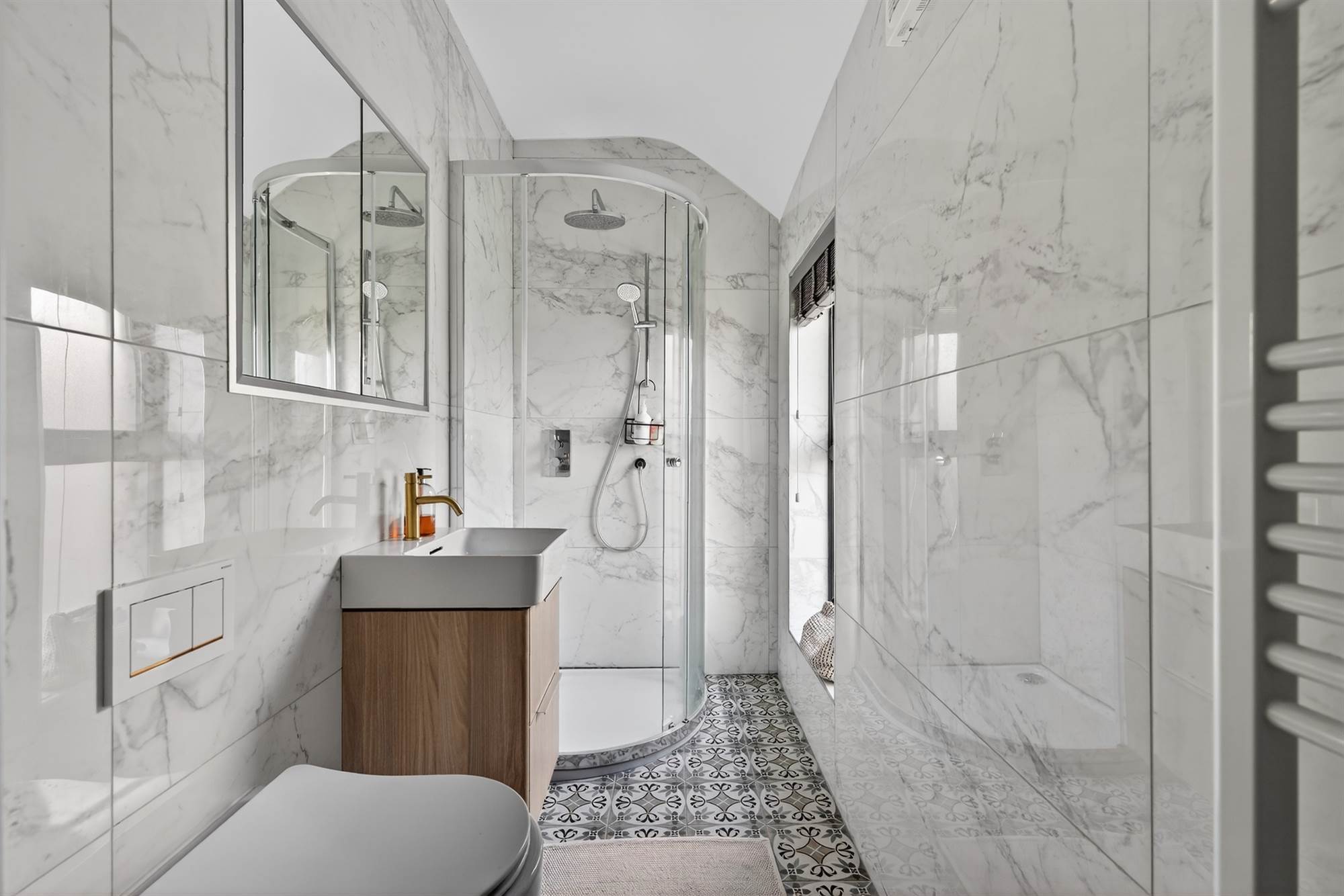 Low flush wc, vanity unit with wash hand basin, shower with drencher shower head, heated towel rail, extractor fan. LED mirror with storage.