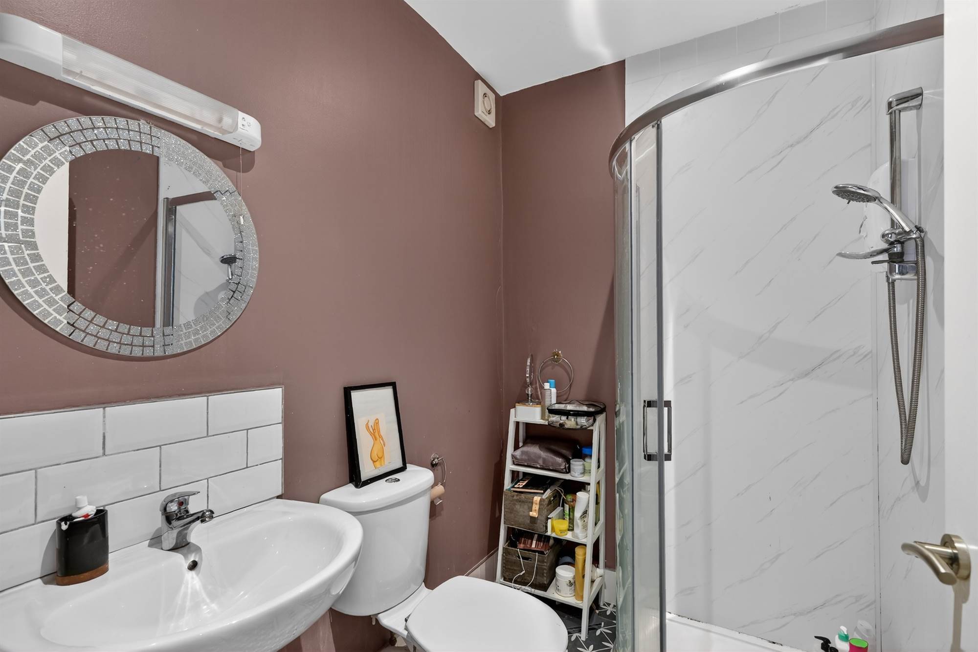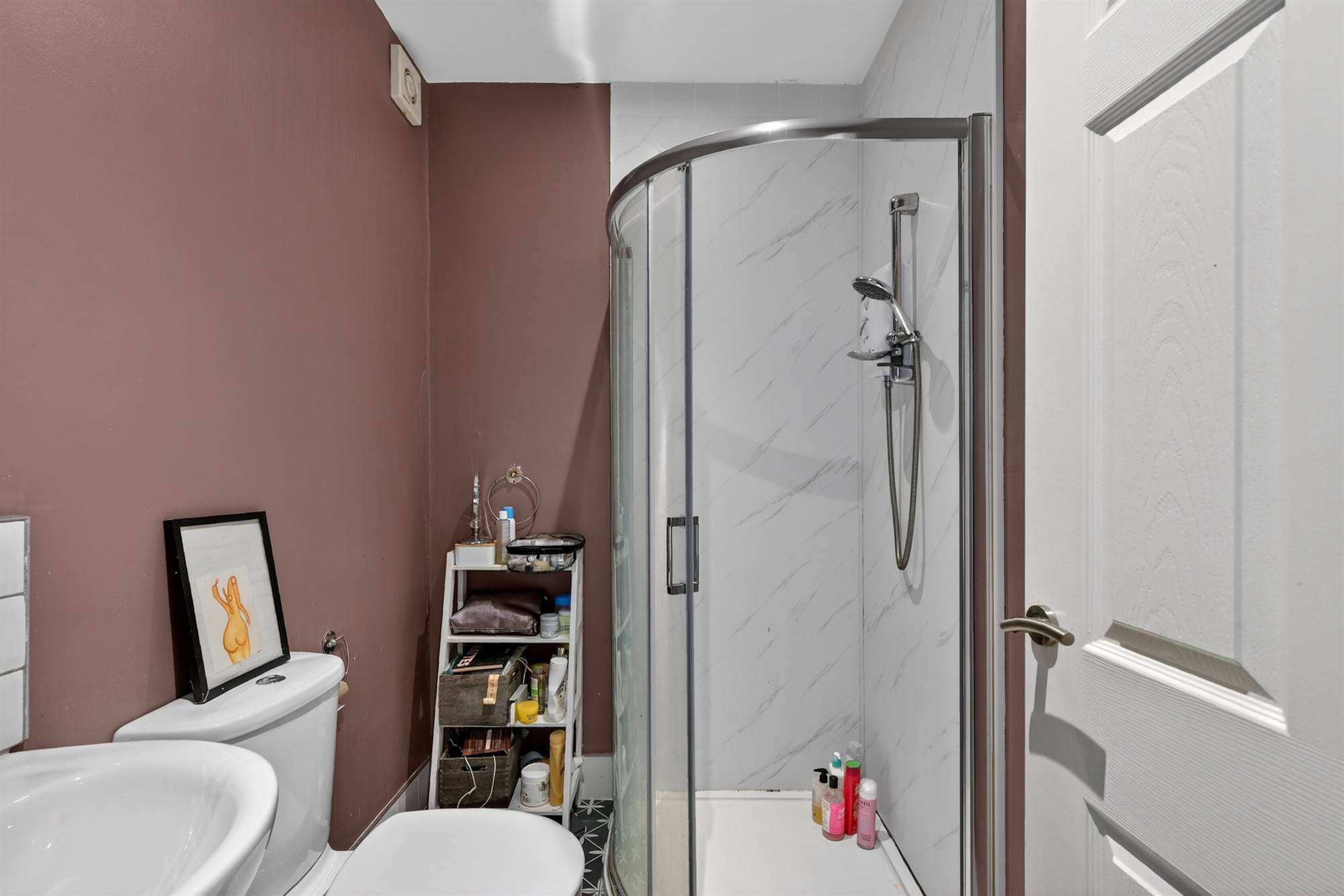 Recently fitted shower room with corner shower cubicle with electric Redring shower unit, low flush wc, wash hand basin, extractor fan, tiled floor.