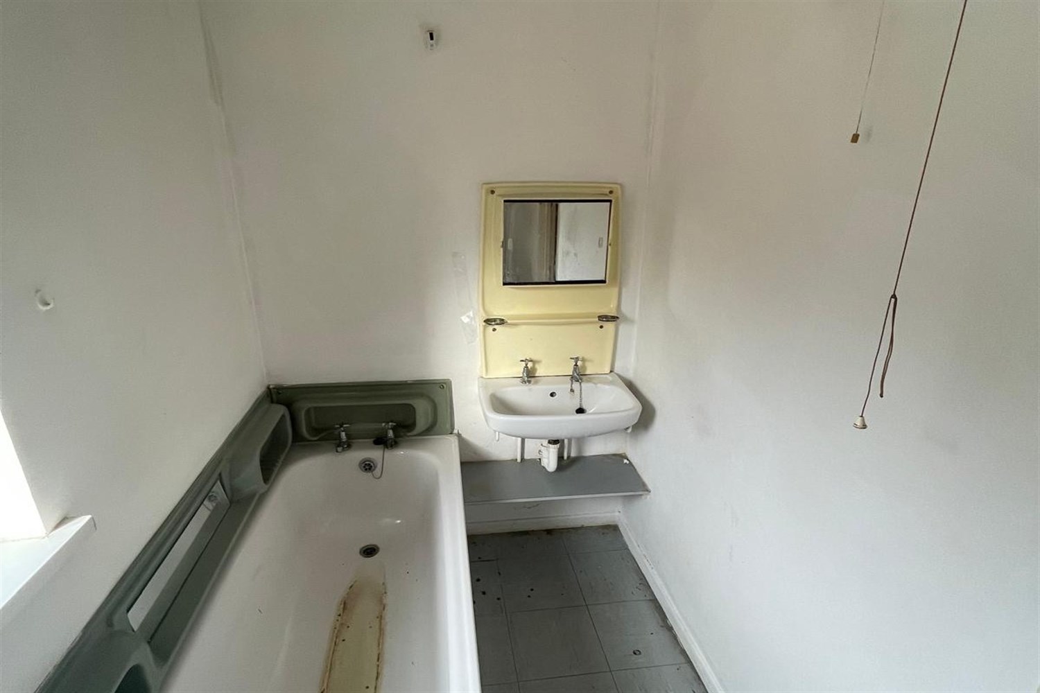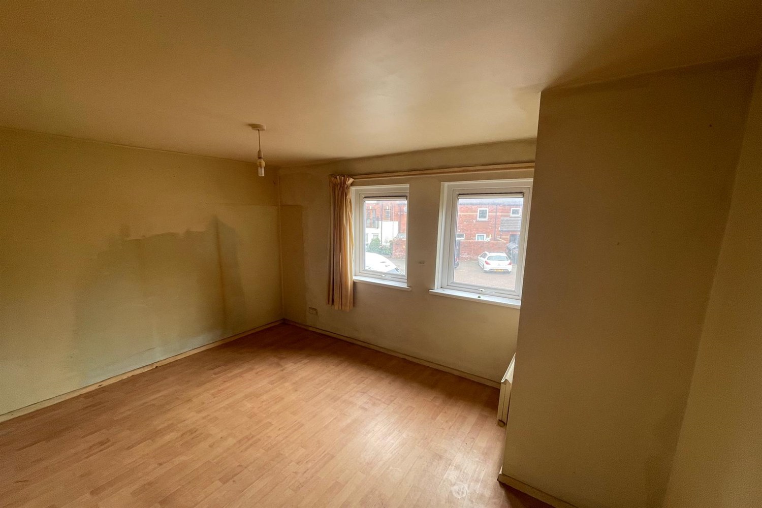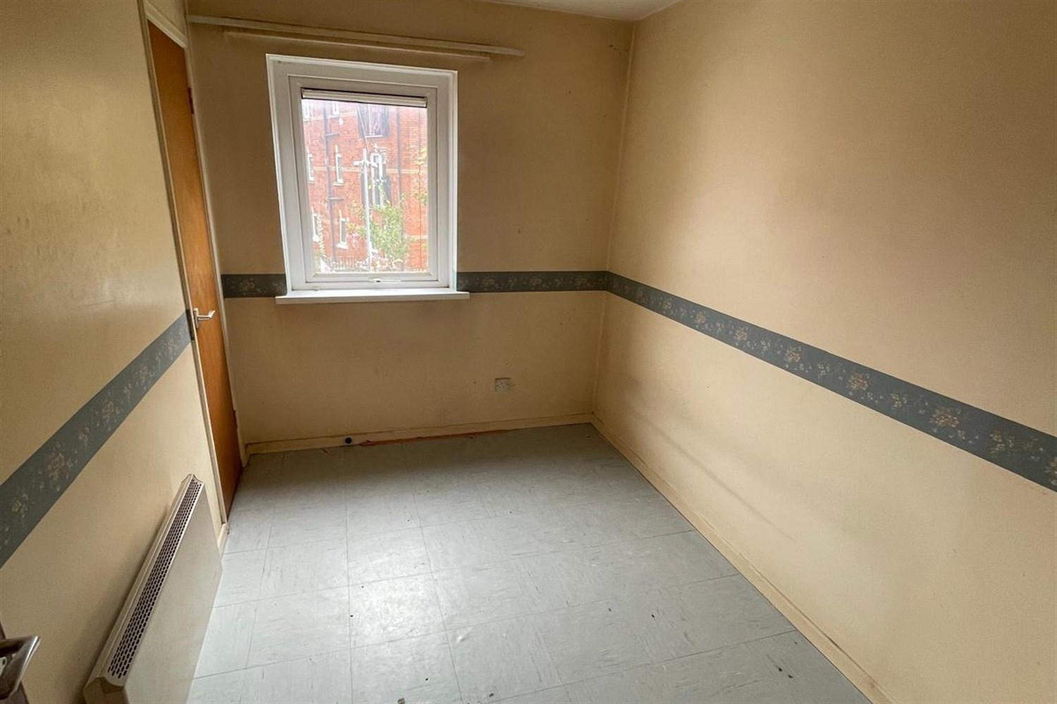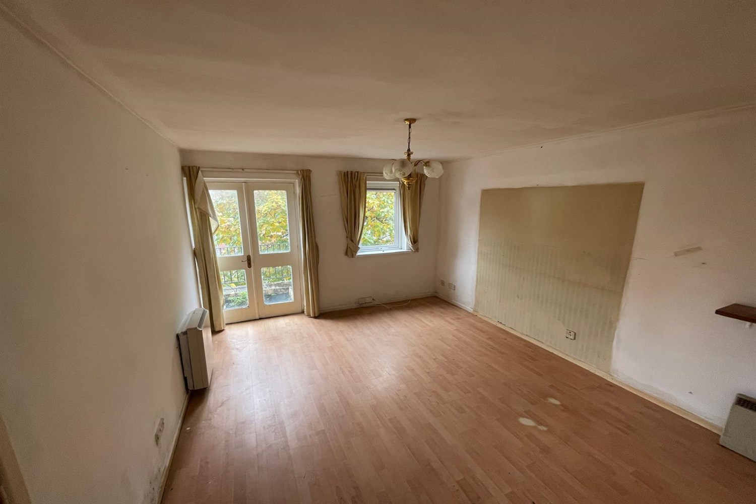 Laminate timber flooring, storage heater, single glazed door to balcony.