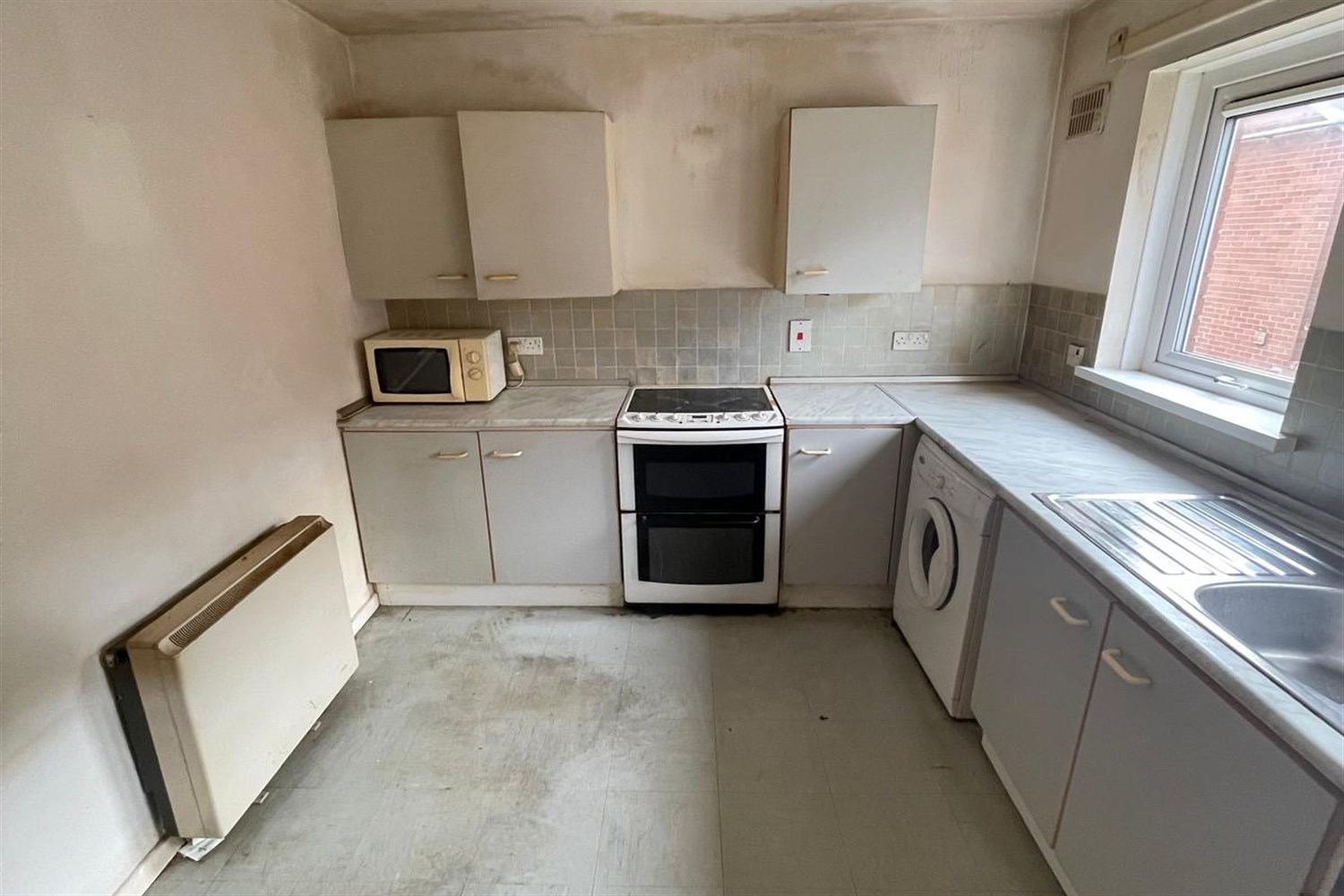 Range of high and low level units, laminated work top, single drainer stainless steel sink unit, plumbed for washing machine, storage cupboard.