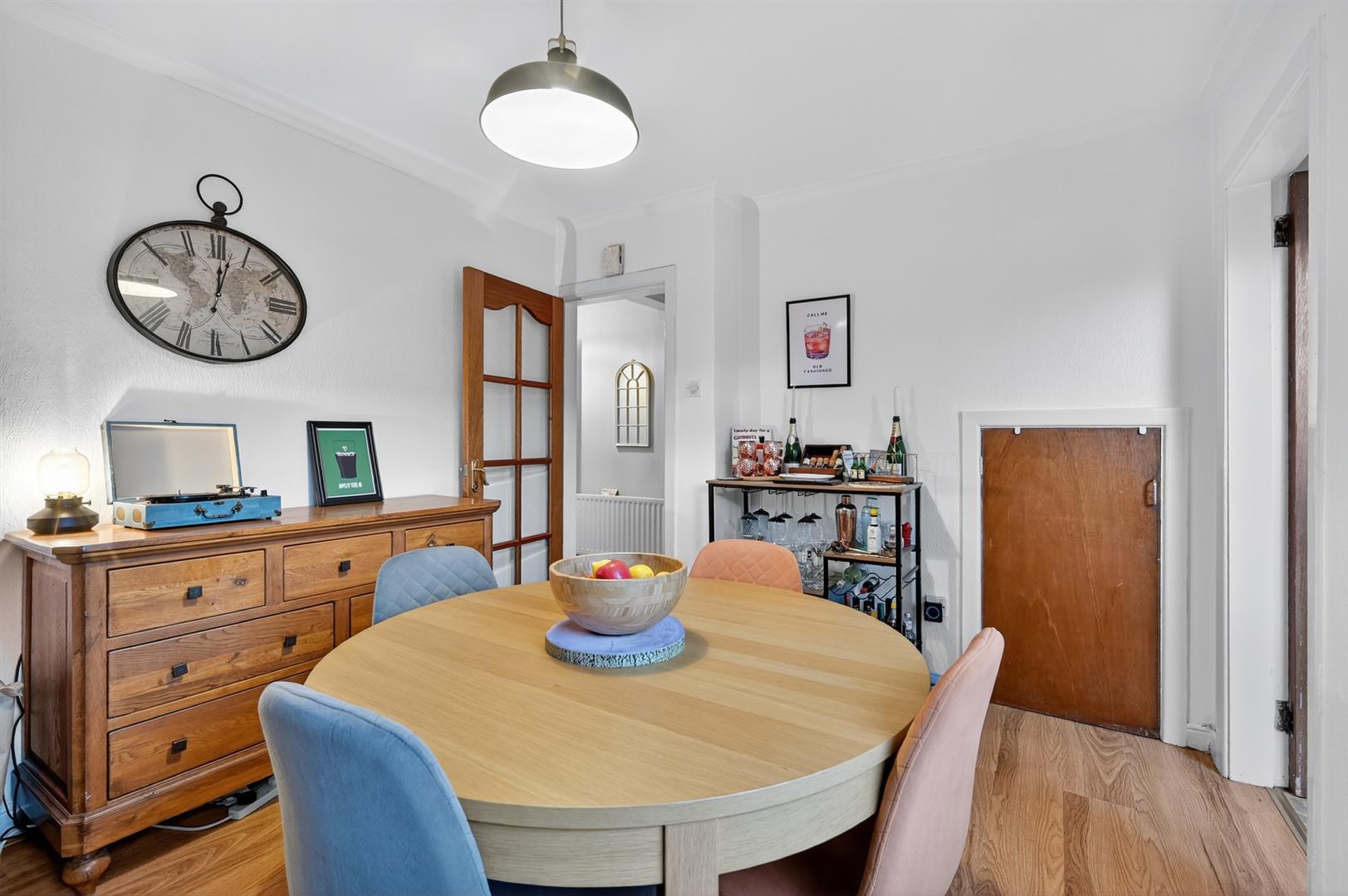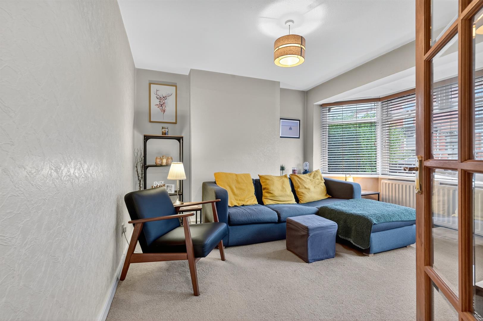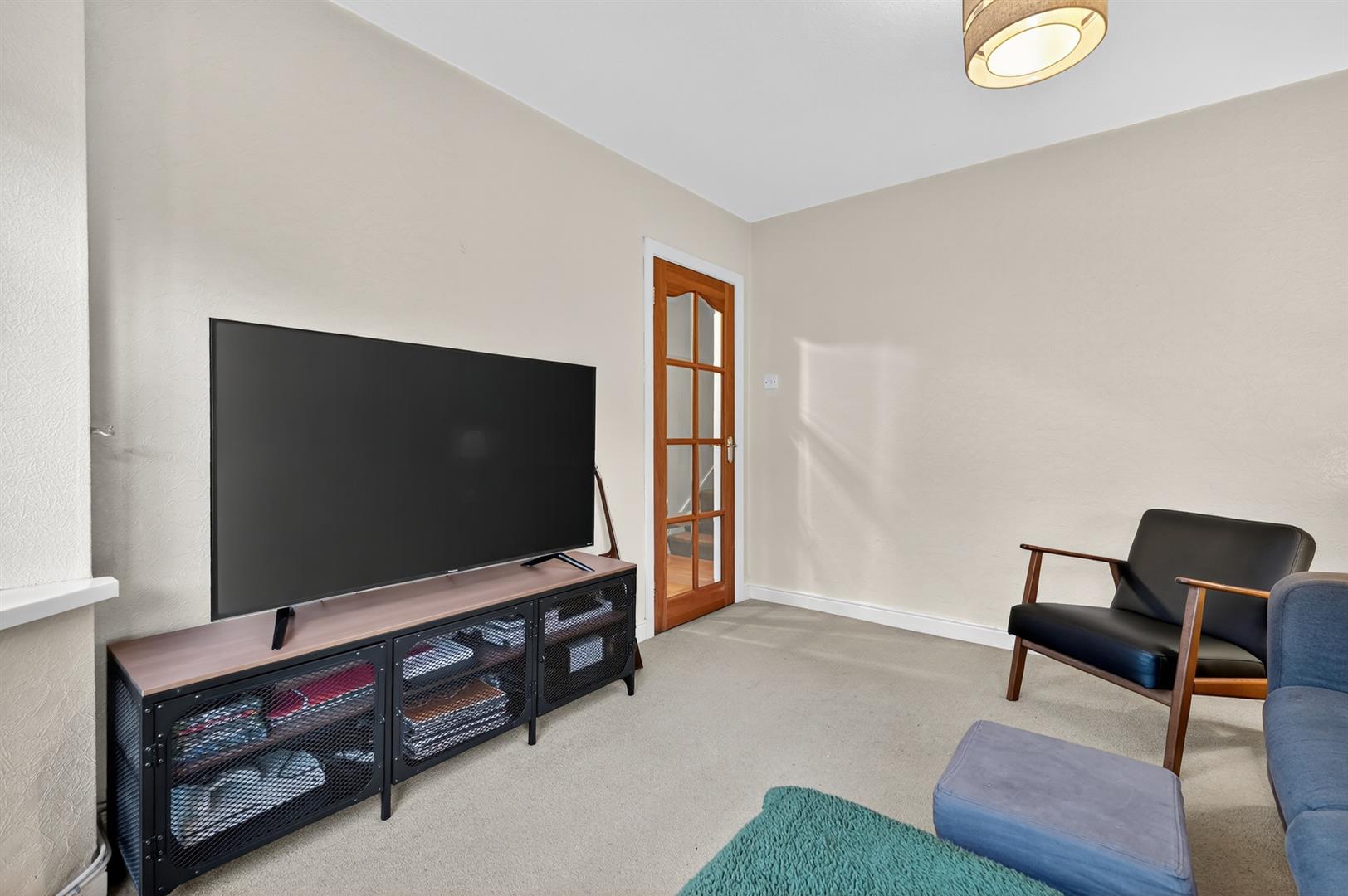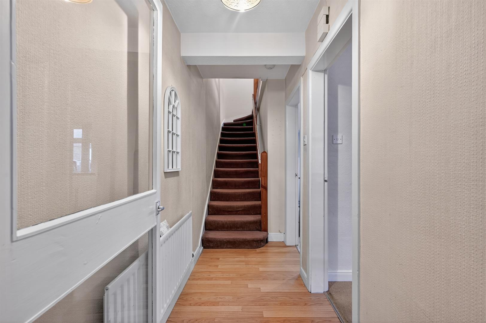 Glass panelled hardwood front door. Laminate wood floor.