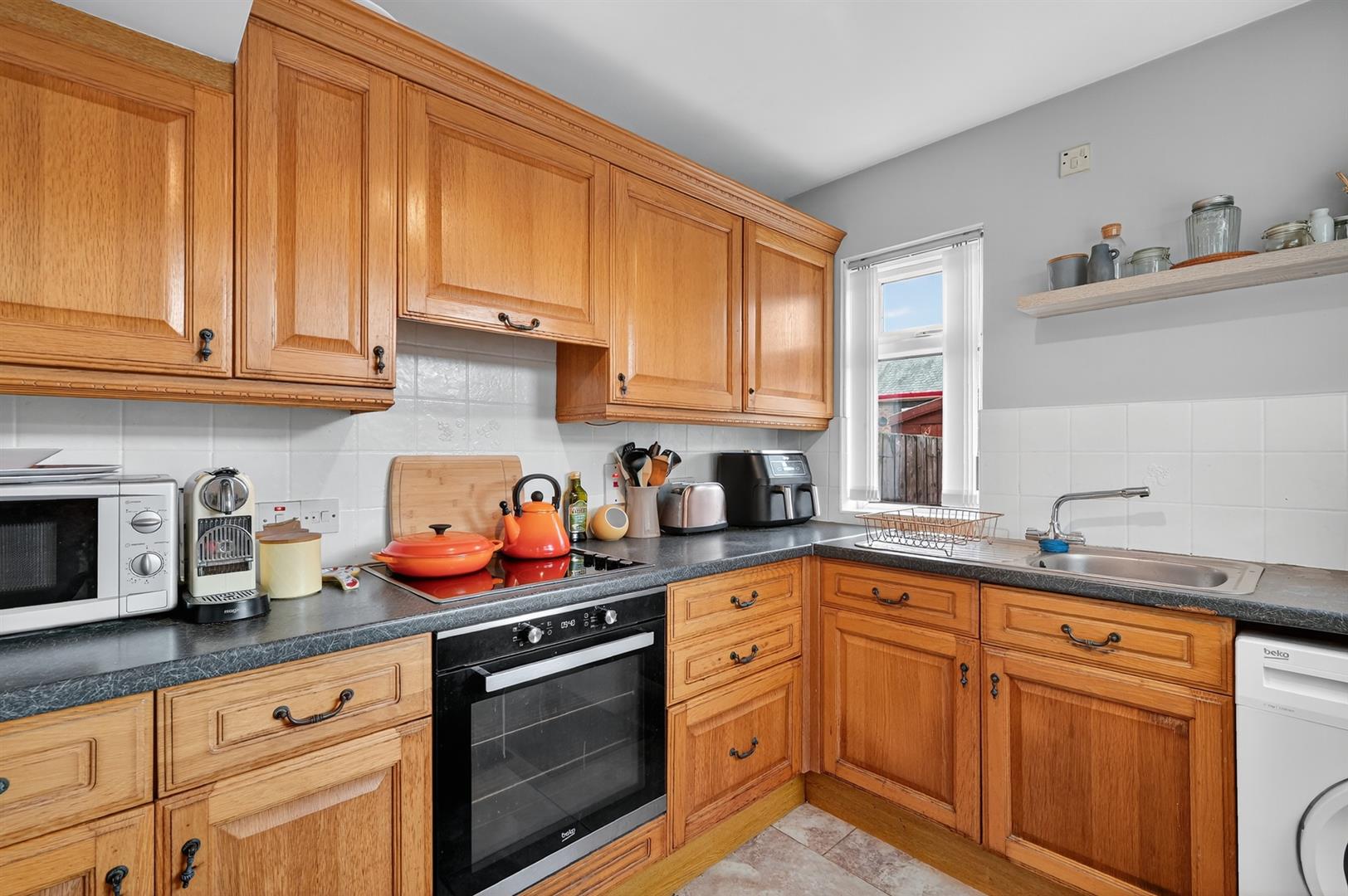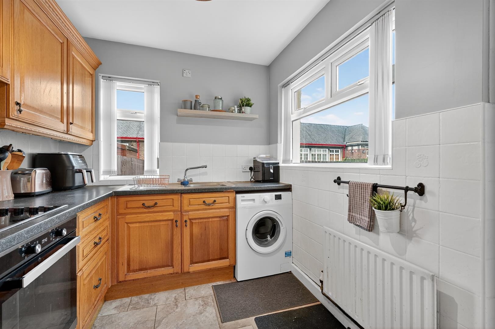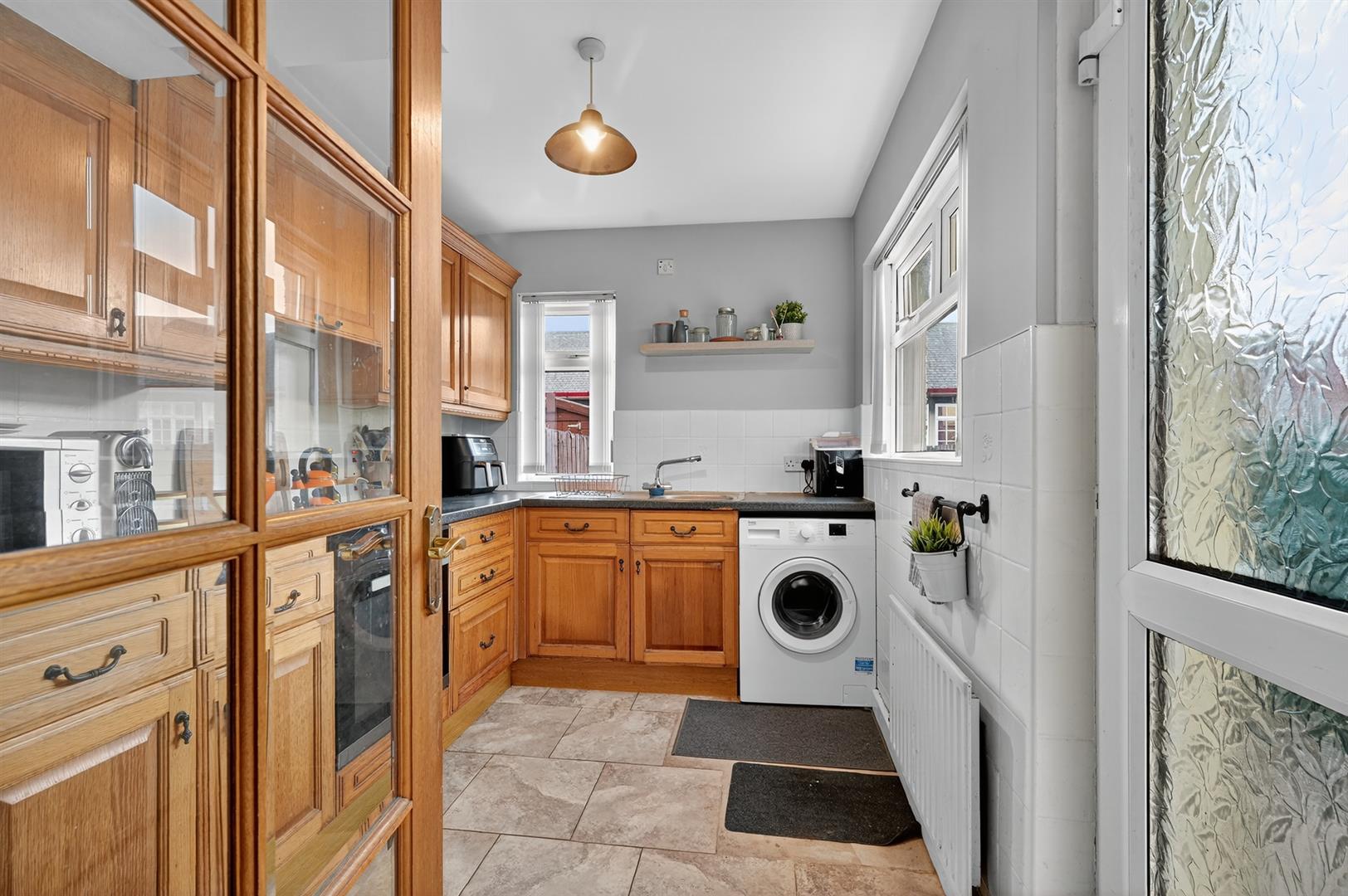High and low level units, plumbed for washing machine, integrated oven, 4 ring hob, extractor fan, single drainer stainless steel sink unit with mixer tap, part tiled walls.