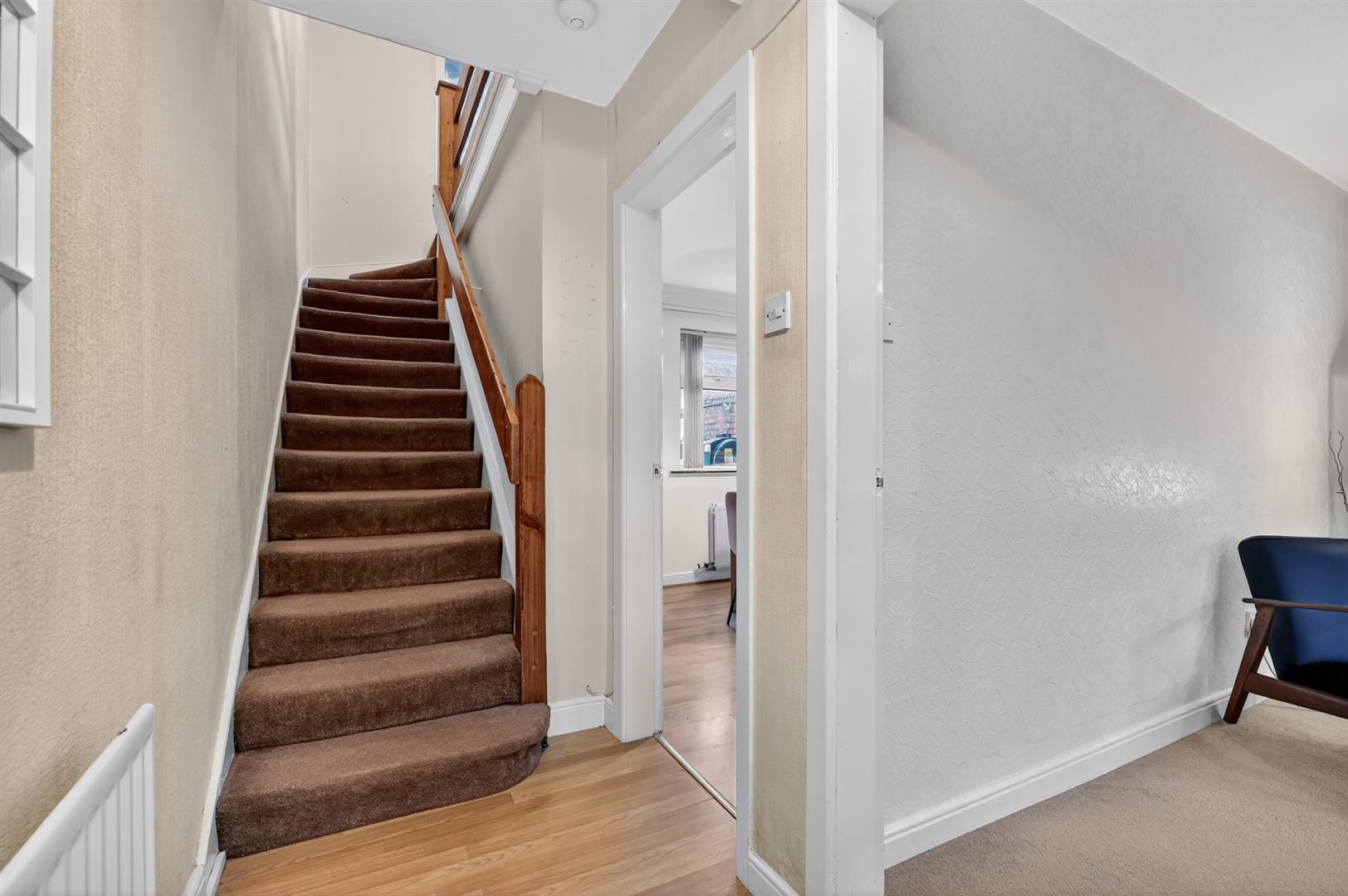 Tiled fireplace with wood surround. Laminate wood floor. Storage under stairs.