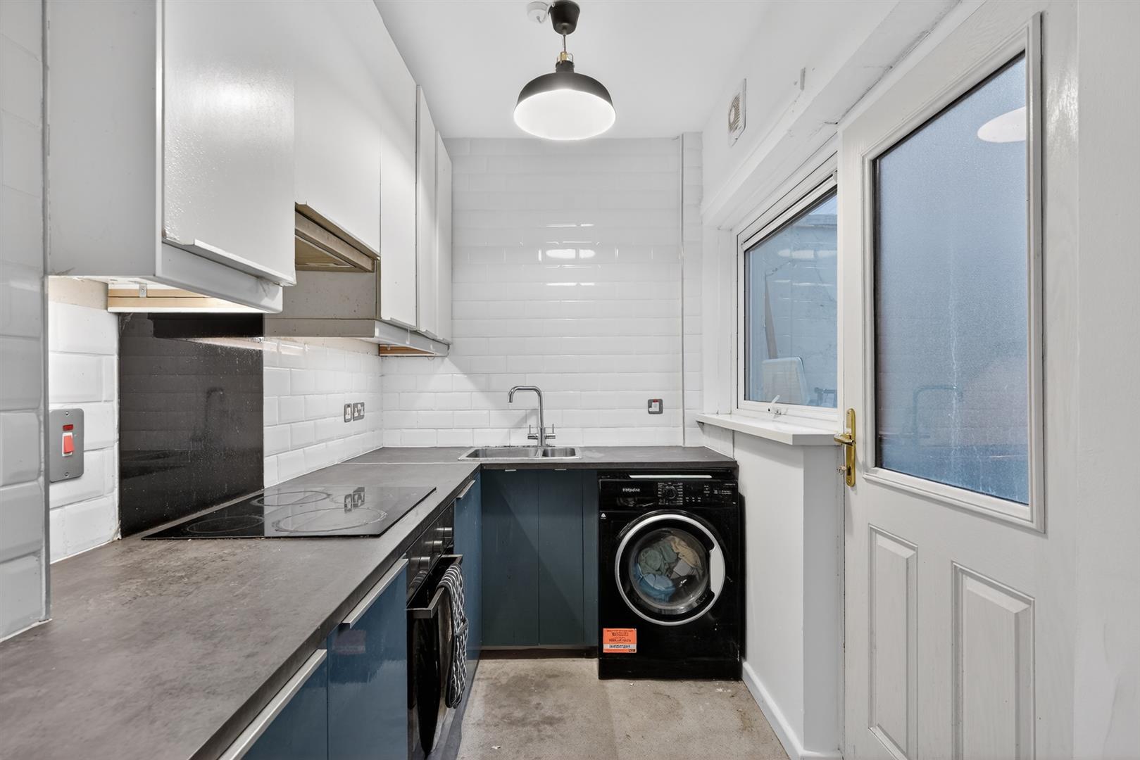 High and low level units, plumbed for washing machine, integrated oven, hob & extractor, stainless steel sink unit. Part tiled walls.