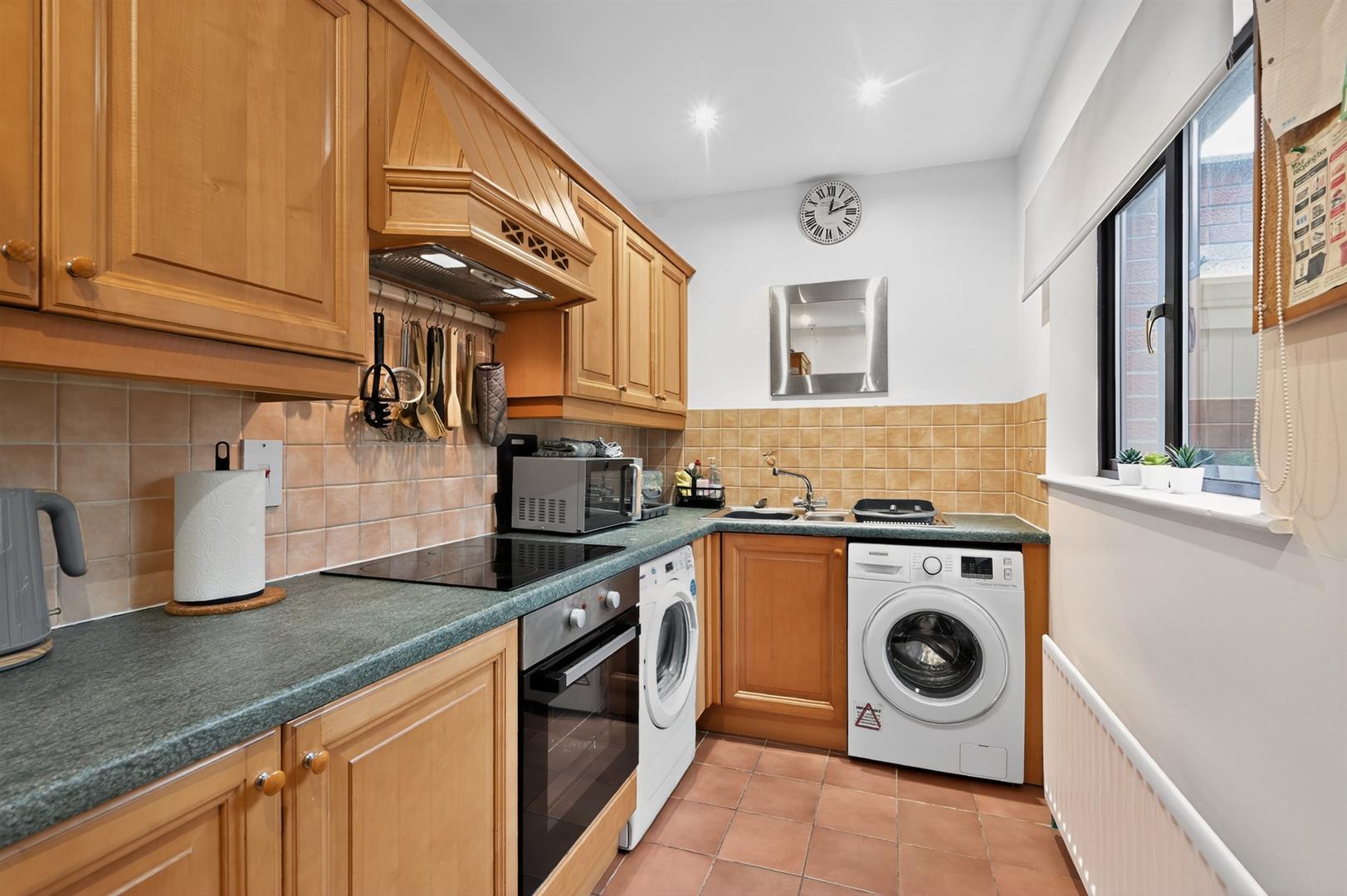 Range of high and low level units, plumbed for washing machine & tumble dryer, integrated oven, 4 ring hob, extractor fan, integrated fridge / freezer, tiled floor, part tiled walls, recessed spotlighting.