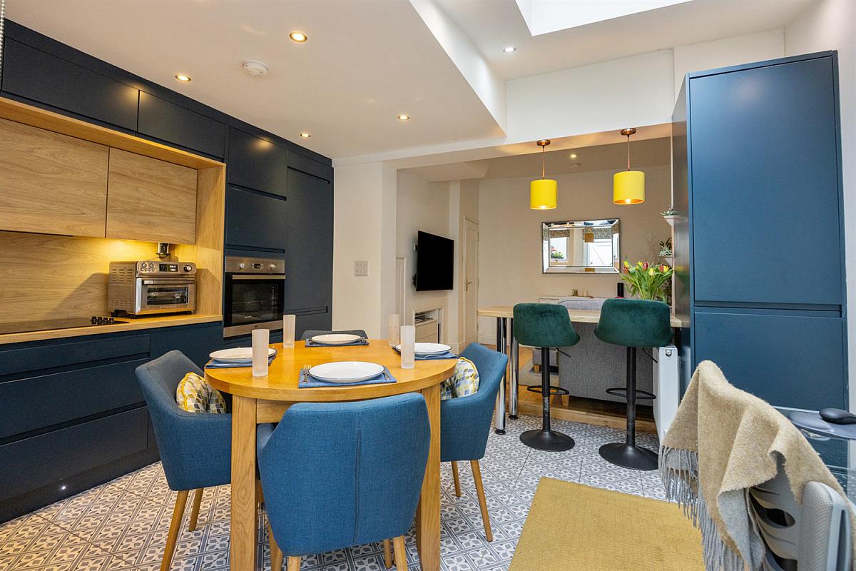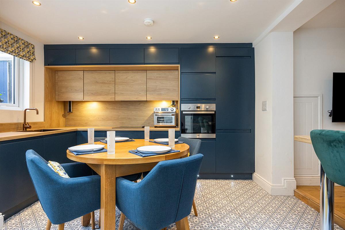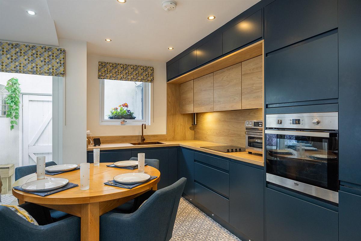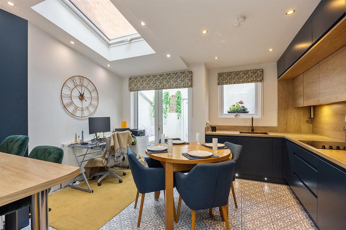 Bespoke `Stori' range of fitted handless units, wooden worktop with matching splashback, under cabinet lighting and concealed pull down power socket `Reginox' copper sink unit and matching copper tap, 4 ring ceramic hob with extractor hood and stainless steel under bench oven, integrated fridge/freezer, full length larder cupboard, fitted breakfast bar, low voltage spotlights, Velux window, feature matching tiled floor, door to decked yard.