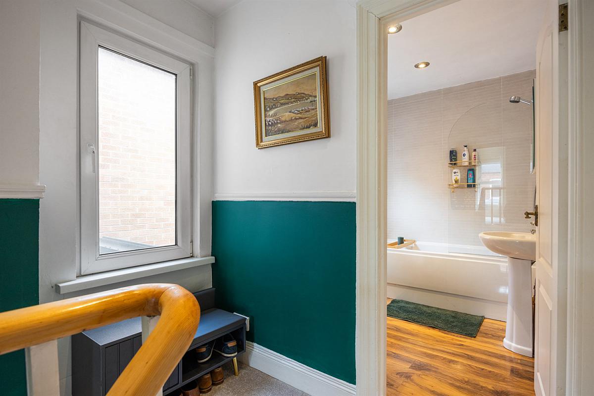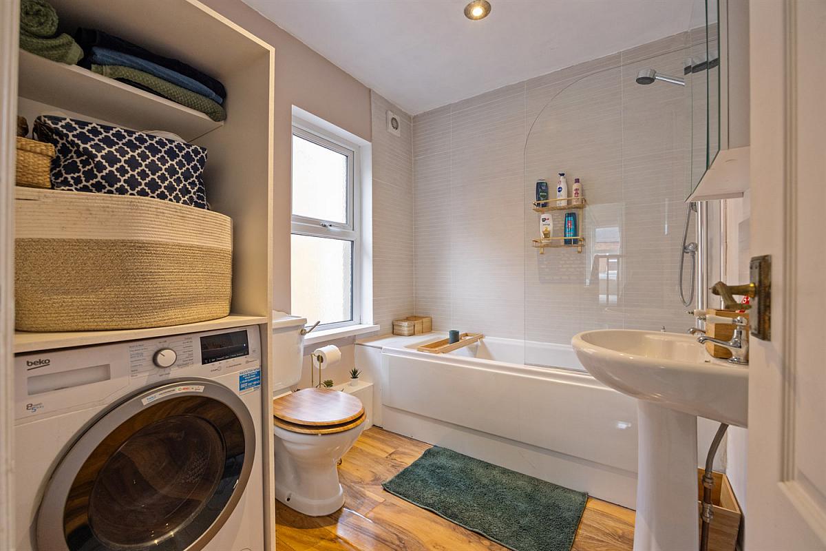 Panelled bath with shower over and shower screen, pedestal wash hand basin with tiled splashback and mirrored cabinet. Low flush W.C, part tiled walls and shelved utility storage - plumbed for washing machine.